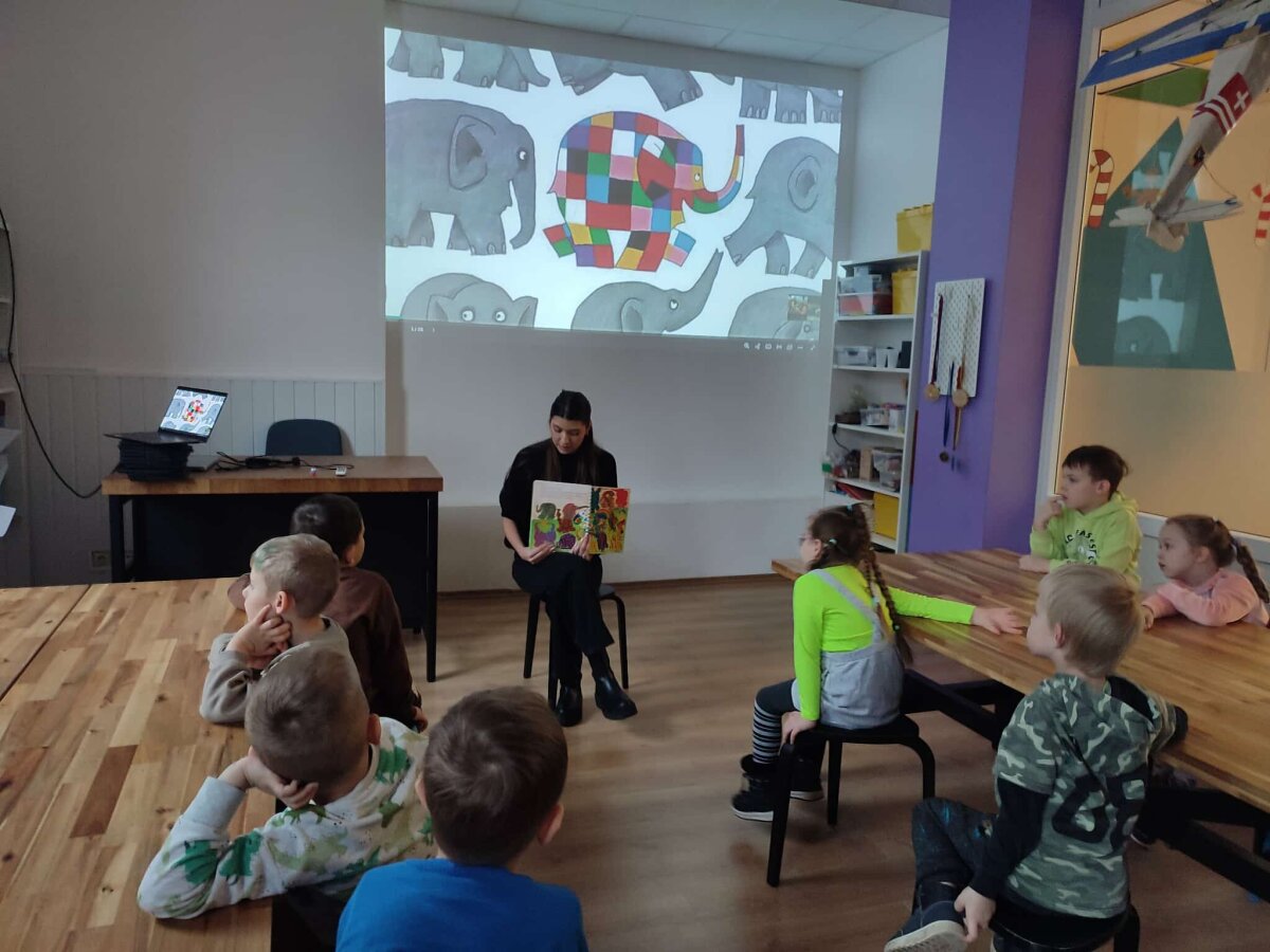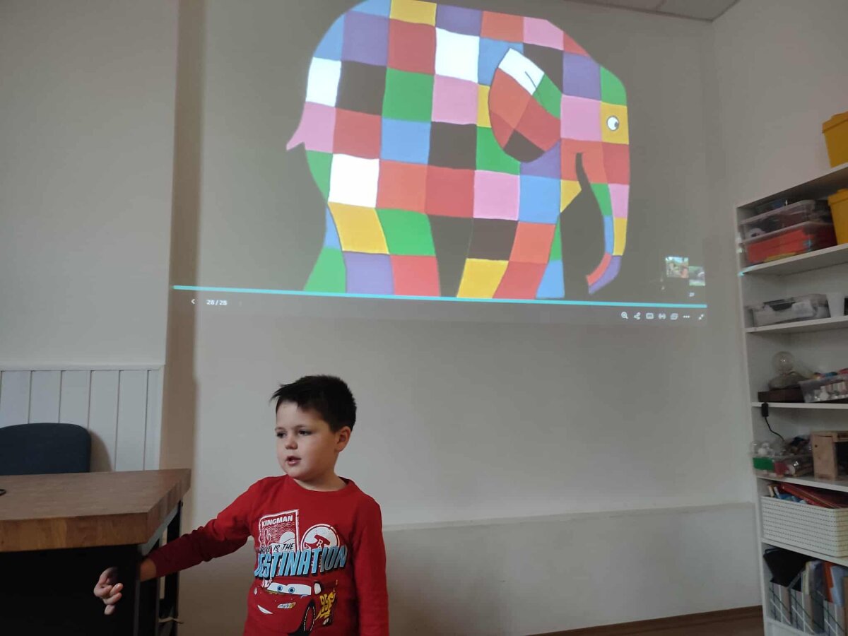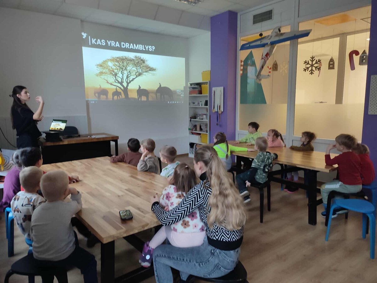 2025 m. gruodžio 1 d. grupės „Riešutėliai“ vaikai kartu su mokytoja Vaida Vaičiuviene, mokinio padėjėja Asta Kliminskiene ir mokytojos padėjėja Erika Šeškevičiene dalyvavo pažintinėje edukacijoje „Draugystė su drambliu“. Edukacijos tikslas – supažindinti vaikus su drambliais, jų rūšimis, išskirtinėmis fiziologinėmis savybėmis bei gyvenimo būdu. Vaikai klausėsi pasakojimo apie spalvotąjį dramblį Elmerį – personažą, skatinantį priimti savo unikalumą ir drąsiai būti savimi. Vėliau jie analizavo Afrikos ir Azijos dramblių skirtumus, aptarė straublio, ausų ir kitų kūno dalių reikšmę, samprotavo apie gyvūnų prisitaikymą gamtoje. Praktinėje veiklos dalyje, naudodami „Elmer’s Photo Patchwork“ programėlę, vaikai kūrė savo individualius drambliukus, rinkdamiesi spalvas bei raštus. Ši veikla skatino kūrybiškumą, tyrinėjimą ir saviraišką, o kartu padėjo įtvirtinti įgytas žinias.