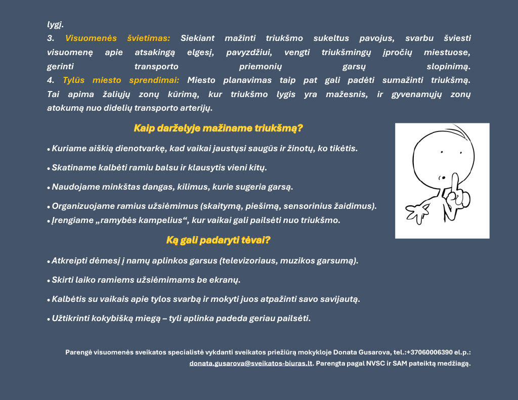 Triukšmas – tai ne tik nemalonus foninis reiškinys, bet ir reikšmingas aplinkos veiksnys, galintis turėti tiesioginį poveikį vaikų sveikatai bei vystymuisi. Šiuolaikinėje visuomenėje vaikai vis dažniau susiduria su nuolatiniu triukšmu – nuo intensyvaus transporto, mokyklos aplinkos iki įvairių technologinių įrenginių skleidžiamų garsų. Tyrimai rodo, kad ilgalaikis triukšmo poveikis gali neigiamai veikti vaikų klausą, miego kokybę, dėmesio koncentraciją ir net emocinę būklę.