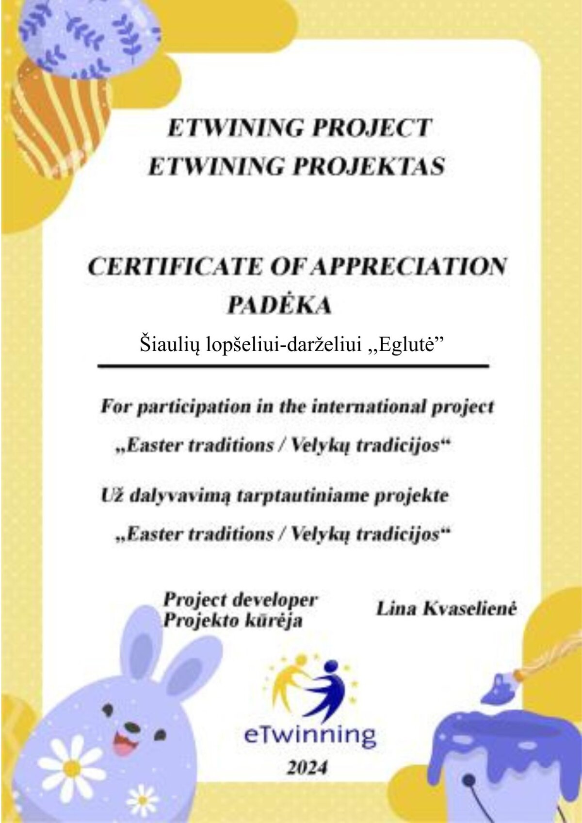 Projektas „Easter Traditions“ subūrė dvi mūsų įstaigos grupes – „Kiškučiai“ ir „Riešutėliai“ – tam, kad vaikai kūrybiškai ir prasmingai susipažintų su Velykų tradicijomis bei pavasario atgimimu. Velykos yra viena ryškiausių pavasario švenčių, simbolizuojanti gamtos pabudimą ir naują pradžią, todėl jos papročiai ir jų puoselėjimas turi ypatingos reikšmės vaikų ugdymui. Projekto metu vaikai gamino įvairias dekoracijas, puošė grupių erdves, atliko kūrybines, kurių metu tyrinėjo pavasario gamtą, spalvas, medžiagas, formas.