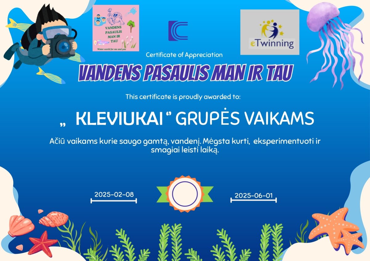2025 m. vasario - gegužės mėnesį grupių „Kleviukai“ ir „Ežiukai“ vaikai kartu su mokytojomis aktyviai dalyvavo tarptautiniame eTwinning projekte „Vandens pasaulis man ir tau“, kuris sujungė dalyvius iš Lietuvos, Italijos, Kroatijos, Latvijos ir Slovėnijos.