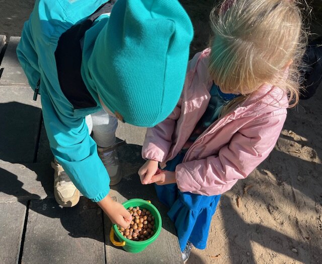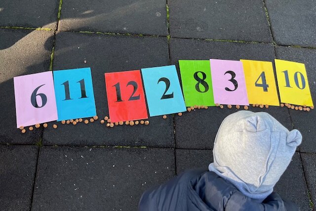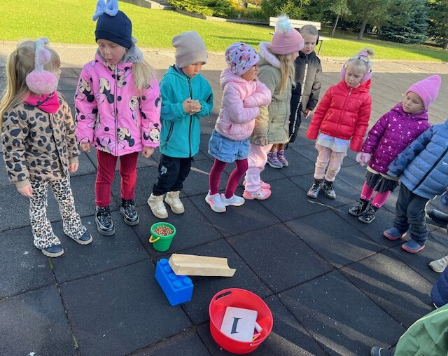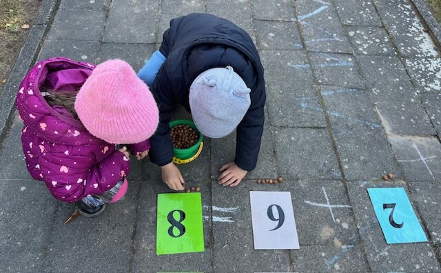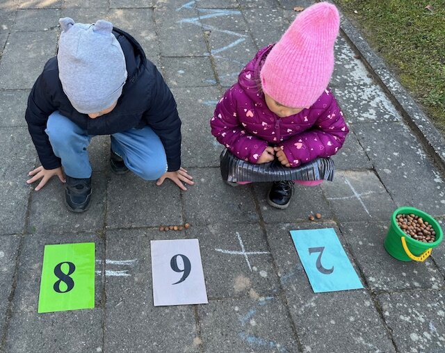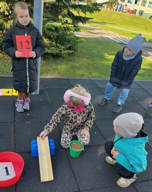 Vaikai skaičiavo riešutus, juos grupavo, rideno loveliu, dėliojo prie draugo išrinktos skaitmens kortelės – taip plėtojo matematinio sumanumo įgūdžius. Dėliodami riešutus prie pasirinktų skaitmenų, susipažino su sudėties (+) ir lygybės (=) ženklais, mokėsi atlikti nesudėtingus matematinius veiksmus. Ant grindinio, brėždami sudėties ženklus kreida, skaičiavo ir grupavo riešutus pagal skaitmens reikšmę.