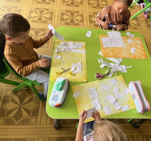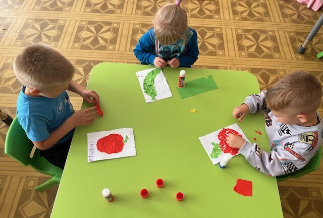 Meninėje veikloje vaikai taikė plėšytinės aplikacijos techniką – kūrė vaisių ir daržovių vaizdus, karpė paveikslėlių dalis, dėliojo dėliones, klijavo ant popieriaus, spalvino tinkamomis spalvomis ir įvardijo pavadinimus.