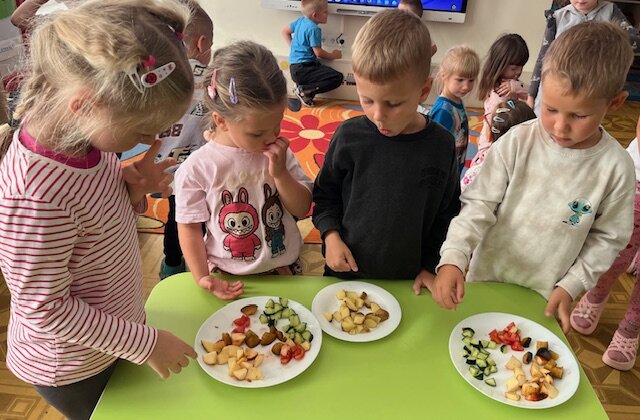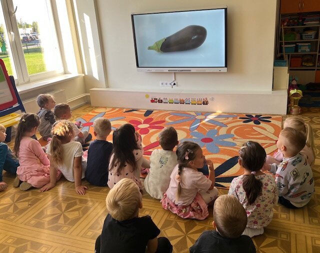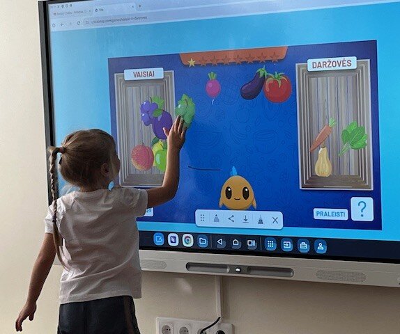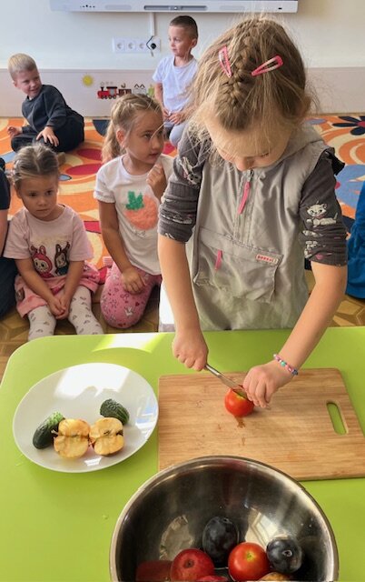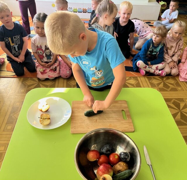 Supjaustytus vaisius ir daržoves vaikai sudėjo į lėkštes, ragavo, aptarė jų skonį ir kvapą. Siekdami įtvirtinti žinias apie sveiką mitybą, vaisius ir daržoves, žaidė interaktyvų edukacinį žaidimą SMART ekrane – programėlėje „CickiMap. Vaisiai ir daržovės“: „skirstė“ vaisius ir daržoves į atskirus krepšelius, juos įvardijo.