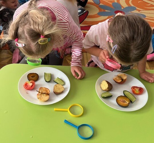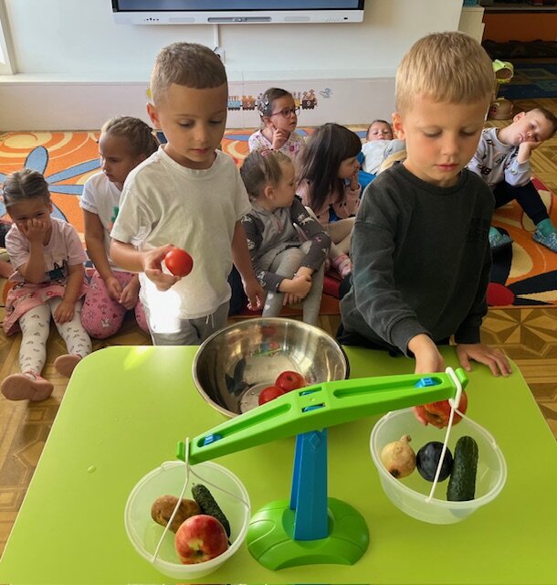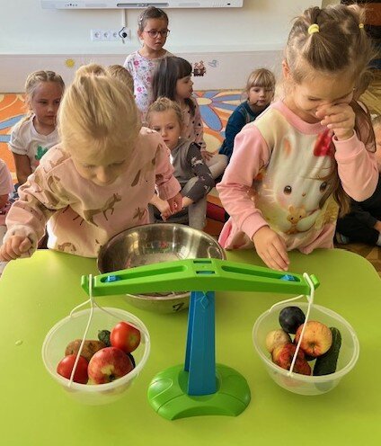 Ugdydami kritinį mąstymą, vaikai sprendė užduotį: kiek vaisių ar daržovių reikia, kad abiejų svarstyklių lėkštutės būtų vienodo svorio? Tirdami daržo gėrybių savybes, pjaustė obuolius, agurkus, pomidorus, slyvas, svogūnus, bulves, padidinamuoju stiklu apžiūrėjo jų sėklas, lygino sėklų panašumus ir skirtumus, prisiminė, kad pasodinus sėklas ir laistant, užauga nauji augalai.