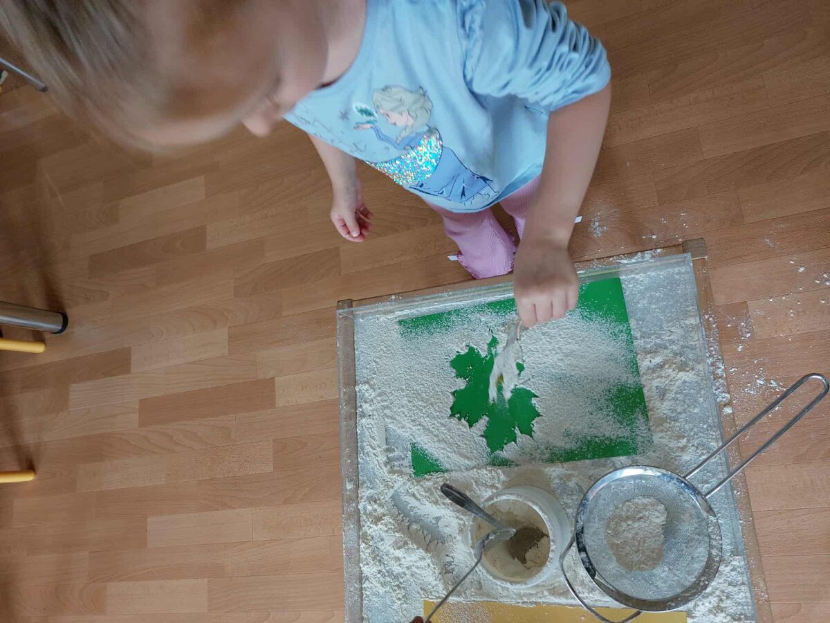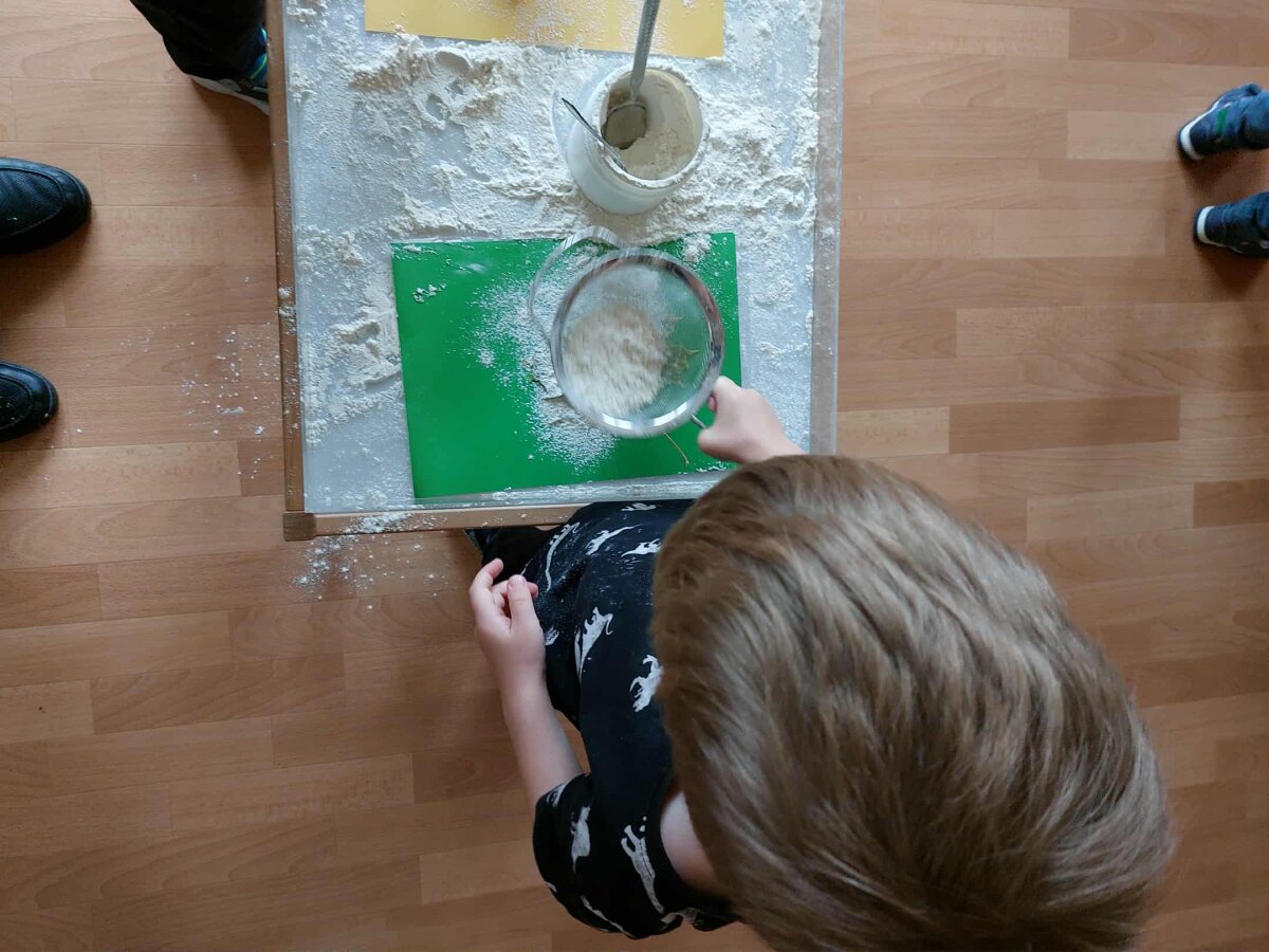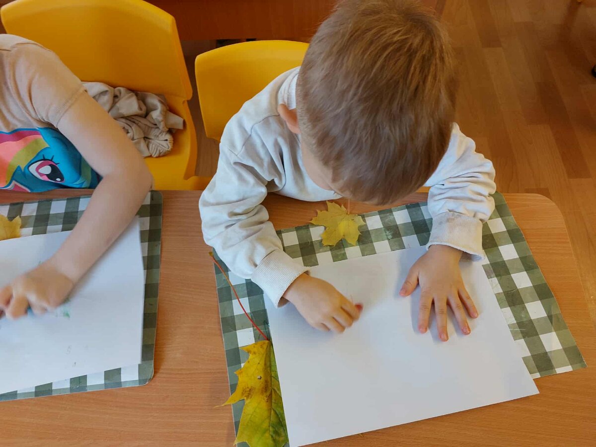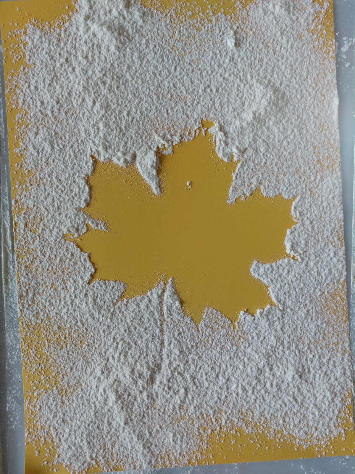 Vaikai išbandė ir eksperimentą – uždėję medžio lapą ant spalvoto popieriaus, jį apibarstė miltais ir atsargiai atkėlę, pamatė, kaip gražiai atsiskleidžia lapų kontūrai.