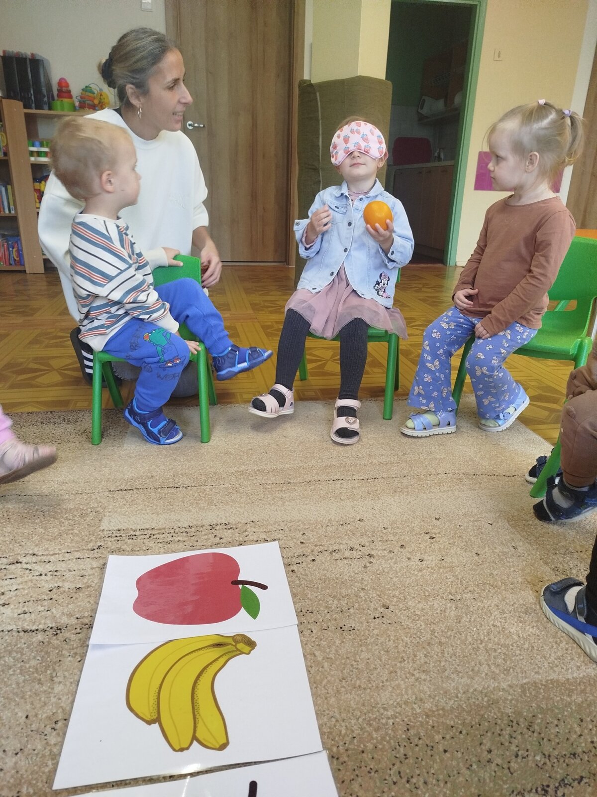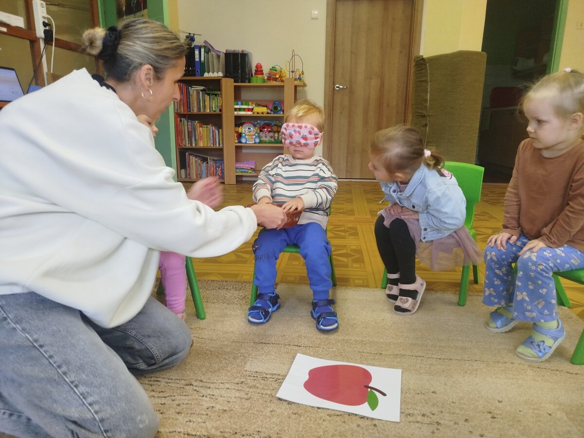 Žaisdami sensorinį žaidimą „Vaisių detektyvai“ mažieji užrištomis akimis tyrinėjo obuolius ir kriaušes, bandydami atpažinti jų formą, tekstūrą ir skirtumus