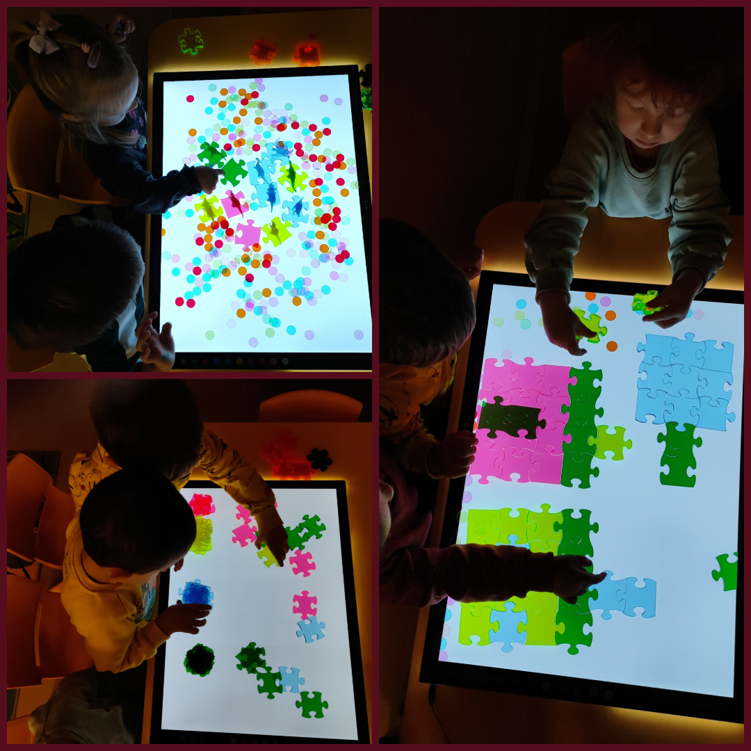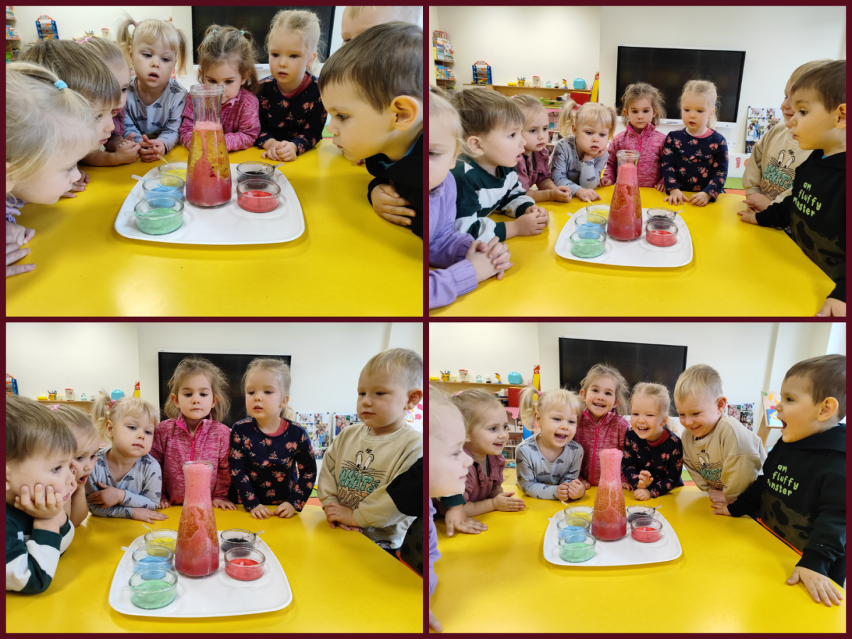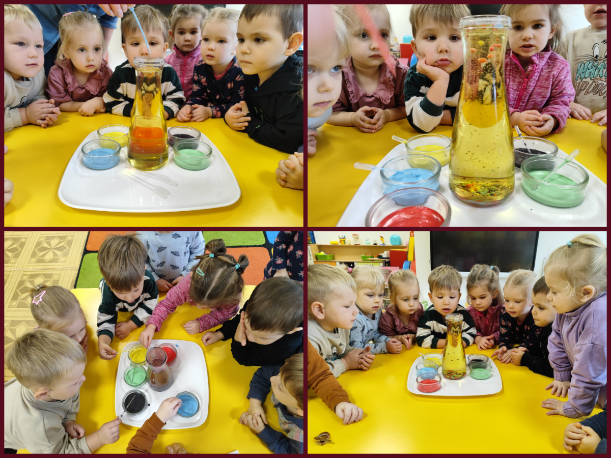 Naudodami šviesos stalą, spalvotus akrilinius skrituliukus, geometrines formas ir akrilinių gyvūnėlių rinkinius, vaikai kūrė „Spalvų labirintus“ bei įvairius vaizdinius, mokydamiesi derinti šviesą ir spalvas. Eksperimentuodami ugdytiniai iš aliejaus ir guašo, maišydami jį su pienu, gamino lavos lempą „Spalvų šokis“ ir stebėjo ugnikalnio išsiveržimą, pasitelkdami šnypščiančias tabletes. Taip pat vaikai atliko ir „Keliaujančio vandens“ eksperimentą – stiklainiuose su spalvotu vandeniu bei popieriniais rankšluosčiais jie stebėjo, kaip vanduo „keliauja“ iš vieno indo į kitą, maišosi ir kuria naujas spalvas. Ugdytiniai atidžiai sekė procesą, lygino pokyčius ir džiaugėsi ryškiais spalvų deriniais.