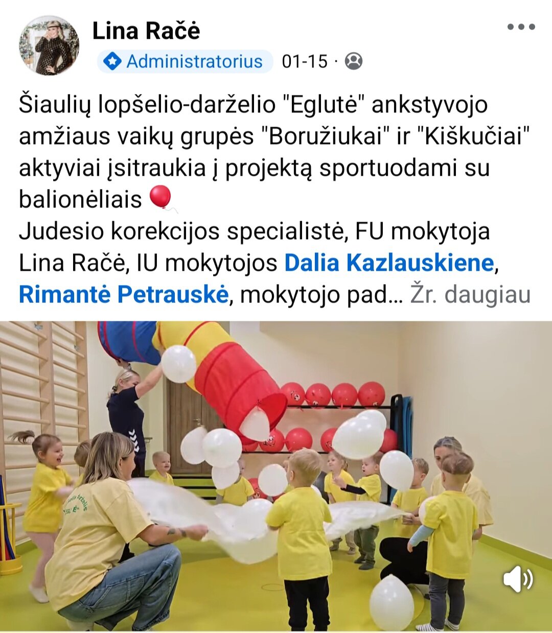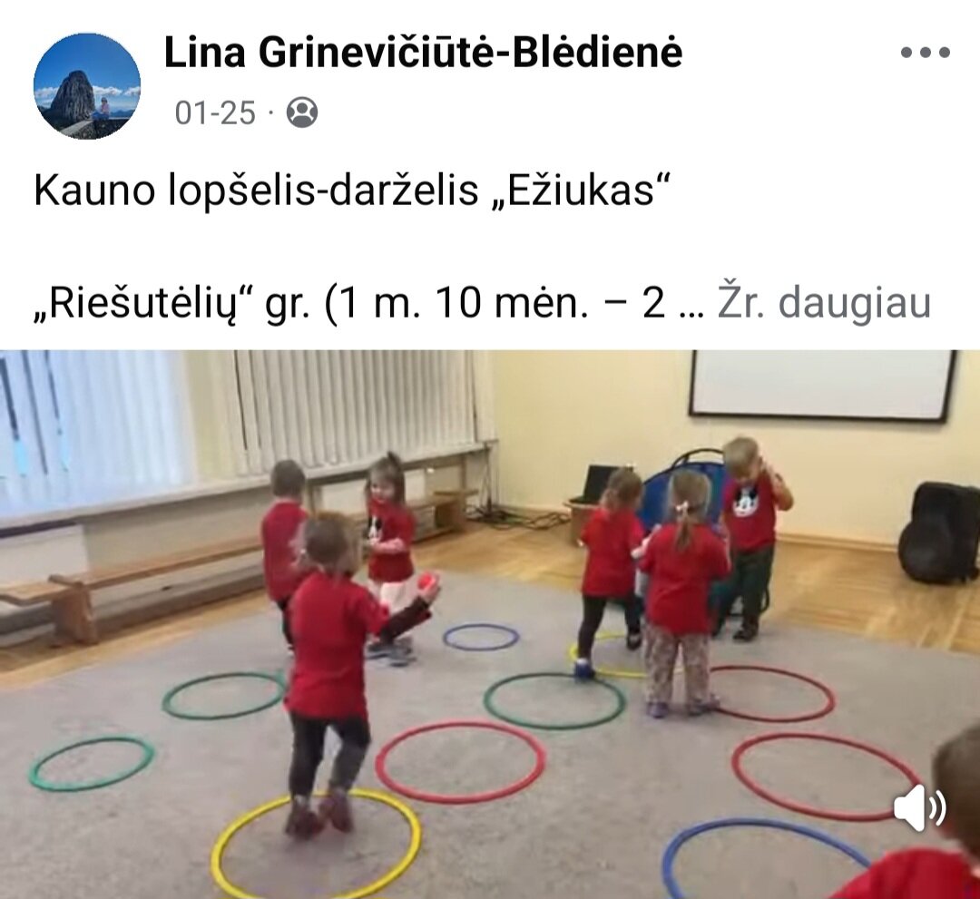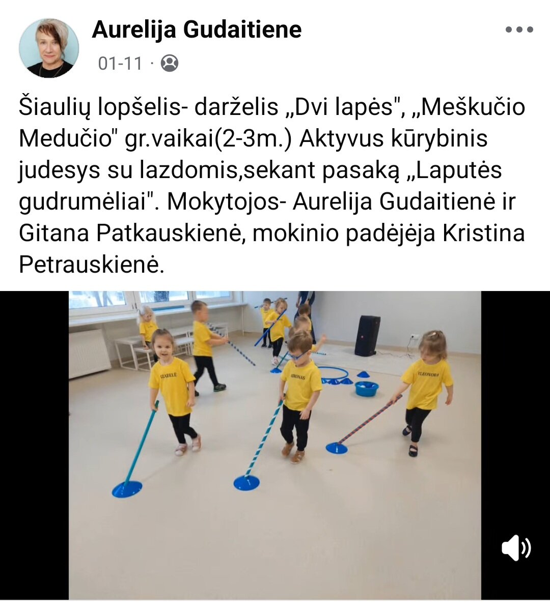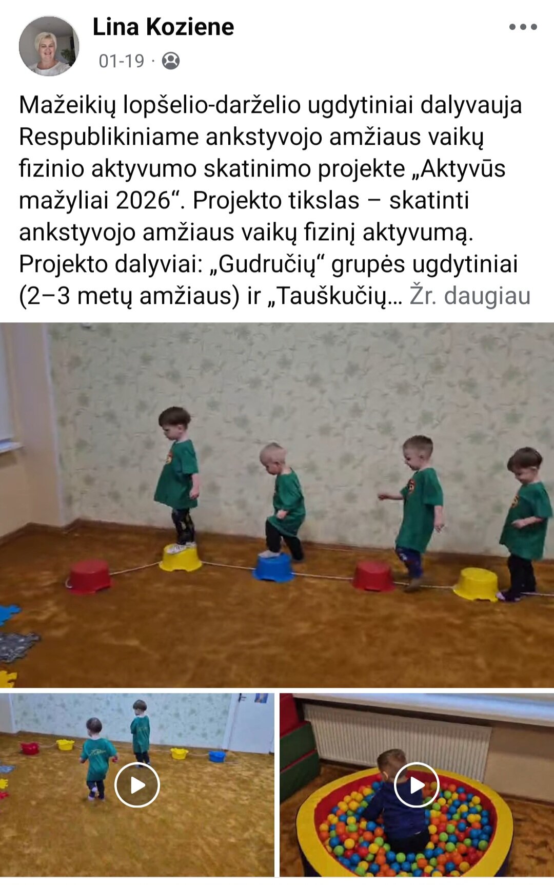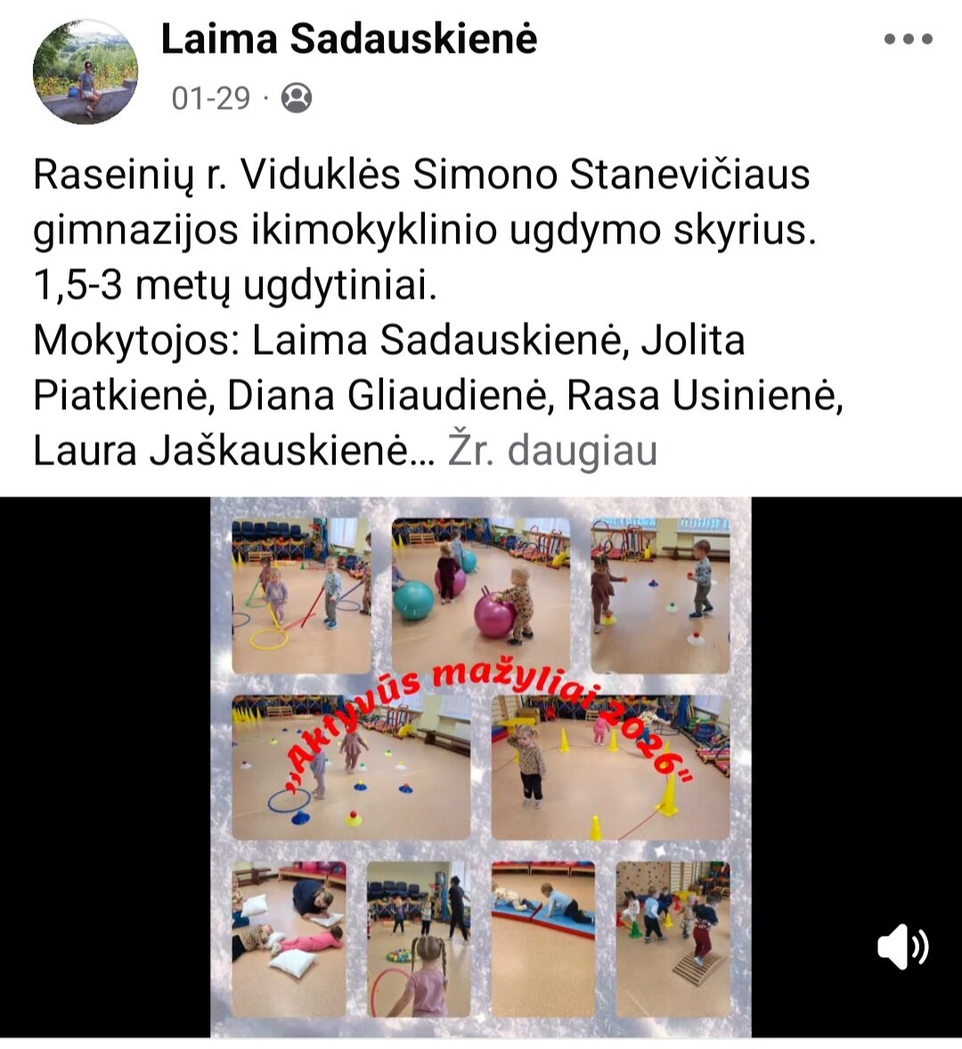 Sausio 12-30 d. judesio korekcijos specialistė, fizinio ugdymo mokytoja Lina Račė organizavo Respublikinį ankstyvojo amžiaus vaikų fizinį aktyvumą skatinantį projektą „Aktyvūs mažyliai 2026“. Projekto tikslas: pasidalinti ankstyvojo amžiaus vaikų fizinio aktyvumo skatinimo žaidimų, pratimų, veiklų idėjomis grupės, sporto salės, muzikos salės, lauko ar kitose erdvėse. Projektas sulaukė didžiulio šalies mokytojų susidomėjimo ir aktyvaus dalyvavimo. Į projektą įsitraukė daugiau nei 130 pedagogų iš visos Lietuvos ikimokyklinio ugdymo įstaigų. Gerąja darbo patirtimi ir kūrybinėmis ankstyvojo amžiaus fizinio aktyvumo veiklų idėjomis dalyviai dalinosi uždaroje Facebook grupėje „Aktyvūs mažyliai 2026“, kurioje patalpinta net 55 video įrašai. Projekto metu mokytojai ne tik dalinosi gerąja darbo patirtimi, bet ir praplėtė praktines žinias, įgavo naujos kūrybinės patirties, pasisėmė veiklos idėjų iš kitų kolegų.