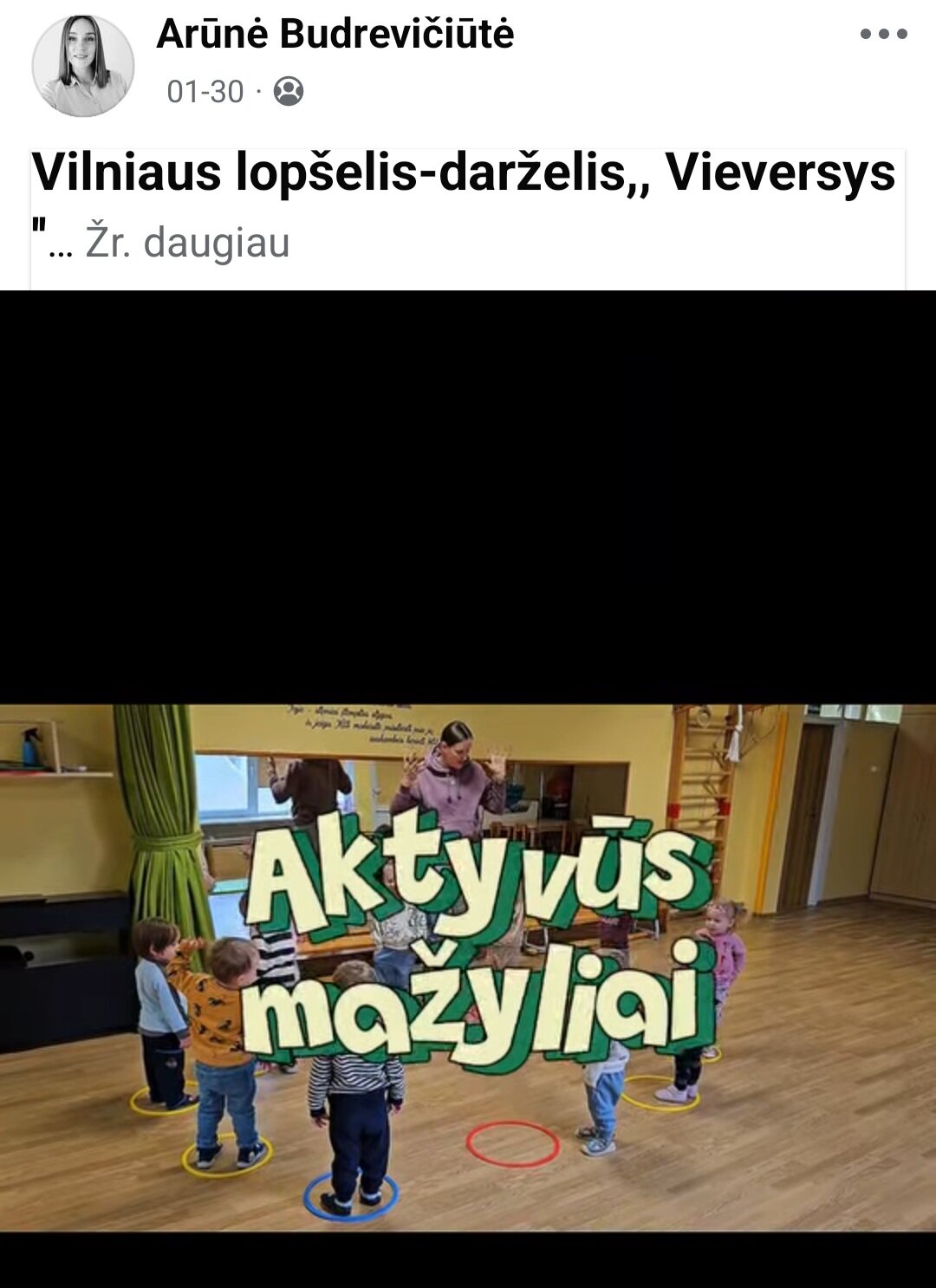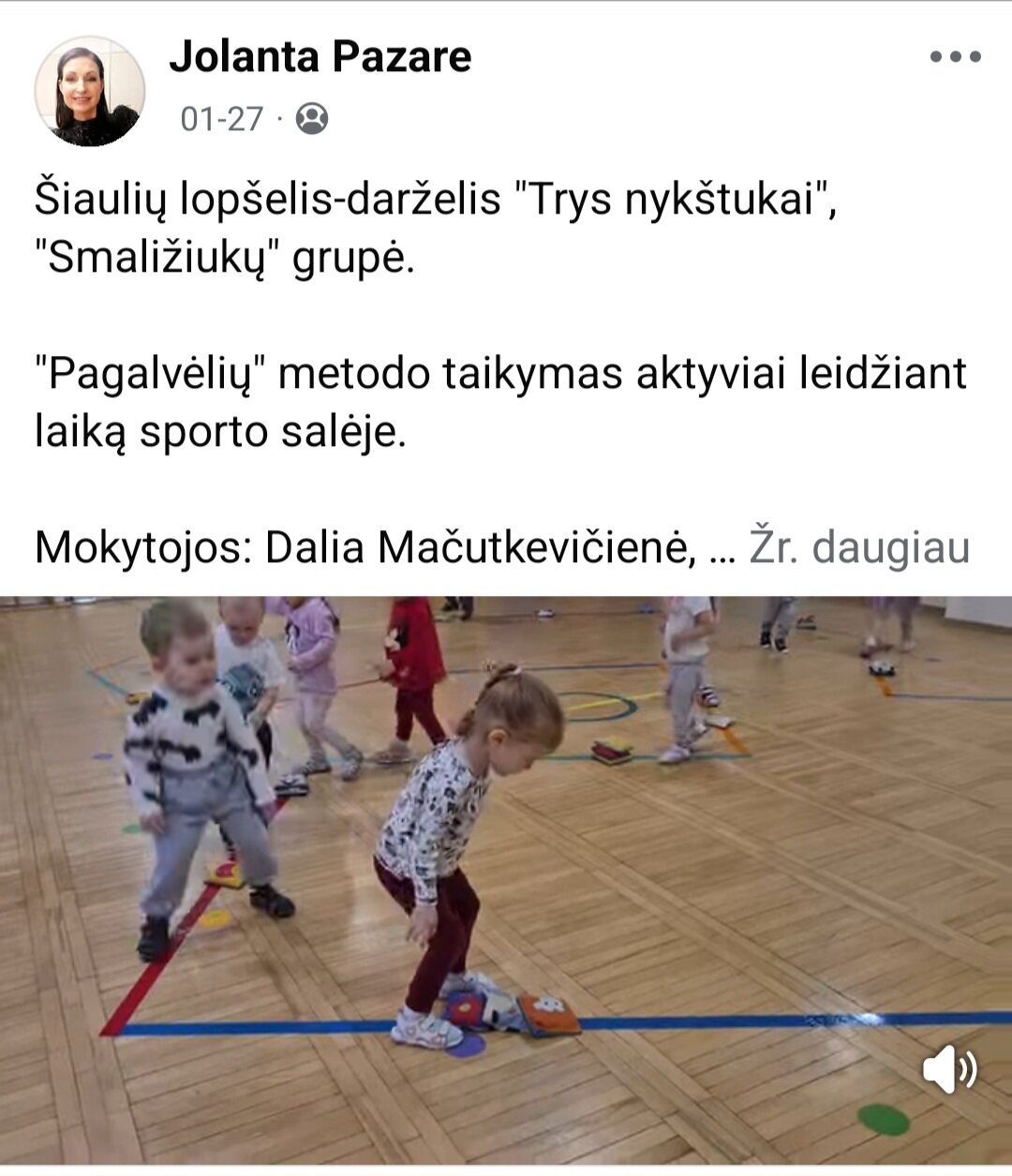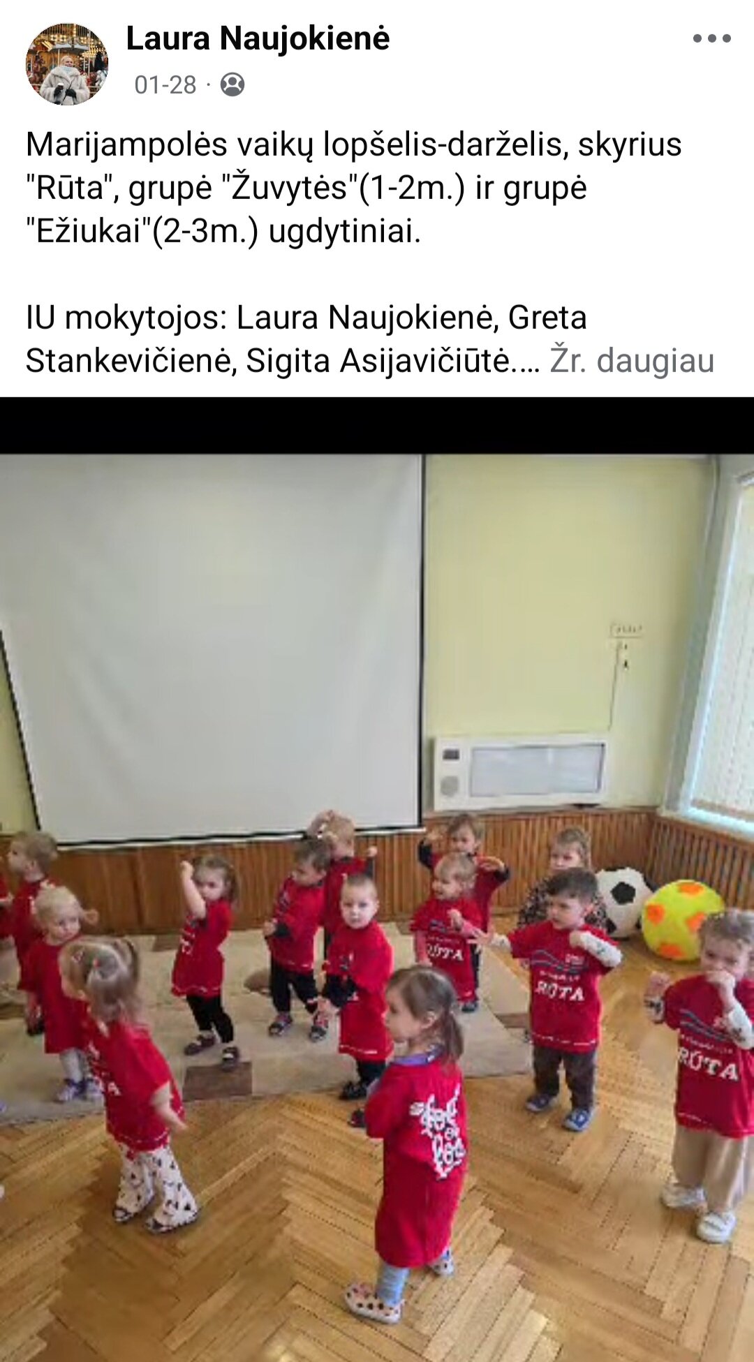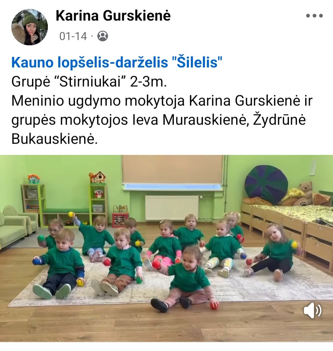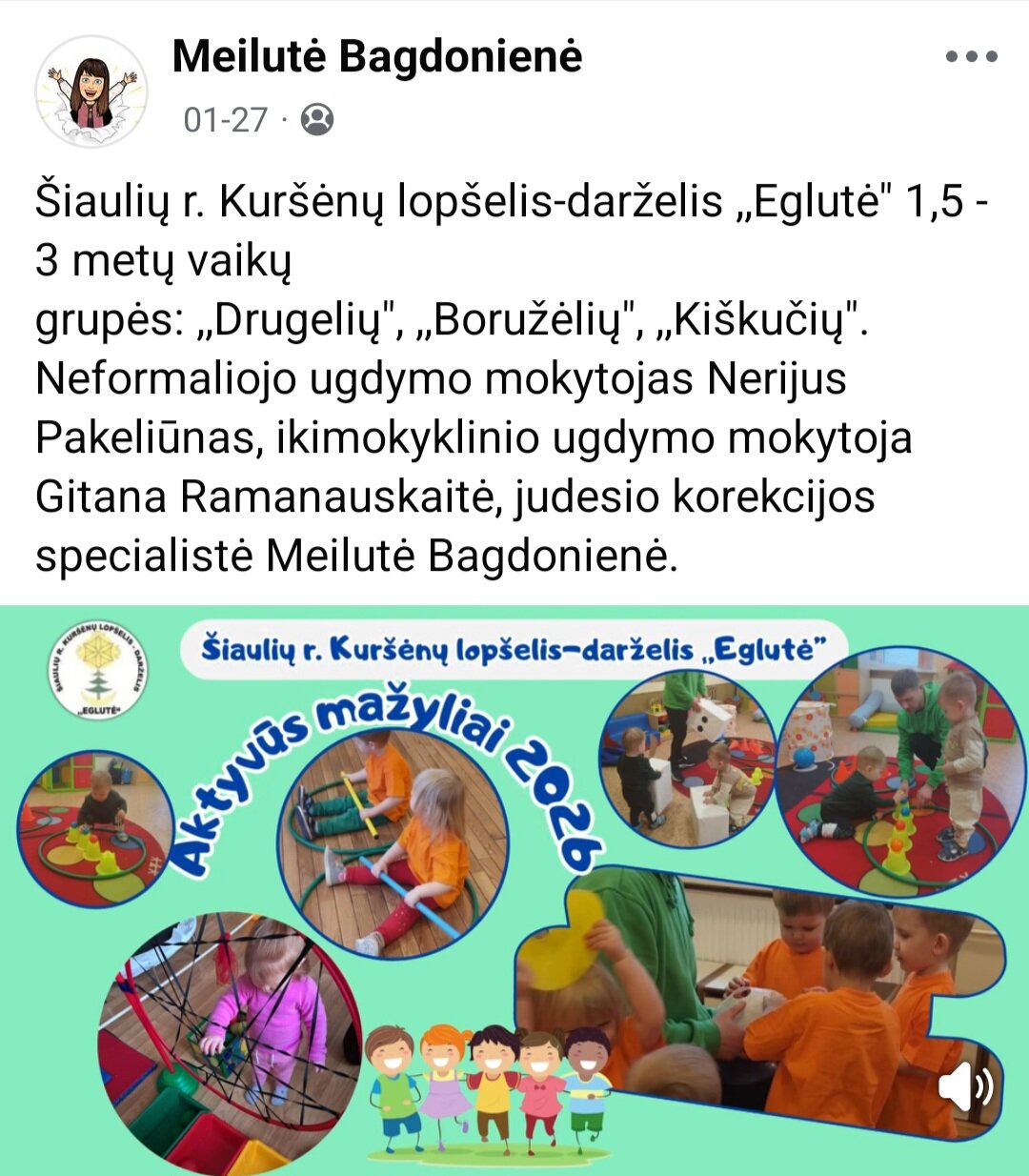 Sausio 12-30 d. judesio korekcijos specialistė, fizinio ugdymo mokytoja Lina Račė organizavo Respublikinį ankstyvojo amžiaus vaikų fizinį aktyvumą skatinantį projektą „Aktyvūs mažyliai 2026“. Projekto tikslas: pasidalinti ankstyvojo amžiaus vaikų fizinio aktyvumo skatinimo žaidimų, pratimų, veiklų idėjomis grupės, sporto salės, muzikos salės, lauko ar kitose erdvėse. Projektas sulaukė didžiulio šalies mokytojų susidomėjimo ir aktyvaus dalyvavimo. Į projektą įsitraukė daugiau nei 130 pedagogų iš visos Lietuvos ikimokyklinio ugdymo įstaigų. Gerąja darbo patirtimi ir kūrybinėmis ankstyvojo amžiaus fizinio aktyvumo veiklų idėjomis dalyviai dalinosi uždaroje Facebook grupėje „Aktyvūs mažyliai 2026“, kurioje patalpinta net 55 video įrašai. Projekto metu mokytojai ne tik dalinosi gerąja darbo patirtimi, bet ir praplėtė praktines žinias, įgavo naujos kūrybinės patirties, pasisėmė veiklos idėjų iš kitų kolegų.