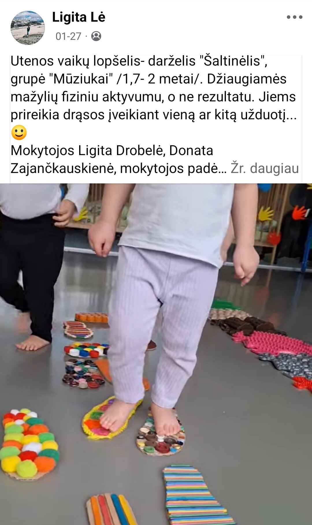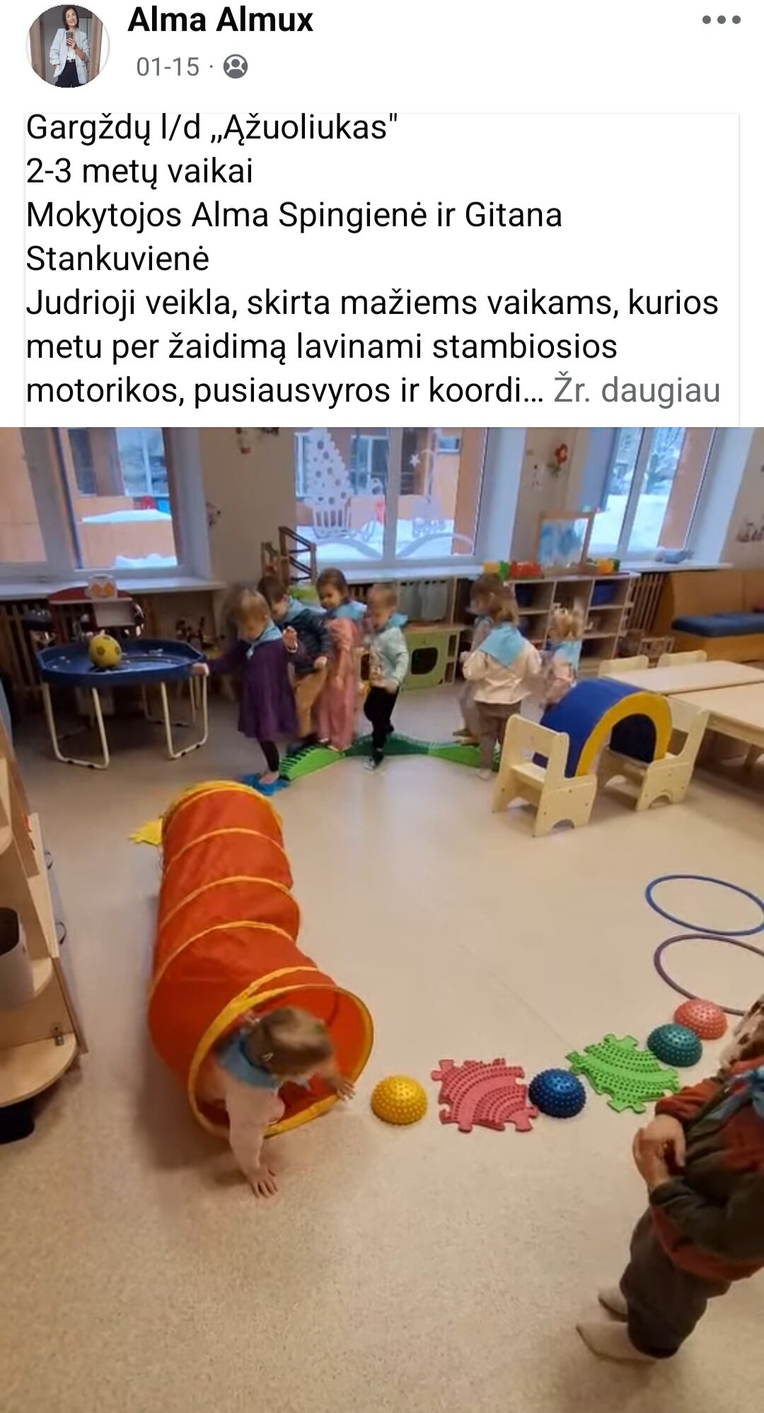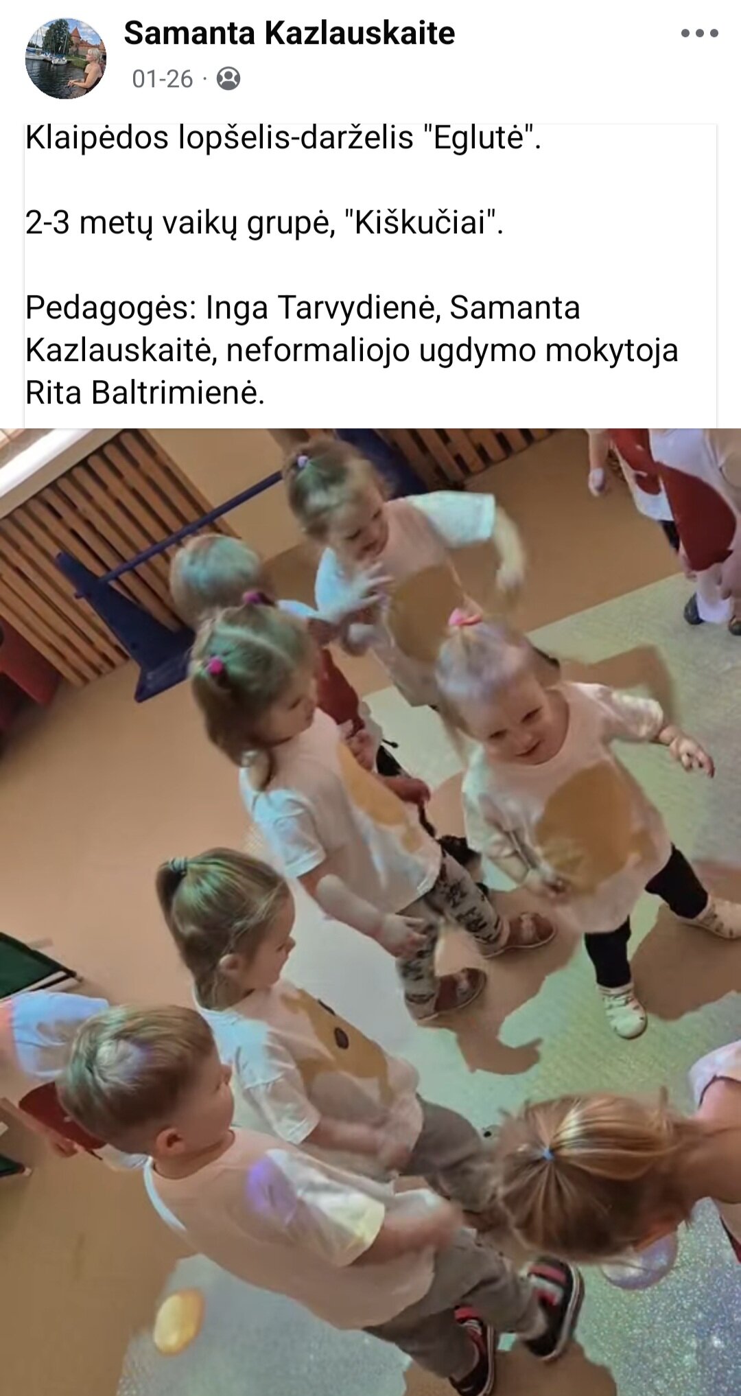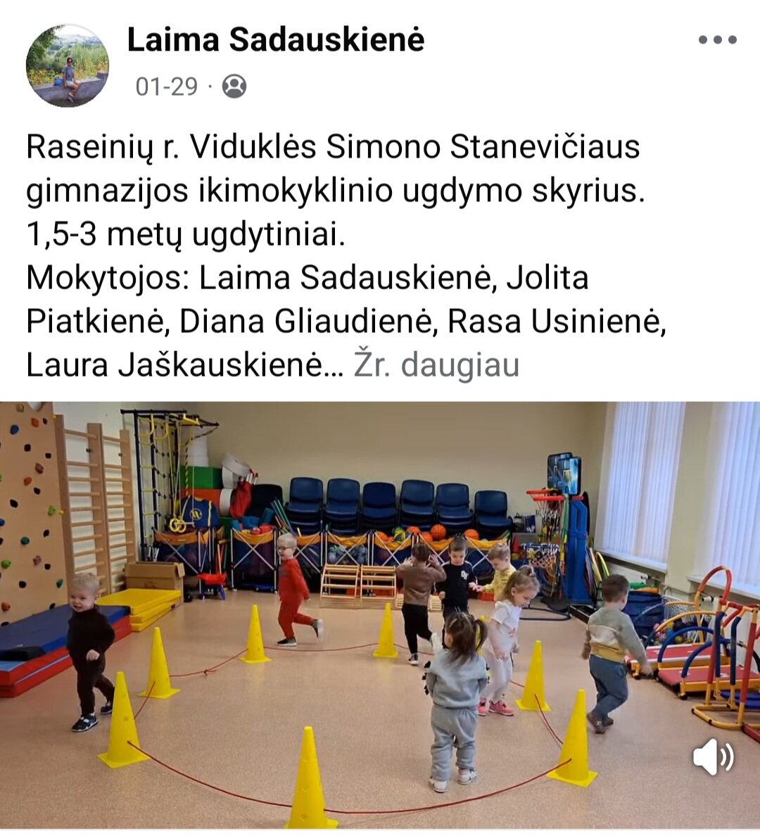 Sausio 12-30 d. judesio korekcijos specialistė, fizinio ugdymo mokytoja Lina Račė organizavo Respublikinį ankstyvojo amžiaus vaikų fizinį aktyvumą skatinantį projektą „Aktyvūs mažyliai 2026“. Projekto tikslas: pasidalinti ankstyvojo amžiaus vaikų fizinio aktyvumo skatinimo žaidimų, pratimų, veiklų idėjomis grupės, sporto salės, muzikos salės, lauko ar kitose erdvėse. Projektas sulaukė didžiulio šalies mokytojų susidomėjimo ir aktyvaus dalyvavimo. Į projektą įsitraukė daugiau nei 130 pedagogų iš visos Lietuvos ikimokyklinio ugdymo įstaigų. Gerąja darbo patirtimi ir kūrybinėmis ankstyvojo amžiaus fizinio aktyvumo veiklų idėjomis dalyviai dalinosi uždaroje Facebook grupėje „Aktyvūs mažyliai 2026“, kurioje patalpinta net 55 video įrašai. Projekto metu mokytojai ne tik dalinosi gerąja darbo patirtimi, bet ir praplėtė praktines žinias, įgavo naujos kūrybinės patirties, pasisėmė veiklos idėjų iš kitų kolegų.