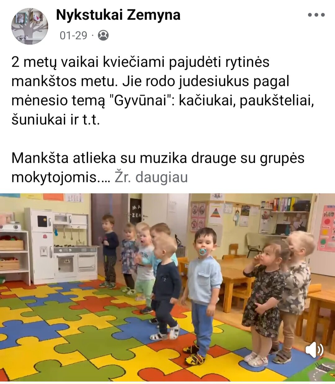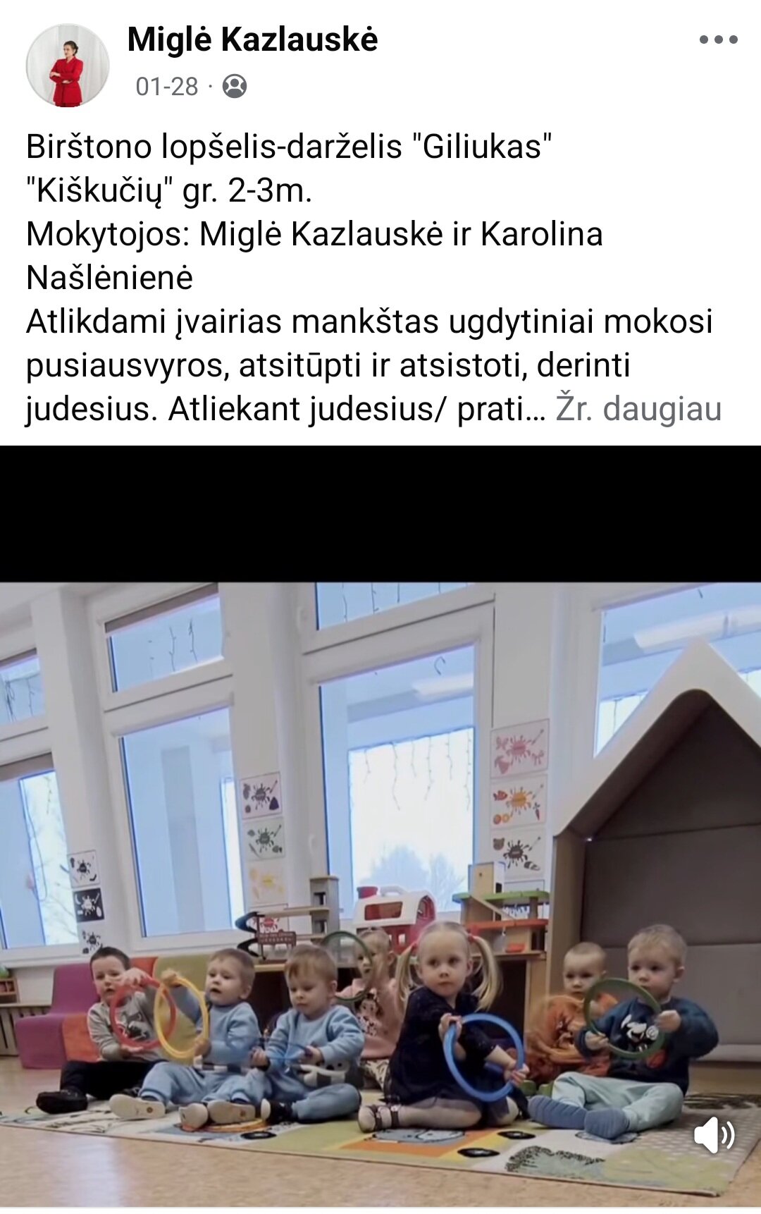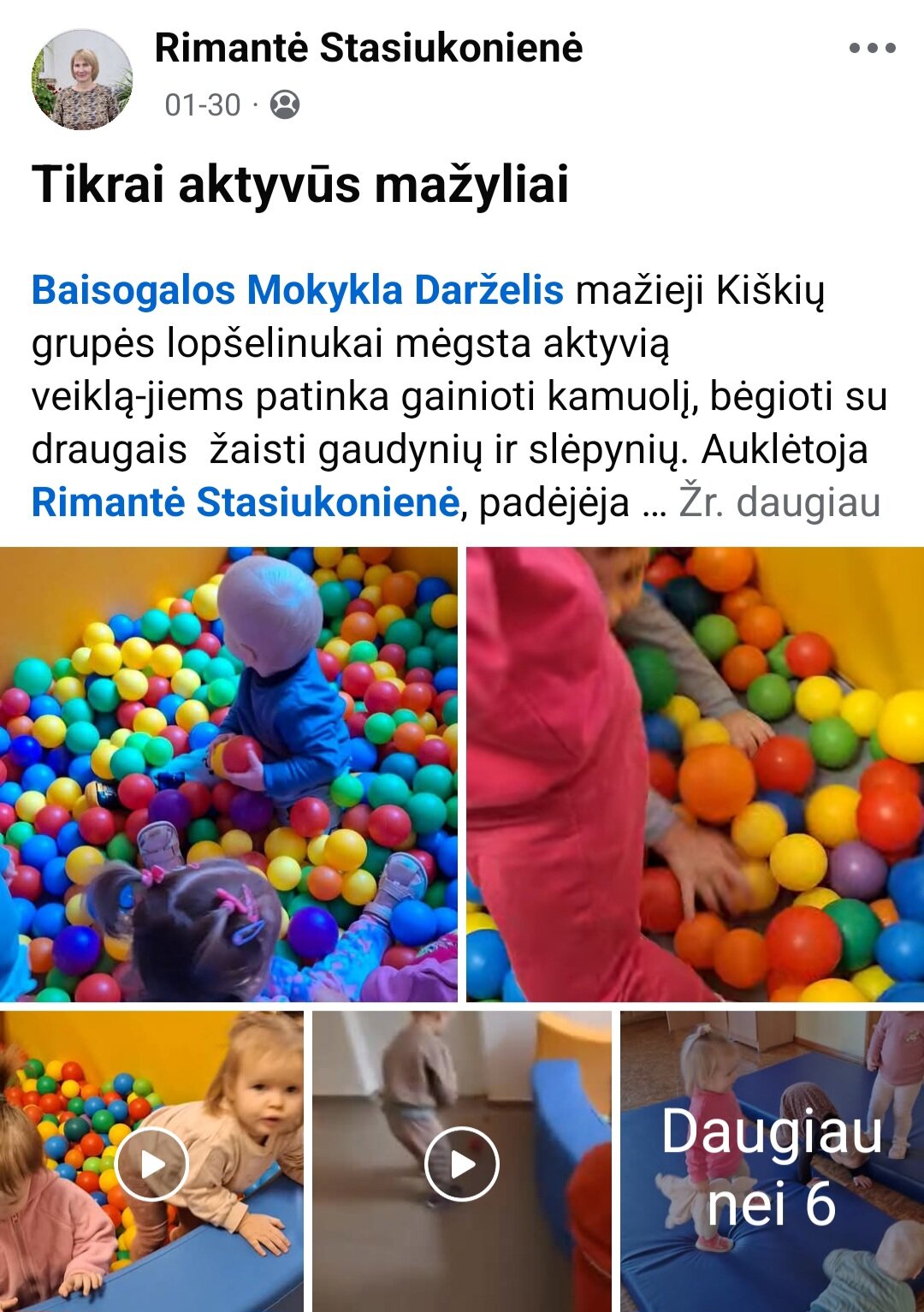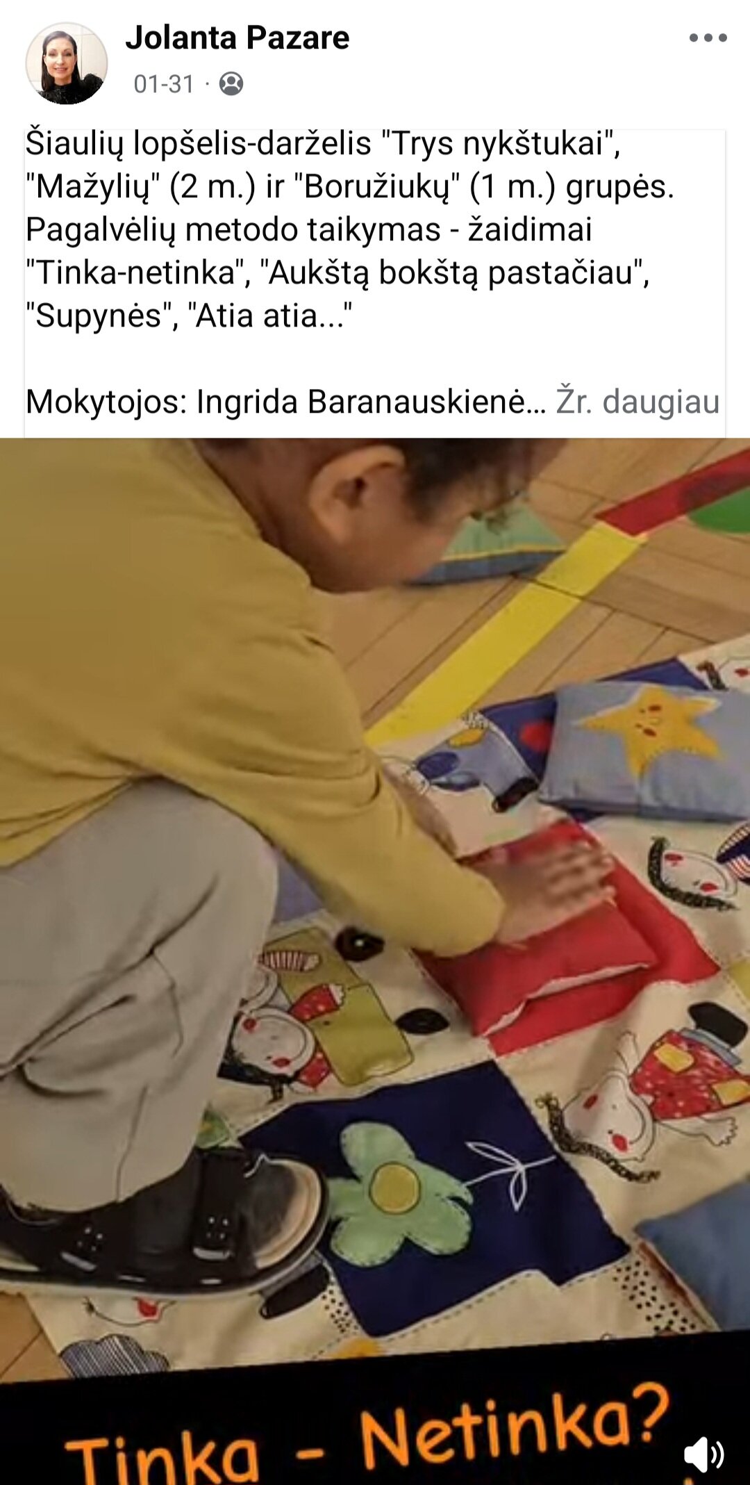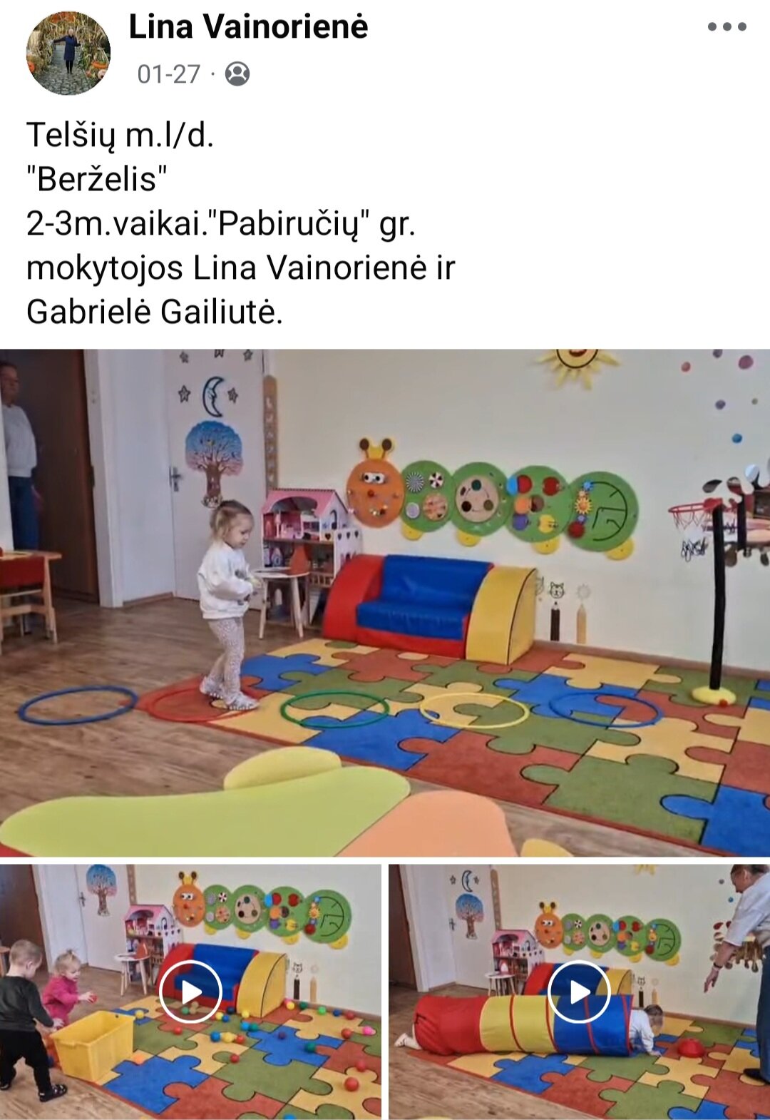 Sausio 12-30 d. judesio korekcijos specialistė, fizinio ugdymo mokytoja Lina Račė organizavo Respublikinį ankstyvojo amžiaus vaikų fizinį aktyvumą skatinantį projektą „Aktyvūs mažyliai 2026“. Projekto tikslas: pasidalinti ankstyvojo amžiaus vaikų fizinio aktyvumo skatinimo žaidimų, pratimų, veiklų idėjomis grupės, sporto salės, muzikos salės, lauko ar kitose erdvėse. Projektas sulaukė didžiulio šalies mokytojų susidomėjimo ir aktyvaus dalyvavimo. Į projektą įsitraukė daugiau nei 130 pedagogų iš visos Lietuvos ikimokyklinio ugdymo įstaigų. Gerąja darbo patirtimi ir kūrybinėmis ankstyvojo amžiaus fizinio aktyvumo veiklų idėjomis dalyviai dalinosi uždaroje Facebook grupėje „Aktyvūs mažyliai 2026“, kurioje patalpinta net 55 video įrašai. Projekto metu mokytojai ne tik dalinosi gerąja darbo patirtimi, bet ir praplėtė praktines žinias, įgavo naujos kūrybinės patirties, pasisėmė veiklos idėjų iš kitų kolegų.