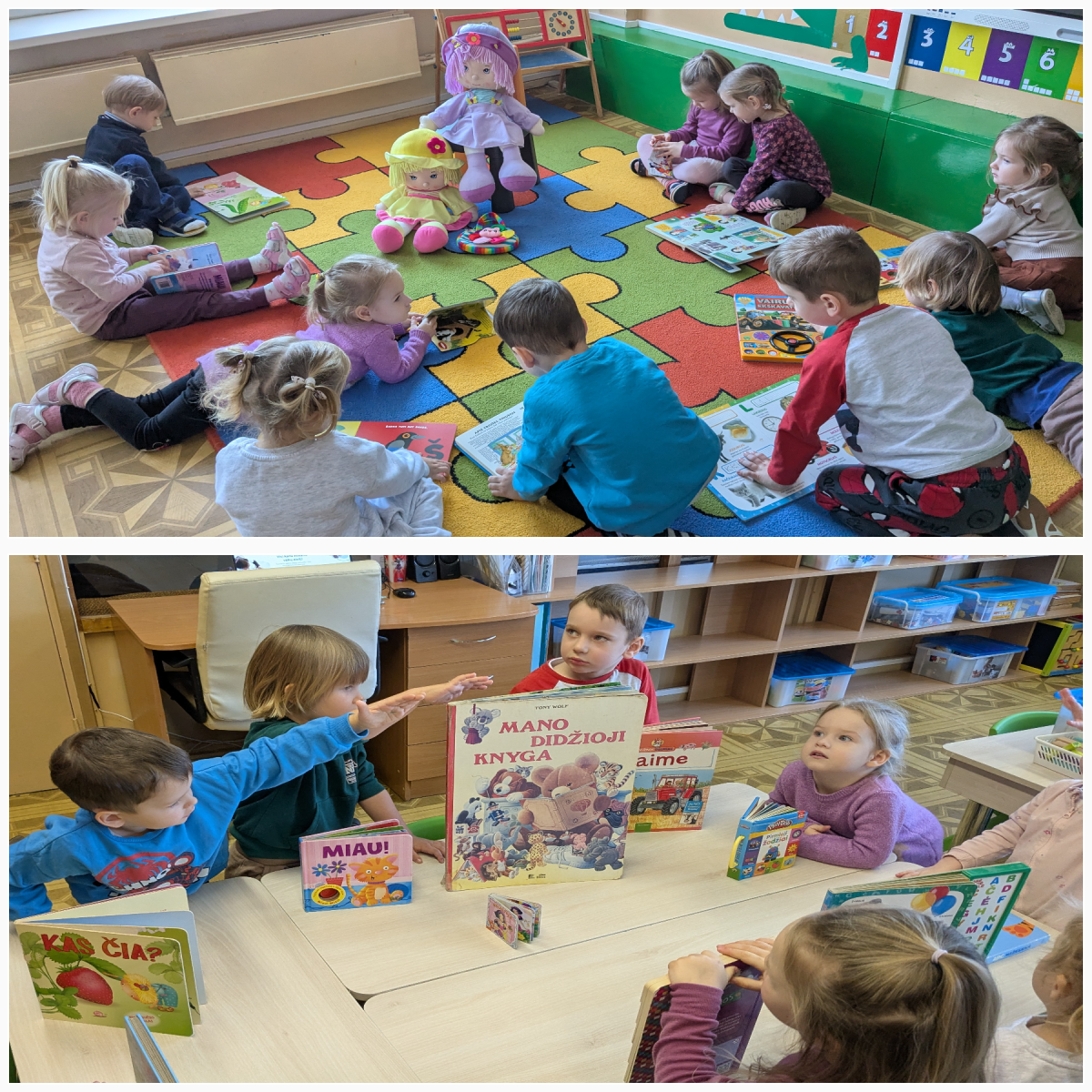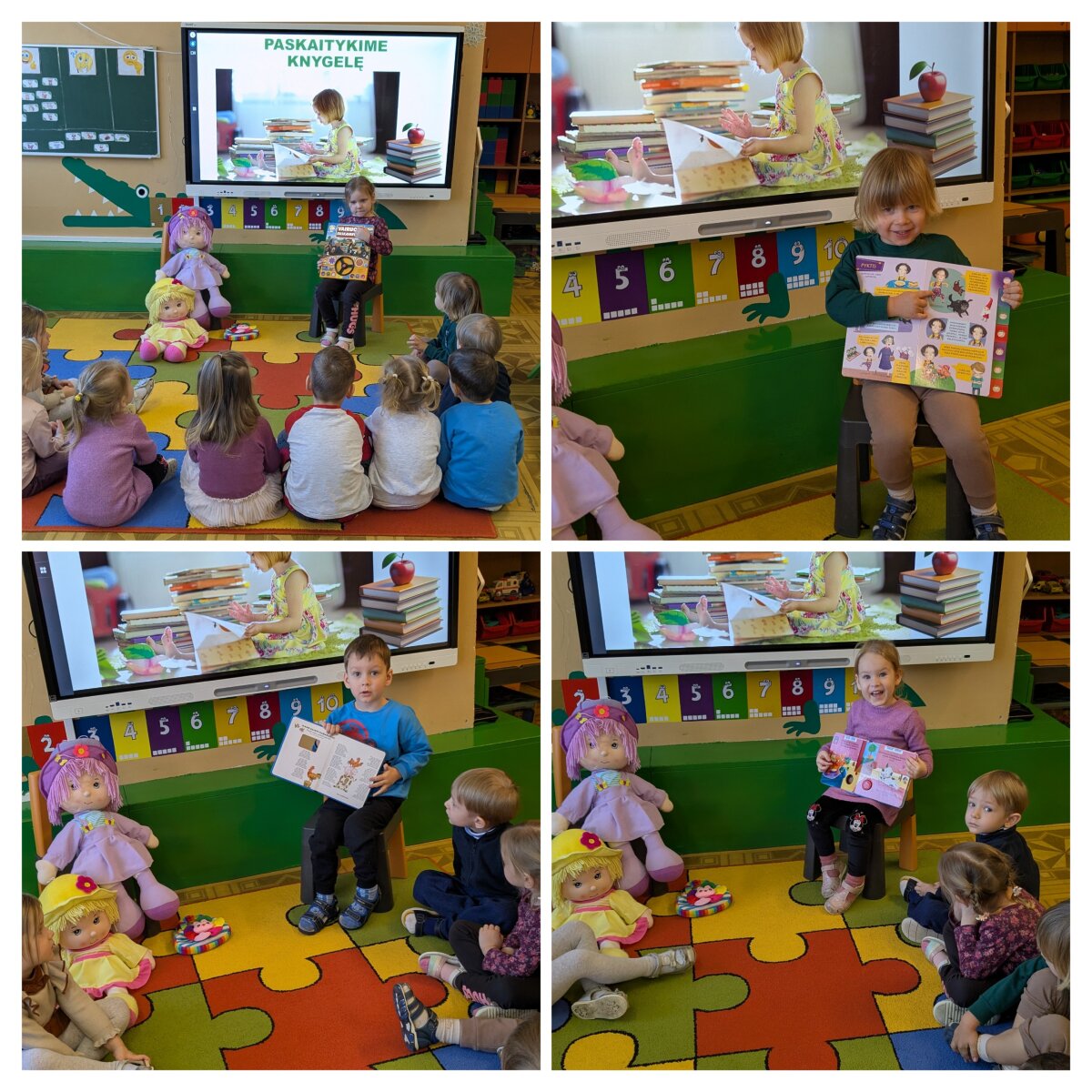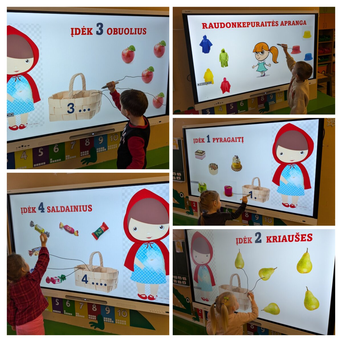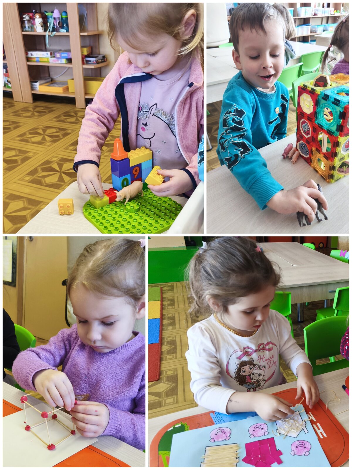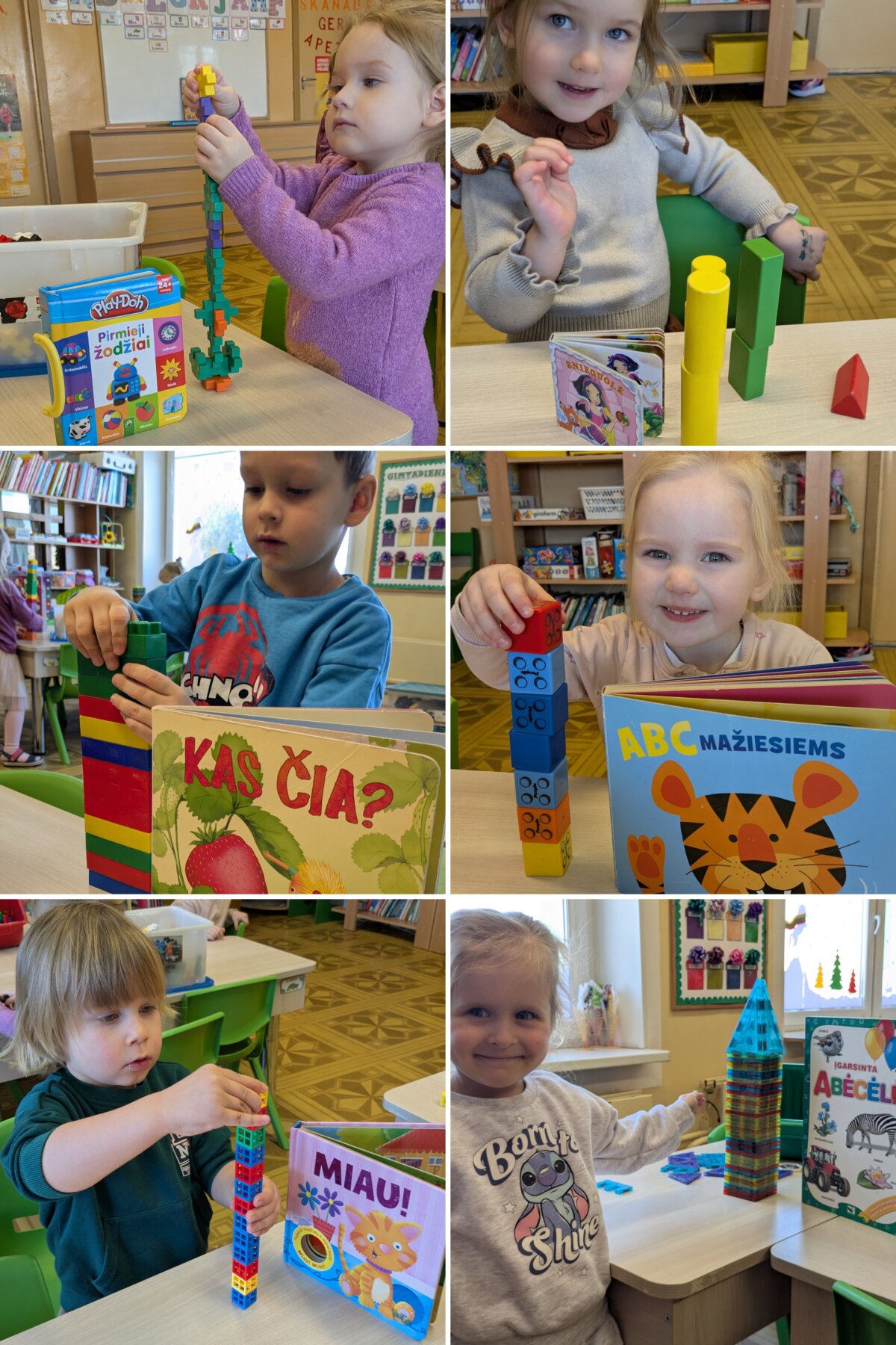 Projekto metu vaikai per žaidimą ir patyrimą susipažino su projekto personažais – lėlėmis, rinko joms vardus, pristatė save ir tyrinėjo savo vardų korteles. Atpažindami pirmąją vardo raidę, vaikai ją siejo su didelėmis raidėmis grupės aplinkoje, lygino, dėliojo iš įvairių medžiagų, spalvino, tapė, rideno kamuoliukus ir judėjo su mašinėlėmis kaip „raidžių gatvėmis“. Tokiu būdu raidės tapo tyrinėjimo objektais, o kalbinė veikla buvo integruota su inžineriniais, meniniais ir sensoriniais patyrimais. Pirštukų žaidimuose ir judesio veiklose vaikai lavino taisyklingą garsų tarimą, kalbinį ritmą, smulkiąją motoriką ir rankų–akių koordinaciją, kurie yra svarbūs kalbos raidai. Kalbiniai gebėjimai buvo nuosekliai ugdomi per knygelių „skaitymą“ ir analizę – vaikai įvardijo iliustracijose matomus objektus, veikėjus, jų veiksmus, lygino knygas pagal dydį ir storį, taikydami elementarius matematinio mąstymo veiksmus. Inžinerinė STEAM veikla „Bokštas aukštesnis už knygą“ skatino vaikus planuoti, rinktis priemones, matuoti, lyginti aukštį, bandyti ir koreguoti sprendimus, ugdant atkaklumą, loginį mąstymą ir pasitikėjimą savimi. LEGO namo konstravimas ir takų planavimas papildė šias veiklas, skatindami erdvinį suvokimą, problemų sprendimą ir bendradarbiavimą. Pasakos „Raudonkepuraitė“, „Trys paršiukai“ ir „Ropė“ tapo integruota STEAM priemone kalbai, technologijoms, inžinerijai ir kūrybinei raiškai ugdyti. Vaikai stebėjo pasakų fragmentus virtualioje aplinkoje, atkūrė siužetus naudodami figūrėles, improvizavo vaidindami, kūrė dialogus, konstravo paršiukams namelius iš skirtingų medžiagų ir analizavo veikėjų elgesį. Veiklos „Pintinė močiutei“ metu vaikai atpažino maisto produktus, juos įvardijo, grupavo ir sąmoningai vartojo kalboje, taip tikslingai plėsdami aktyvųjį žodyną. Tyrinėjimo ir gamtamokslinio pažinimo veiklose vaikai svėrė ir lygino ropes, tyrinėjo jų dydį, o eksperimento „Paslaptis“ metu, naudodami stiklinį indą ir spalvotą vandenį, aiškinosi pasakos „Ropė“ veikėjų eiliškumą. Eksperimento „Vilko pūtimas“ metu vaikai tyrė oro srauto poveikį skirtingoms konstrukcinėms medžiagoms, lygino namelių tvirtumą ir darė paprastas išvadas. Technologijų integracija vyko per edukacinius IT žaidimus, kuriuose vaikai siejo skaičių ir kiekį, atpažino ir įvardijo raides, girdėjo ir kartojo jų garsus. Programuodami Photon robotuko kelią iki savo vardo pirmosios raidės, vaikai lavino loginį ir matematinį mąstymą, sekos suvokimą bei erdvinę orientaciją. Įgyvendinant projektą „Čiauškučiai“, didelis dėmesys buvo skiriamas ir tiksliniam kalbinių gebėjimų stiprinimui bendradarbiaujant su švietimo pagalbos specialistu. Logopedė–specialioji pedagogė Deimantė Šniukaitė vedė kalbos ugdymo užsiėmimą, kurio metu žaismingai ir nuosekliai buvo lavinami vaikų kalbiniai įgūdžiai. Užsiėmimo pradžioje vaikai atliko artikuliacinio aparato mankštą „Citrinukė“ ir „Ema“, stiprindami burnos, liežuvio ir lūpų raumenis bei ruošdamiesi tolimesnėms kalbinėms veikloms. Taikant patyriminį ir tyrinėjimu grįstą metodą, vaikai lavino kalbinį kvėpavimą pūsdami plunksnas ir stebėdami jų judėjimą ore. Klausydamiesi gyvūnų skleidžiamų garsų, vaikai ugdė girdimąjį suvokimą, bandė atpažinti ir įvardyti garsų šaltinius. Žaidybinėje veikloje su kamuoliukais vaikai ieškojo vienodų paveikslėlių ir spalvų porų, o suradę jas įvardijo, apibūdino spalvą ir dydį, taip stiprindami žodyną, kalbinę raišką ir loginį mąstymą. Šis užsiėmimas prasmingai papildė projekte taikomas STEAM veiklas ir prisidėjo prie nuoseklaus vaikų kalbos ugdymo ir džiaugsmo mokantis.