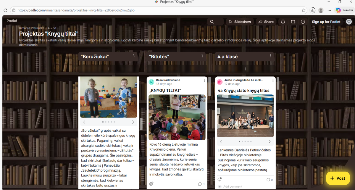 2026 m. kovo 16 d. – balandžio 3 d. vyko projektas „Knygų tiltai“, kurį organizavo Šiaulių lopšelio-darželio ikimokyklinio ugdymo mokytojos Rasa Radavičienė, Dalia Kazlauskienė, Lina Šaltmėrytė, ikimokyklinio ugdymo mokytoja-specialioji pedagogė Rimantė Petrauskė, logopedė-specialioji pedagogė Deimantė Šniukaitė bei Panevėžio „Saulėtekio“ progimnazijos pradinių klasių mokytoja Justė Pudrigailaitė.