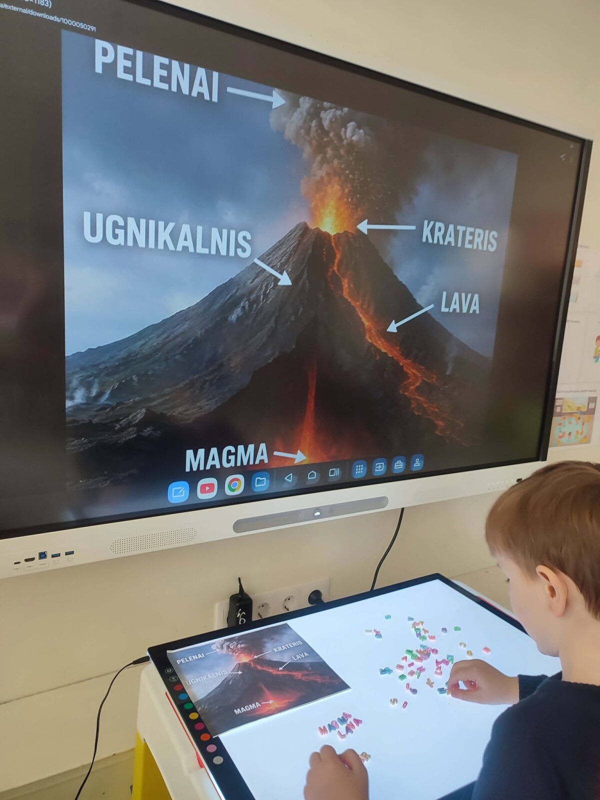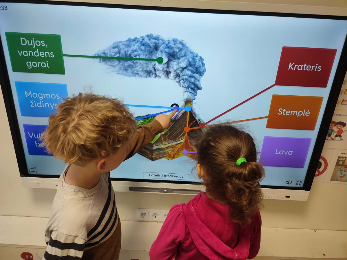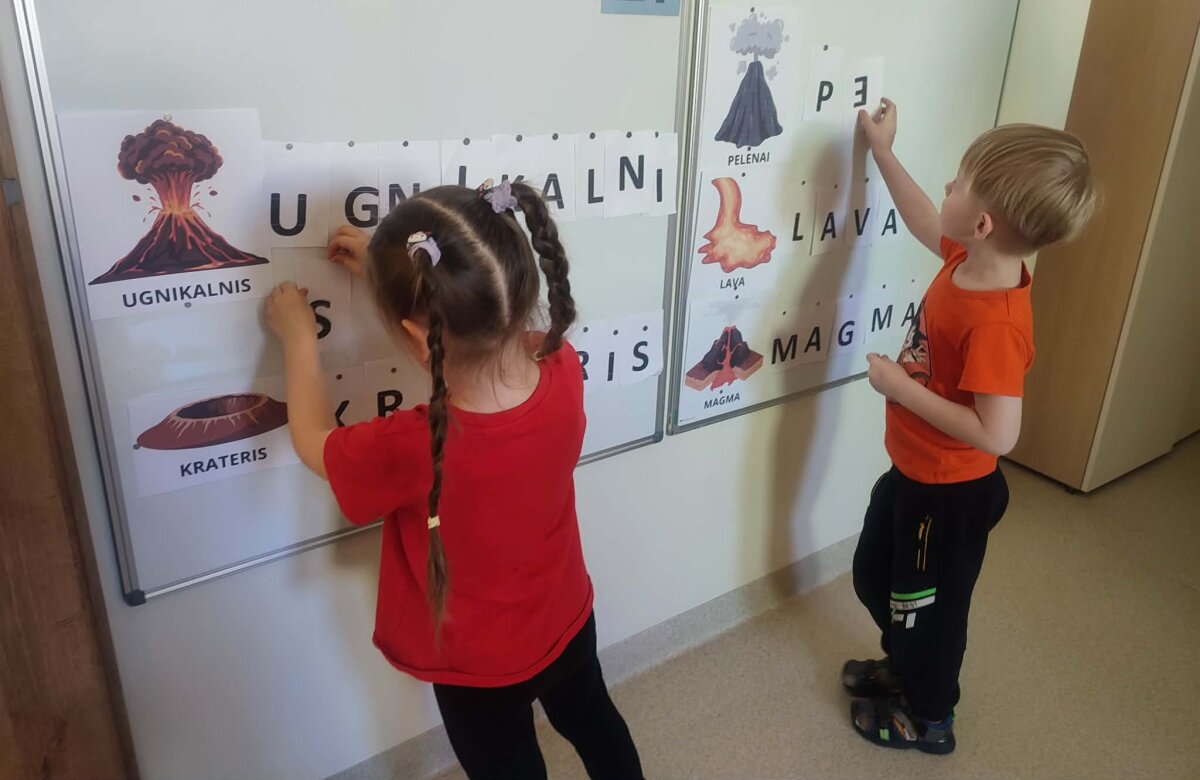 Š. m. balandžio 13–17 d. „Riešutėliai“ grupės vaikai dalyvavo STEAM veiklose, kurias organizavo ikimokyklinio ugdymo mokytojos Vaida Vaičiuvienė ir Sandra Tamašauskaitė, mokinio padėjėja Asta Kliminskienė bei mokytojos padėjėja Erika Šeškevičienė, nagrinėdami ugnikalnių temą. Šią temą inicijavo patys vaikai, laisvo žaidimo metu jie domėjosi lava, ugnikalniais, imitavo jų išsiveržimus, todėl veiklos buvo plėtojamos atsižvelgiant į jų smalsumą ir idėjas. Tyrinėjimo veiklų metu vaikai kūrė ugnikalnio modelį ant sensorinio padėklo, aplink jį formavo aplinką, statė namus, dėliojo žmonių ir gyvūnų figūrėles, svarstė, kaip juos apsaugoti nuo lavos. Atlikdami eksperimentą pylė sodą, actą ir stebėjo „išsiveržimą“, kėlė hipotezes, analizavo, ar lava pasiekė pastatus, aptarė rezultatus ir siūlė sprendimus. Taip pat atliko „Lavos lempos“ eksperimentą, pylė vandenį, jį spalvino, ant viršaus pylė aliejų ir stebėjo, kaip skysčiai nesusimaišo, o įmetus putojančią tabletę, kaip kyla ir leidžiasi burbuliukai. Šios veiklos metu vaikai taikė ir matematinius gebėjimus, svarstyklėmis svėrė vandenį ir aliejų, lygino jų kiekius, bandė parinkti tinkamas proporcijas, kad eksperimentas pavyktų. STEAM veiklų metu vaikai atliko ir „Lavos lenktynių“ eksperimentą, lygino vandens, aliejaus ir medaus tekėjimo greitį, darė išvadas apie skysčių tirštumą ir jo įtaką tekėjimui, siejo tai su tikros lavos judėjimu. Naudodamiesi išmaniosiomis technologijomis gilino žinias apie ugnikalnio sandarą, interaktyvioje lentoje žymėjo ugnikalnio dalis, mokėsi atpažinti ir įvardyti kraterį, magmą, lavą, pelenus, dujas, aptarė, kaip vyksta išsiveržimas. Kūrybinėse veiklose vaikai kūrė didelio formato ugnikalnius, juos dekoravo, formavo „lavos“ tekėjimo kryptis, eksperimentavo su spalvomis. Taip pat kūrė ugnikalnius iš popierinių lėkščių, dažė, klijavo detales, formavo kūgius, įvardijo kraterį. Piešdami akvarele perteikė skirtingas ugnikalnio būsenas – vieni piešė ramų, kiti – išsiveržiantį ugnikalnį, džiaugėsi savo kūriniais ir juos pristatė. Žaidimų metu vaikai iš LEGO ir kitų konstruktorių kūrė ugnikalnius, planavo jų struktūrą, kūrė aplinką, pasiskirstė vaidmenimis, kūrė istorijas apie ugnikalnius ir jų aplinką. Žaisdami tyrinėjo, eksperimentavo, bendradarbiavo ir dalijosi savo idėjomis bei patirtimis. Į pažintinę veiklą apie ugnikalnius įsitraukė ir tėveliai. Vienas iš tėvelių pasidalino savo asmenine patirtimi apie Islandijoje išsiveržusį ugnikalnį, papasakojo apie matytą lavą, įspūdžius, parodė nuotraukas, vaizdo medžiagą bei pristatė lavos pavyzdžius. Tai dar labiau sudomino vaikus ir praturtino jų patirtį. Visų STEAM veiklų metu vaikai buvo aktyvūs, smalsūs, kūrybiški, drąsiai kėlė idėjas, tyrinėjo, eksperimentavo, bendradarbiavo ir džiaugėsi savo atradimais.