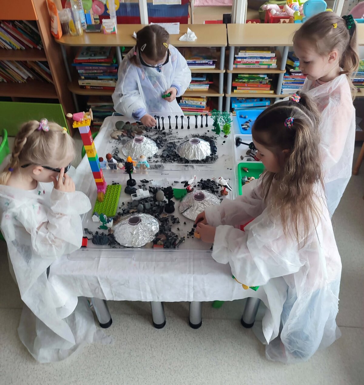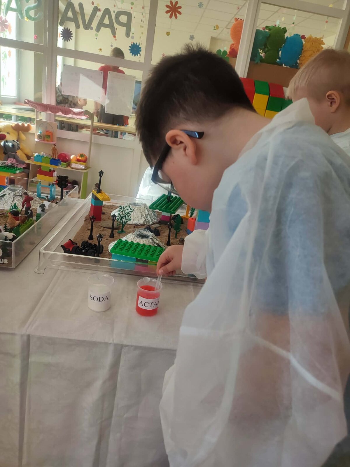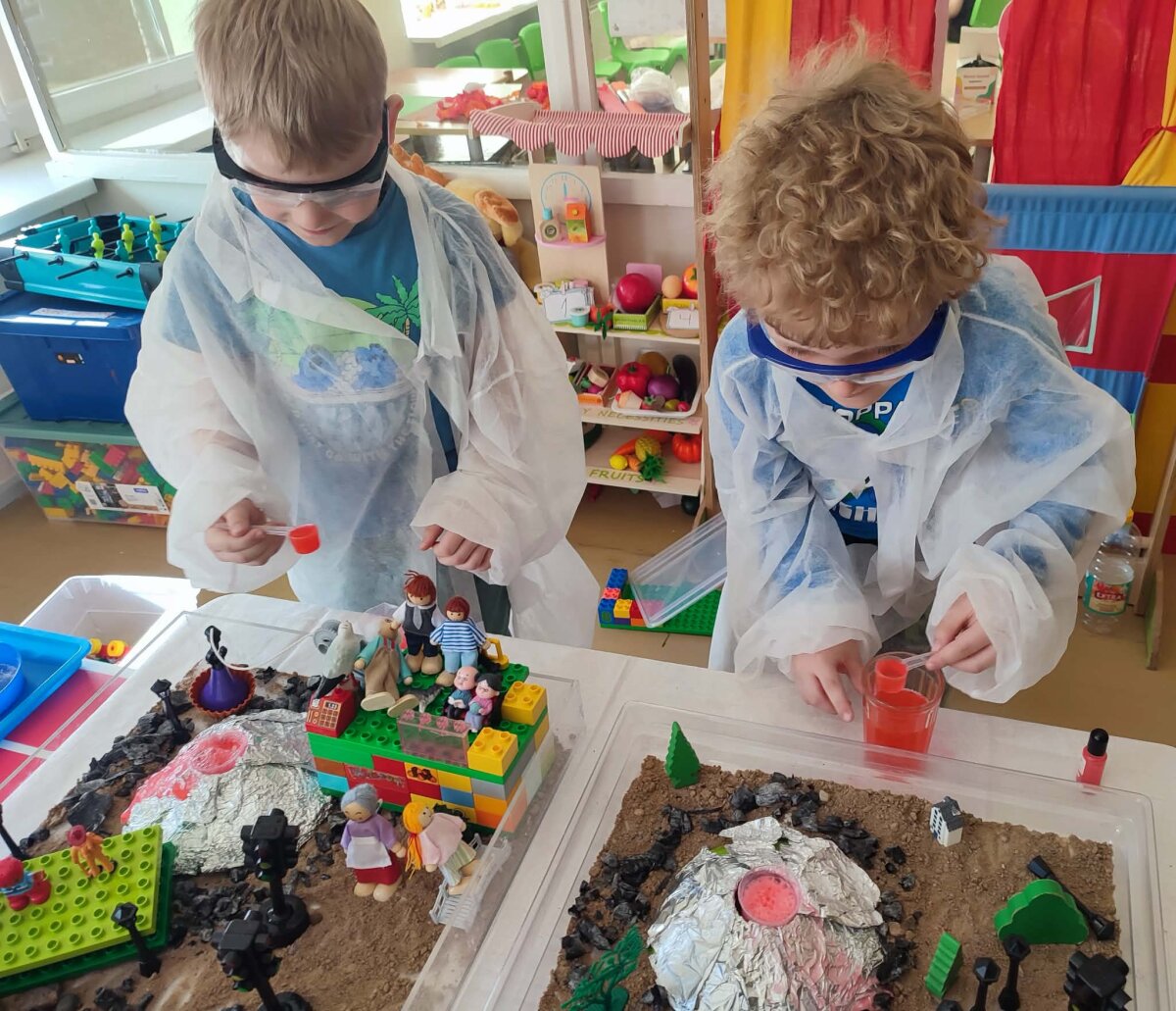 Š. m. balandžio 13–17 d. „Riešutėliai“ grupės vaikai dalyvavo STEAM veiklose, kurias organizavo ikimokyklinio ugdymo mokytojos Vaida Vaičiuvienė ir Sandra Tamašauskaitė, mokinio padėjėja Asta Kliminskienė bei mokytojos padėjėja Erika Šeškevičienė, nagrinėdami ugnikalnių temą. Šią temą inicijavo patys vaikai, laisvo žaidimo metu jie domėjosi lava, ugnikalniais, imitavo jų išsiveržimus, todėl veiklos buvo plėtojamos atsižvelgiant į jų smalsumą ir idėjas. Tyrinėjimo veiklų metu vaikai kūrė ugnikalnio modelį ant sensorinio padėklo, aplink jį formavo aplinką, statė namus, dėliojo žmonių ir gyvūnų figūrėles, svarstė, kaip juos apsaugoti nuo lavos. Atlikdami eksperimentą pylė sodą, actą ir stebėjo „išsiveržimą“, kėlė hipotezes, analizavo, ar lava pasiekė pastatus, aptarė rezultatus ir siūlė sprendimus. Taip pat atliko „Lavos lempos“ eksperimentą, pylė vandenį, jį spalvino, ant viršaus pylė aliejų ir stebėjo, kaip skysčiai nesusimaišo, o įmetus putojančią tabletę, kaip kyla ir leidžiasi burbuliukai. Šios veiklos metu vaikai taikė ir matematinius gebėjimus, svarstyklėmis svėrė vandenį ir aliejų, lygino jų kiekius, bandė parinkti tinkamas proporcijas, kad eksperimentas pavyktų. STEAM veiklų metu vaikai atliko ir „Lavos lenktynių“ eksperimentą, lygino vandens, aliejaus ir medaus tekėjimo greitį, darė išvadas apie skysčių tirštumą ir jo įtaką tekėjimui, siejo tai su tikros lavos judėjimu. Naudodamiesi išmaniosiomis technologijomis gilino žinias apie ugnikalnio sandarą, interaktyvioje lentoje žymėjo ugnikalnio dalis, mokėsi atpažinti ir įvardyti kraterį, magmą, lavą, pelenus, dujas, aptarė, kaip vyksta išsiveržimas. Kūrybinėse veiklose vaikai kūrė didelio formato ugnikalnius, juos dekoravo, formavo „lavos“ tekėjimo kryptis, eksperimentavo su spalvomis. Taip pat kūrė ugnikalnius iš popierinių lėkščių, dažė, klijavo detales, formavo kūgius, įvardijo kraterį. Piešdami akvarele perteikė skirtingas ugnikalnio būsenas – vieni piešė ramų, kiti – išsiveržiantį ugnikalnį, džiaugėsi savo kūriniais ir juos pristatė. Žaidimų metu vaikai iš LEGO ir kitų konstruktorių kūrė ugnikalnius, planavo jų struktūrą, kūrė aplinką, pasiskirstė vaidmenimis, kūrė istorijas apie ugnikalnius ir jų aplinką. Žaisdami tyrinėjo, eksperimentavo, bendradarbiavo ir dalijosi savo idėjomis bei patirtimis. Į pažintinę veiklą apie ugnikalnius įsitraukė ir tėveliai. Vienas iš tėvelių pasidalino savo asmenine patirtimi apie Islandijoje išsiveržusį ugnikalnį, papasakojo apie matytą lavą, įspūdžius, parodė nuotraukas, vaizdo medžiagą bei pristatė lavos pavyzdžius. Tai dar labiau sudomino vaikus ir praturtino jų patirtį. Visų STEAM veiklų metu vaikai buvo aktyvūs, smalsūs, kūrybiški, drąsiai kėlė idėjas, tyrinėjo, eksperimentavo, bendradarbiavo ir džiaugėsi savo atradimais.