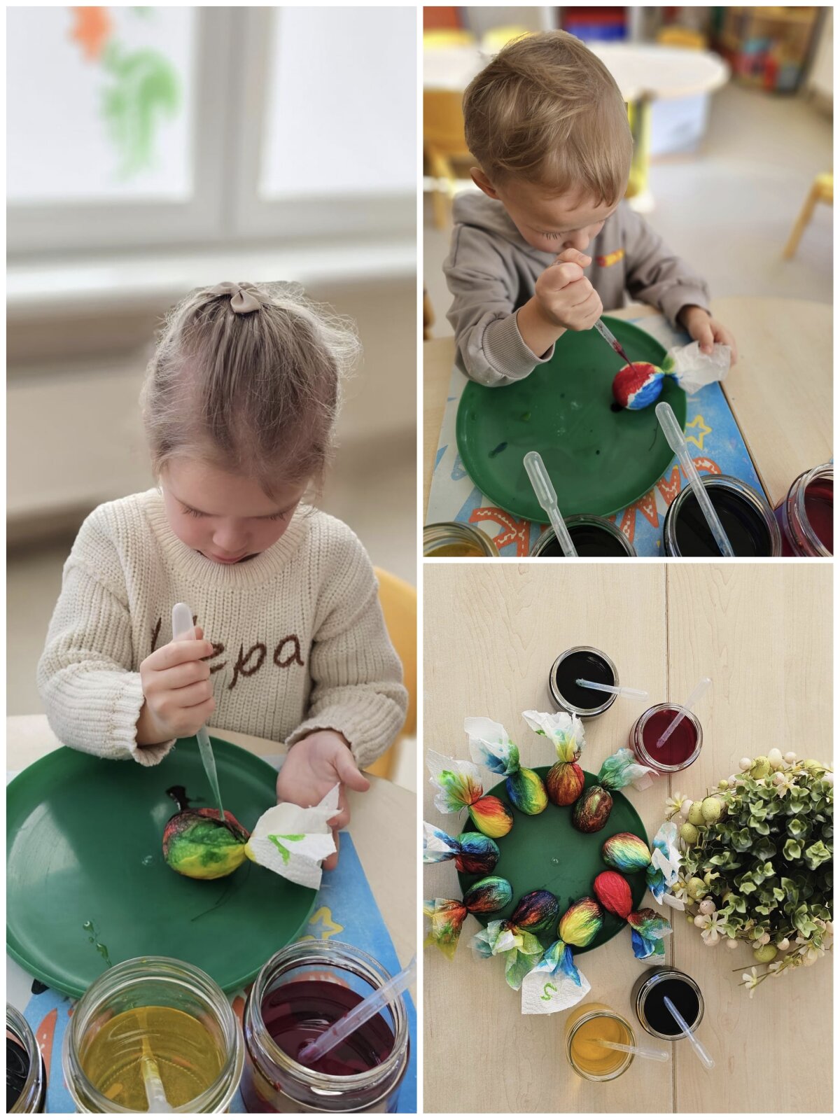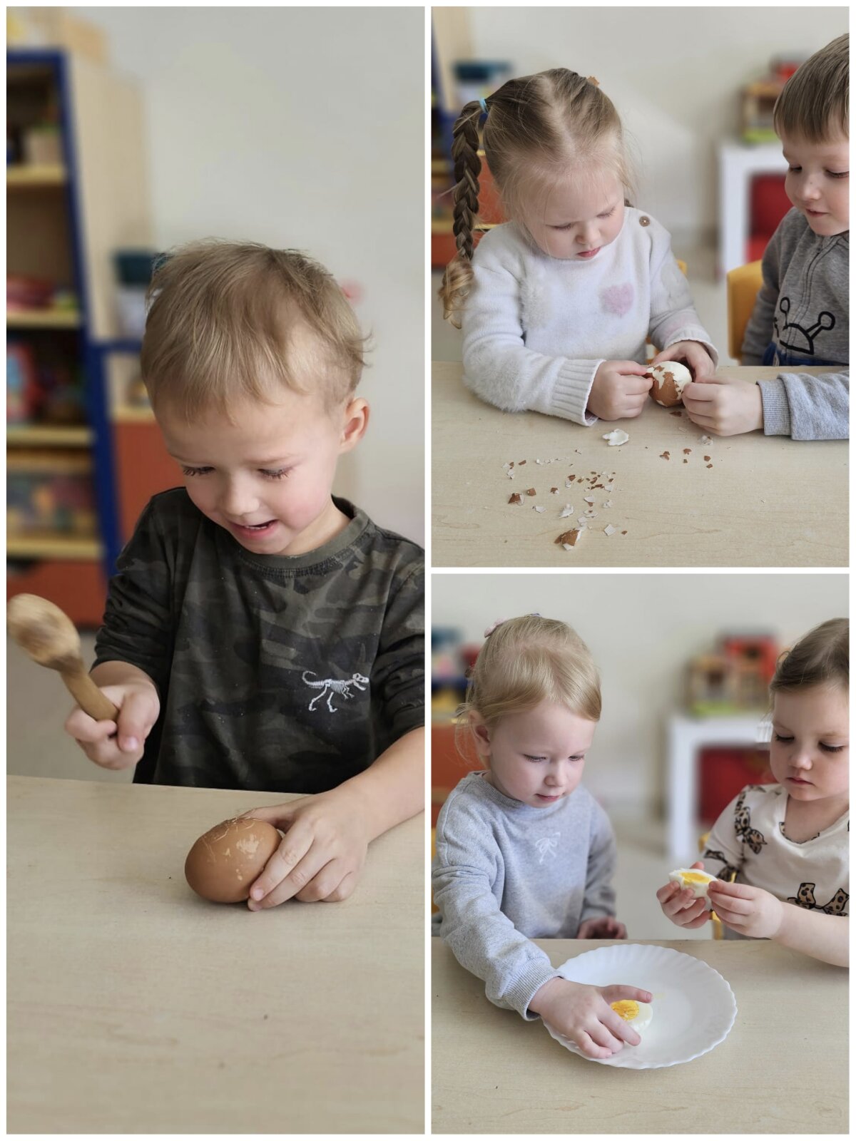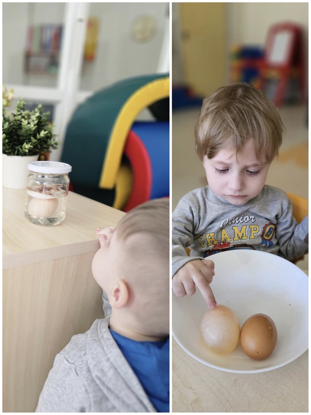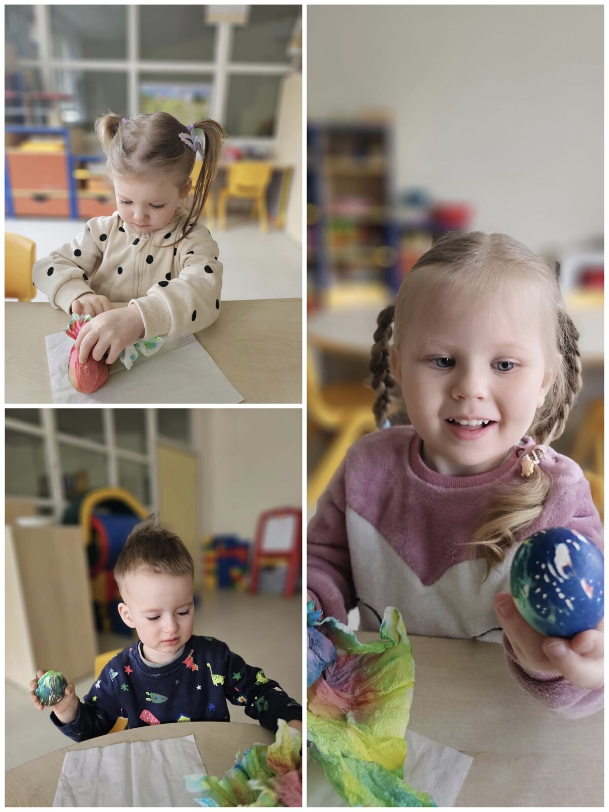 Vaikai su dideliu susidomėjimu tyrinėjo kiaušinius: bandė, eksperimentavo, stebėjo ir dalijosi savo atradimais. Atliekant bandymą su vandeniu ir druska, mažieji patys bėrė druską, maišė ir su nuostaba stebėjo, kaip kiaušinis tai skęsta, tai ima plūduriuoti. Eksperimento su actu metu vaikai su smalsumu lietė kiaušinį be lukšto ir nustebę atrado, kad jis tapo minkštas. Tyrinėdami kiaušinį vaikai jį lukšteno, apžiūrėjo iš vidaus, lygino spalvas, paviršius, dalijosi įspūdžiais. Kūrybiškumo ir sumanumo pareikalavo užduotis sukurti kiaušiniui lizdą – mažieji rinkosi medžiagas, dėliojo, bandė ir džiaugėsi savo rezultatais. Judriose ir pažintinėse veiklose vaikai rideno kiaušinius ir kitus daiktus, smalsiai stebėjo jų judėjimą, lygino, kuris nurieda toliau. Taip pat rūšiavo spalvotus kiaušinius, dėliojo paprastas sekas, lavino spalvų pažinimą ir loginį mąstymą. Kūrybinėse veiklose vaikai turėjo galimybę išbandyti įvairias technikas. Dažydami kiaušinius pipetėmis, jie su džiaugsmu stebėjo, kaip spalvos susilieja ir kuria netikėtus raštus. Mažieji išbandė netradicinę techniką – margučių atspaudus naudojant burbulinę plėvelę. Vaikai tepė dažus, prispaudė plėvelę prie popieriaus ir smalsiai stebėjo, kaip ant popieriaus atsiranda spalvoti, taškuoti raštai. Kiekvienas darbas tapo savitas ir ypatingas.