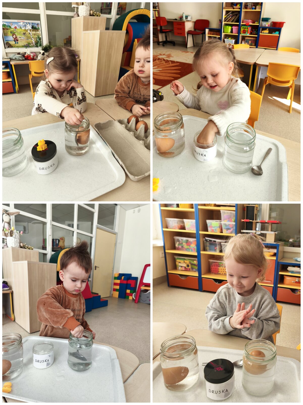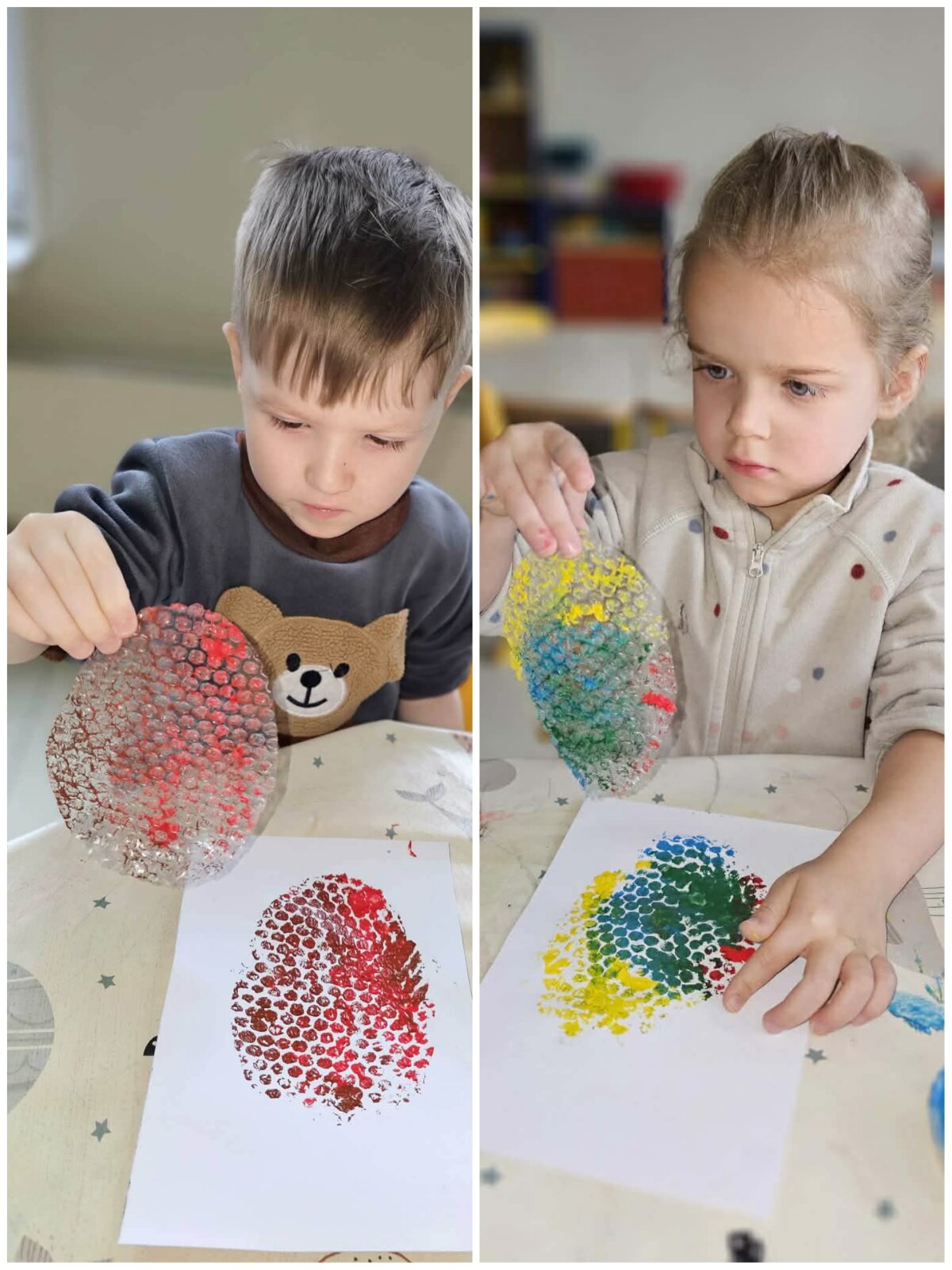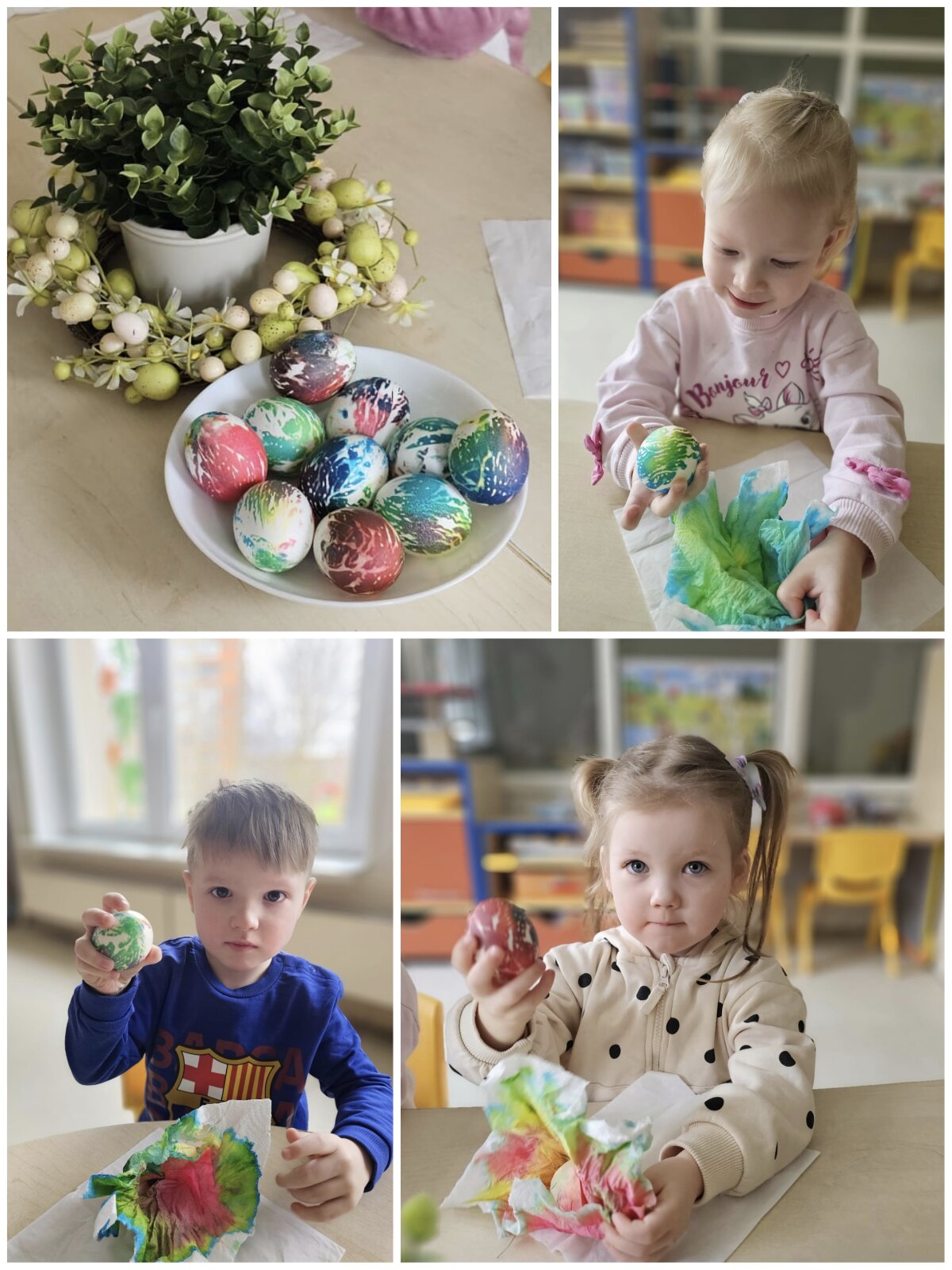 Vaikai su dideliu susidomėjimu tyrinėjo kiaušinius: bandė, eksperimentavo, stebėjo ir dalijosi savo atradimais. Atliekant bandymą su vandeniu ir druska, mažieji patys bėrė druską, maišė ir su nuostaba stebėjo, kaip kiaušinis tai skęsta, tai ima plūduriuoti. Eksperimento su actu metu vaikai su smalsumu lietė kiaušinį be lukšto ir nustebę atrado, kad jis tapo minkštas. Tyrinėdami kiaušinį vaikai jį lukšteno, apžiūrėjo iš vidaus, lygino spalvas, paviršius, dalijosi įspūdžiais. Kūrybiškumo ir sumanumo pareikalavo užduotis sukurti kiaušiniui lizdą – mažieji rinkosi medžiagas, dėliojo, bandė ir džiaugėsi savo rezultatais. Judriose ir pažintinėse veiklose vaikai rideno kiaušinius ir kitus daiktus, smalsiai stebėjo jų judėjimą, lygino, kuris nurieda toliau. Taip pat rūšiavo spalvotus kiaušinius, dėliojo paprastas sekas, lavino spalvų pažinimą ir loginį mąstymą. Kūrybinėse veiklose vaikai turėjo galimybę išbandyti įvairias technikas. Dažydami kiaušinius pipetėmis, jie su džiaugsmu stebėjo, kaip spalvos susilieja ir kuria netikėtus raštus. Mažieji išbandė netradicinę techniką – margučių atspaudus naudojant burbulinę plėvelę. Vaikai tepė dažus, prispaudė plėvelę prie popieriaus ir smalsiai stebėjo, kaip ant popieriaus atsiranda spalvoti, taškuoti raštai. Kiekvienas darbas tapo savitas ir ypatingas.