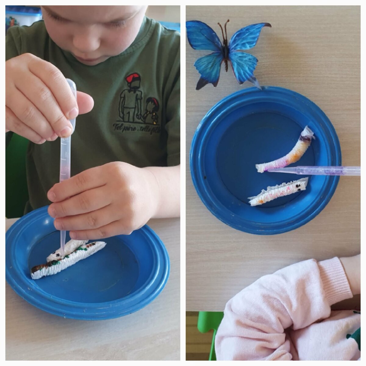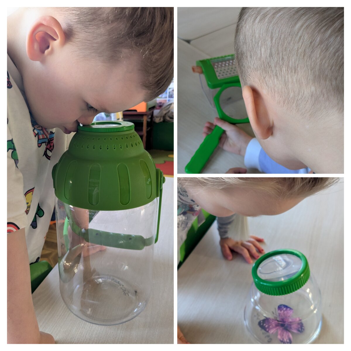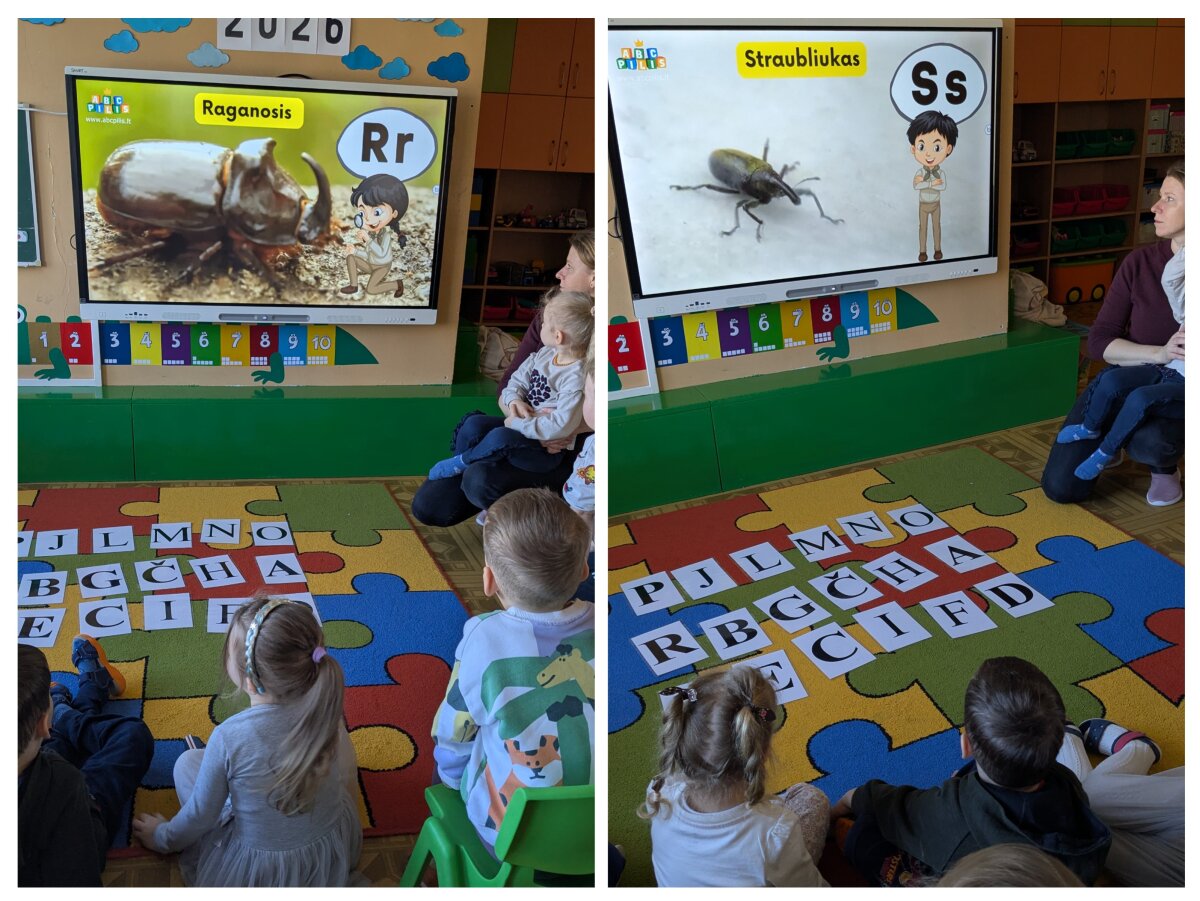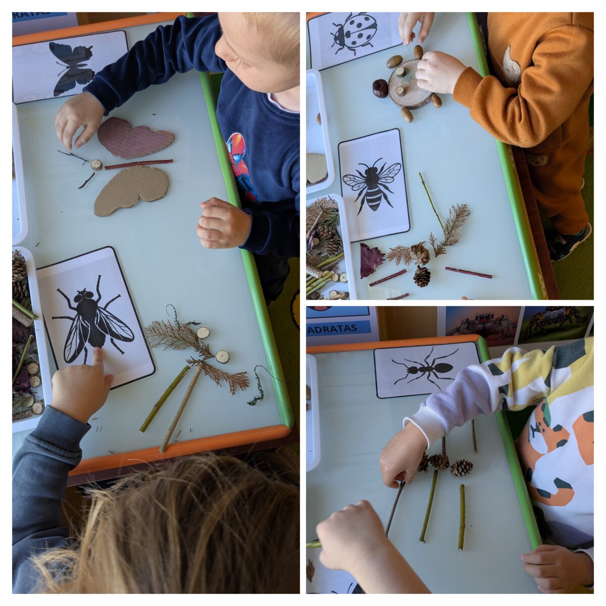 Tyrinėjimo ir gilaus mokymosi veiklose „Kas gyvena pievoje?“ vaikai naudodamiesi padidinamaisiais stiklais, mikroskopu, stebėjimo indeliais ir vabzdžių modeliais tyrinėjo įvairius pievoje gyvenančius vabzdžius. Jie stebėjo vabzdžių kūno sandarą, spalvas, dydį, sparnus, kojeles, lygino vabzdžius tarpusavyje, grupavo pagal požymius, skaičiavo dėmes ant boružių sparnelių, ieškojo panašumų ir skirtumų. Vaikai kėlė klausimus, svarstė, kur vabzdžiai gyvena, kuo minta ir kodėl jie svarbūs gamtai. Lauke jie tyrinėjo vabalų viešbučio gyventojus, stebėjo skruzdėles, ieškojo vabzdžių pievoje ir smėlyne, susipažino su tentu „Lietuvos vabalai“, mokėsi atpažinti natūralioje aplinkoje sutinkamus vabzdžius. Didelį susidomėjimą sukėlė eksperimentinė veikla su „stebuklingais“ indeliais. Vaikai, šviesdami žibintuvėliais į specialiai paruoštus indelius, stebėjo, kaip juose netikėtai „atsiranda“ vabzdžiai. Ši veikla skatino smalsumą, nuostabą ir norą tyrinėti, vaikai spėliojo, kas slepiasi viduje, kėlė hipotezes ir džiaugėsi atradę pievos gyventojus. Eksperimentas padėjo suprasti, kad tyrinėjant galima atrasti net ir tai, kas iš pirmo žvilgsnio nematoma. Kalbų įvairovės kontekste IT pagalba vaikai dalyvavo veikloje „Vabaliukų ABC“, kur vabzdžių pavadinimus siejo su abėcėlės raidėmis, įvardijo pirmąjį žodžio garsą, plėtė žodyną ir lavino kalbinį suvokimą. Veikloje „Vabalai, drugeliai, vikšrai“ vaikai susipažino su įvairiais vabzdžiais, stebėjo vaizdinę medžiagą, dalijosi savo patirtimi, pasakojo, kokius vabaliukus yra matę gamtoje, mokėsi juos atpažinti ir įvardyti. Universalaus dizaino kontekste vaikai kūrė „Vabalų namus“ – iš dėžių, pagaliukų, kankorėžių, kaštonų, giliukų ir kitų gamtinių medžiagų konstravo vabzdžių viešbutį bei modeliavo skruzdėlyną. Vaikai planavo, tarėsi, kaip išdėstyti medžiagas, ieškojo tinkamiausių sprendimų, kad vabzdžiams būtų „patogu gyventi“. Ši veikla skatino inžinerinį mąstymą, problemų sprendimą ir gebėjimą bendradarbiauti. Kūrybinių dialogų kontekste vaikai aktyviai įsitraukė į menines STEAM veiklas. Veikloje „Vikšrelis“ jie margino jau pagamintus vikšrelius flomasteriais, kūrė linijas, raštus, dėmes ir savitus ženklus. Naudodami pipetes lašino vandenį ant nuspalvinto paviršiaus ir stebėjo, kaip vikšrelis pradeda ilgėti, judėti bei keisti savo formą. Vaikai su nuostaba stebėjo šį procesą, tyrinėjo priežasties ir pasekmės ryšį, eksperimentavo bei darė netikėtus atradimus. Veikloje „Drugelis“ margino vieną drugelio sparną ir, jį suglaudę, darė simetrišką atspaudą, stebėjo formų pasikartojimą ir simetriją. Kurdami „Kirmėliuką“, naudodami pagaliukus, šenilo vielutes ir plastiliną, vaikai konstravo pūkuotus vabzdžius, lavino smulkiąją motoriką, kūrybiškumą ir vaizduotę. Judraus patyriminio ugdymo veiklose vaikai dalyvavo „Bitučių takelyje“, kur judėdami lauko aikštelėje skaičiavo bitutes, atkartojo vabzdžių judėjimą – ropojo kaip vikšreliai, skrido kaip drugeliai, šokinėjo kaip žiogai. Šios veiklos padėjo vaikams patirti mokymąsi per judesį, stiprino koordinaciją, dėmesio išlaikymą ir gebėjimą veikti pagal taisykles.