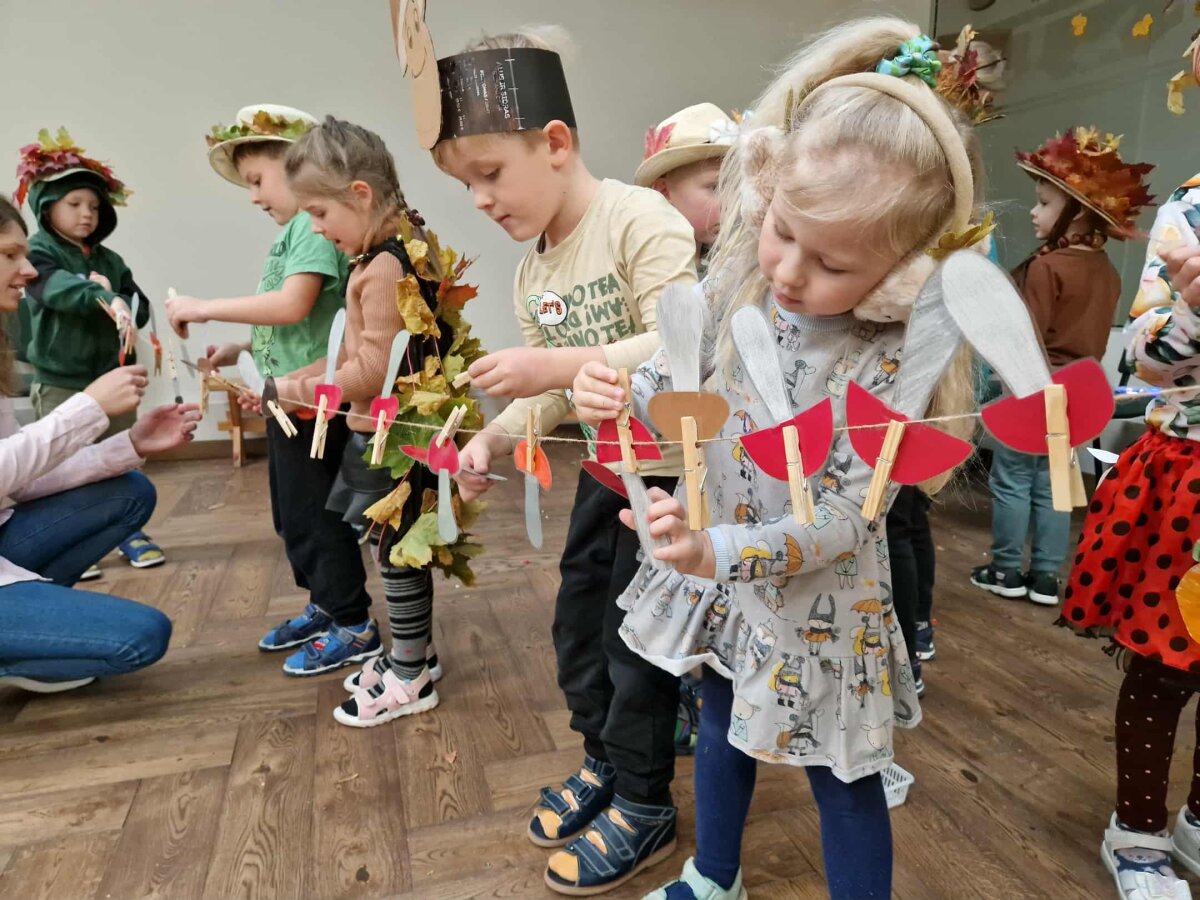Rudenėlis pakvietė vaikus pažaisti: pakabinti grybus ant virvės, surinkti spalvotus lapus, juos suskirstyti pagal spalvas, taip pat padėti surinkti ir surūšiuoti išsibarsčiusias rudens gėrybes – riešutus, kaštonus, kankorėžius. Vaikai noriai bandė įminti Rudenėlio ir Ežiuko užmintas mįsles.