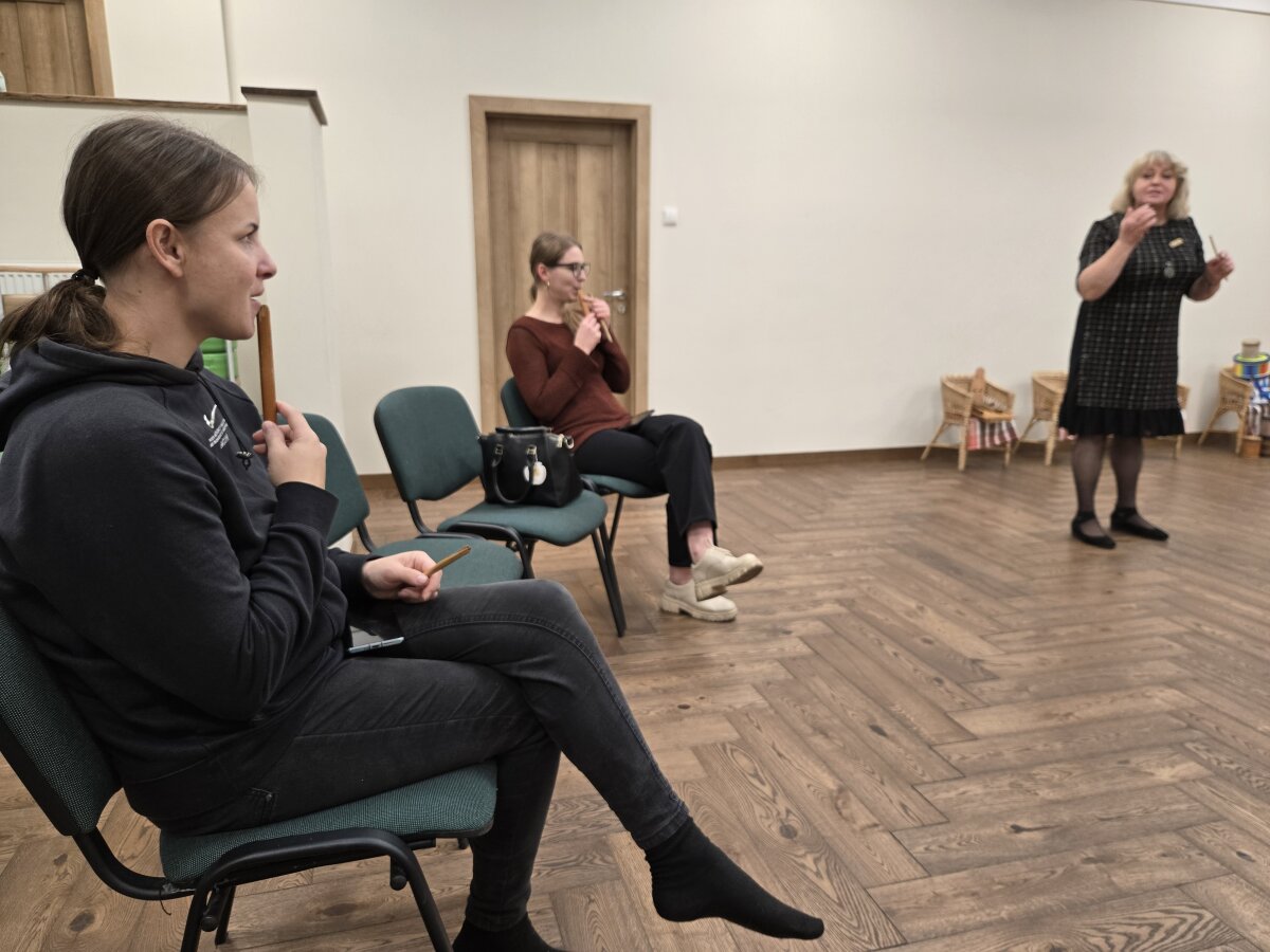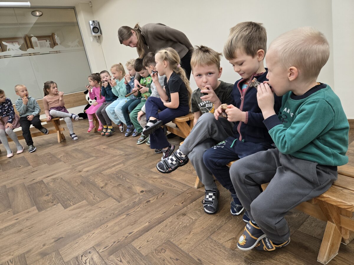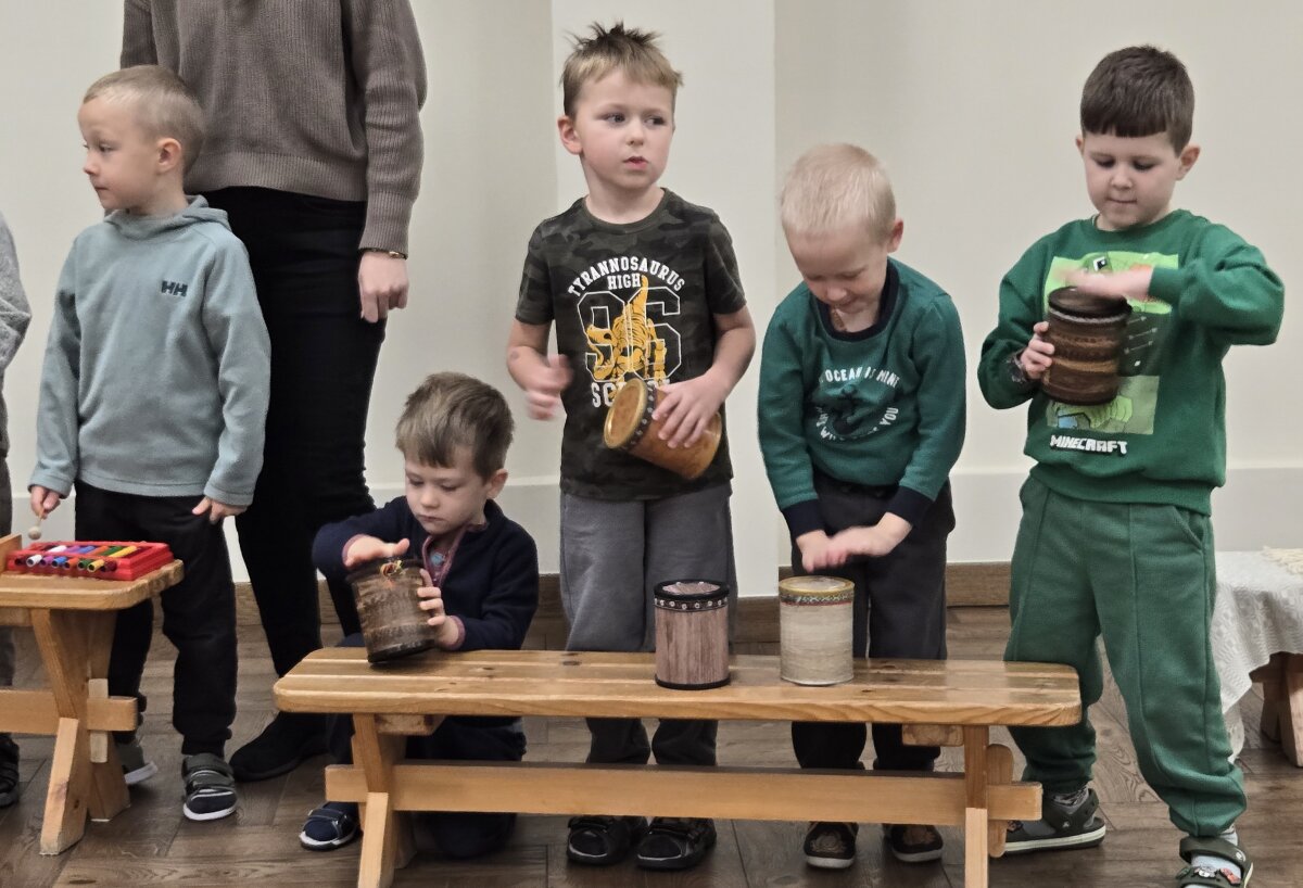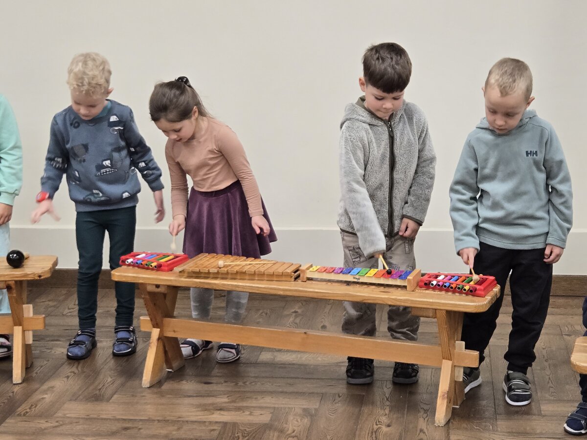 Salėje ant suolų buvo išdėlioti įvairūs vaikiški muzikos instrumentai (būgnai, barškučiai, žvangučiai, metalofonai, ksilofonai, mažieji būgneliai). Vaikai išbandė instrumentų skambesį ir tyrinėjo - iš kokios žaliavos pagamintas (medinis, metalinis, molinis, akmeninis, plastikinis, šiaudinis, mišrios sandaros), trapus ar tvirtas. Pažino ir grojo, ritmavo pagal duotus ritmikos pratimus. Dainavo dainą „Ežiukas” ir ritmiškai grodami pritarė dainai.