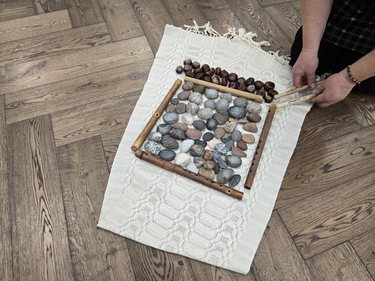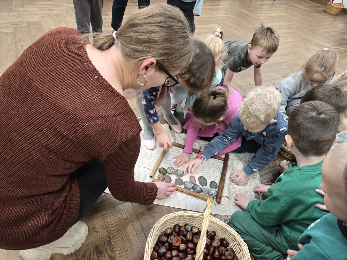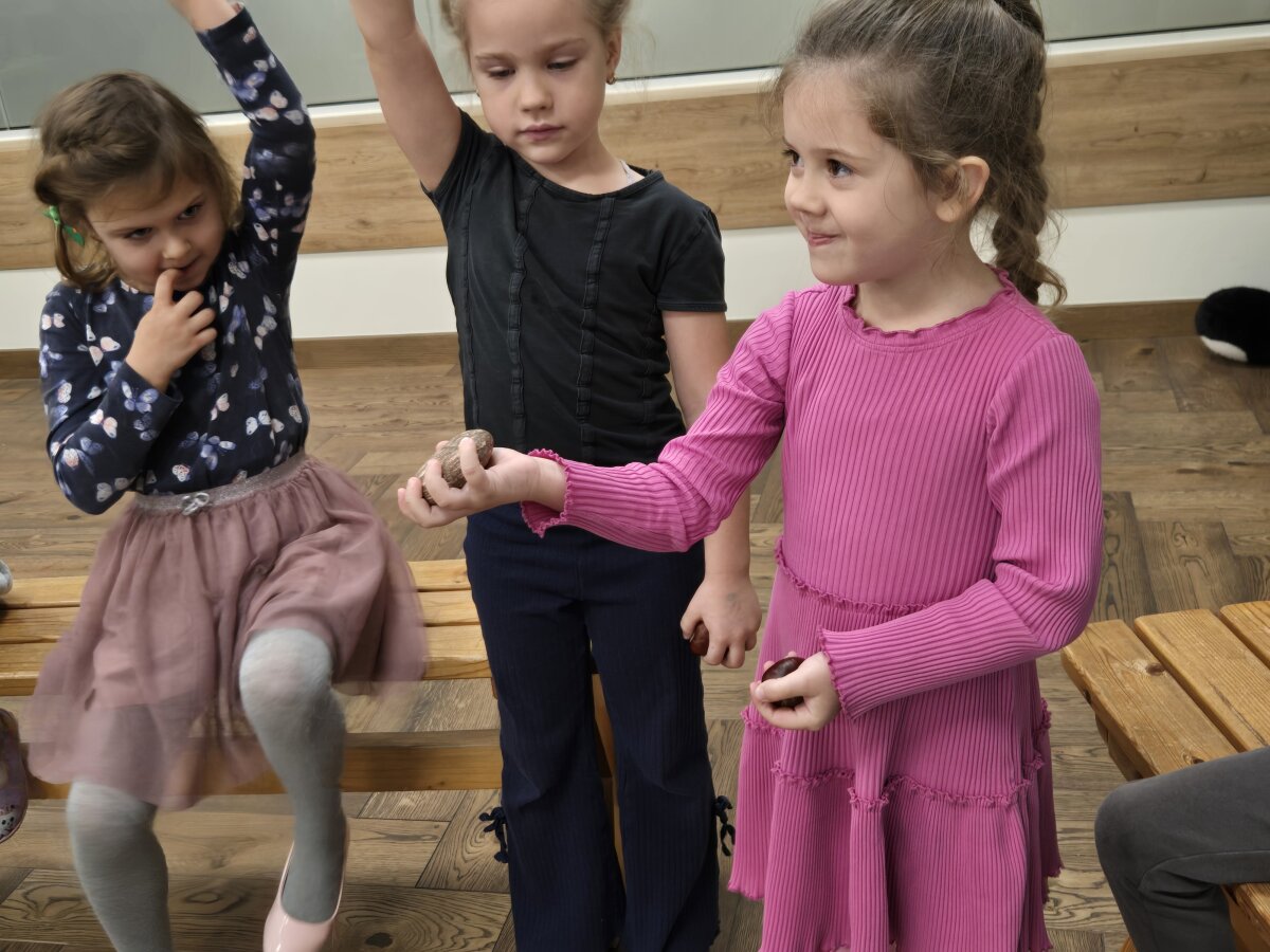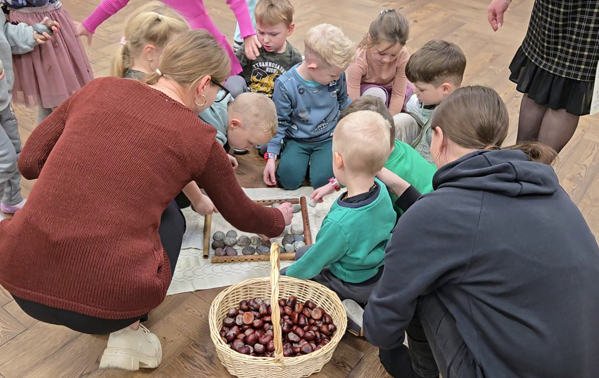 Pirmą kartą vaikai ritmavo kaštonais, o mokytoja tyliai pritarė kanklėmis. Kaštonais galima išgauti tik labai tylų garsą, negu su akmenukais. Rankytėse svėrė, svarstė – kas sunkesnis, o kas lengvesnis (nedidelis akmenukas ar kaštonas). Visiems kaštonas atrodė daug lengvesnis.