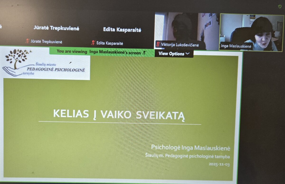 Renginį pradėjo Šiaulių miesto PPT psichologė Inga Maslauskienė, pristačiusi pranešimą „Kelias į vaiko sveikatą“. Ji pasidalijo įžvalgomis apie vaiko psichologinę ir emocinę sveikatą, akcentavo, kaip svarbu atpažinti ir suvaldyti nerimą. Psichologė pasidžiaugė, kad pastaruoju metu į PPT užsiėmimus atvykstantys vaikai, lankantys ikimokyklinio ugdymo įstaigas, žino, moka ir taiko įvairius nusiraminimo būdus – tai rodo didelį pedagogų, specialistų ir tėvų įdirbį.