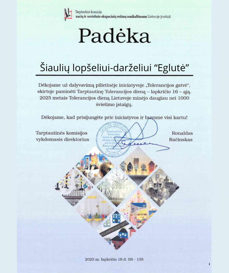 2025 m., lapkričio 16-ąją, Šiaulių lopšelis-darželis “Eglutė” kartu su Tarptautine istorine komisija surengė parodą Tolerancijos dienai paminėti, visos grupės kūrė savo namelius, kas dažė, kas karpinius klijavo, medžio raižiniais ir net blizgančiu smėliu puošė ir kitomis įvairiomis priemonėmis dekoravo. Svarbiausias šios dienos tikslas - pri(si)minti, kad visi esame skirtingi, ir tai normalu, turime priimti vienas kitą tokį, kokie esame, o šių metų Tolerancijos dienos simboliu tapo - gatvė, kuri mus jungia, suburia kaimynystėje, “padeda” susitikti, bendrauti.