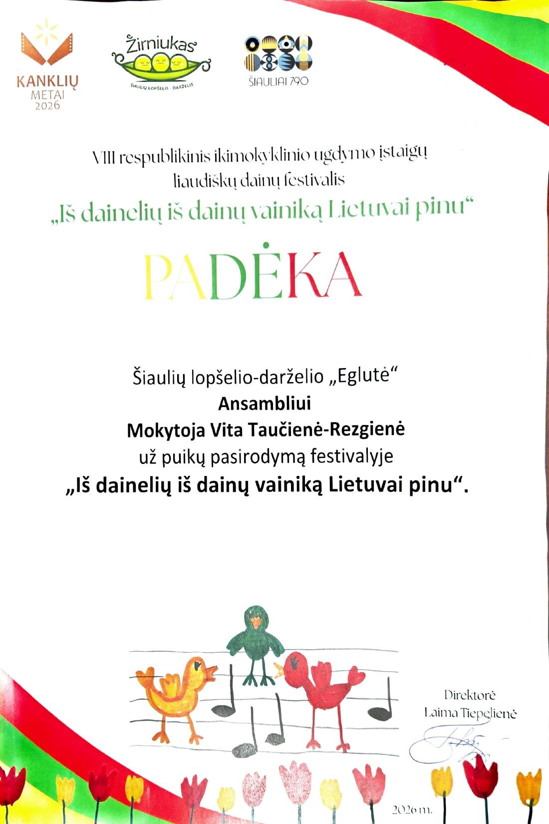Kovo 9 d. Šiaulių apskrities Povilo Višinskio bibliotekos Konferencijų salėje vyko Respublikinis ikimokyklinio ugdymo įstaigų liaudiškų dainų festivalis „Iš dainelių iš dainų vainiką Lietuvai pinu“, skirtas kanklių metams paminėti ir Šiaulių 790 gimtadieniui. Festivalio tikslas - ugdyti vaikų meninę, muzikinę kultūrą, skiepijant meilę gimtajam kraštui, liaudies dainai, kanklėms. Festivalį organizavo Šiaulių lopšelis-darželis „Žirniukas“ ir jame dalyvavo 20 kolektyvų iš Telšių, Joniškio, Radviliškio ir Šiaulių miesto (solistai, duetai, ansambliai). Dalyvavo ir mūsų darželio dainorėliai – jungtinis vokalinis ansamblis iš grupės „Žiogeliai“ bei Amelija iš grupės „Kaštoniukai“. Ugdytinius paruošė meninio ugdymo mokytoja Vita. Vaikučiai dainavo dainelę „Brolelis aptvėrė darželį“, o finale bendrame chore kartu su visais festivalio dalyviais dainavo dainą „Už žalių miškelių“. Grįžome kupini puikių emocijų, išklausę kitų vaikučių daineles ir savo dainelę gražiai padainavę. Taip pat džiaugėmės saldžiais prizais ir pieštukais.