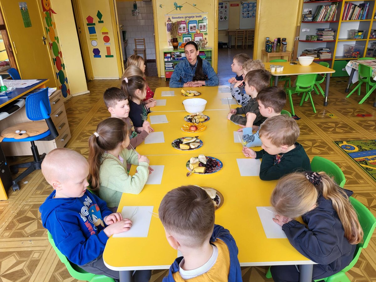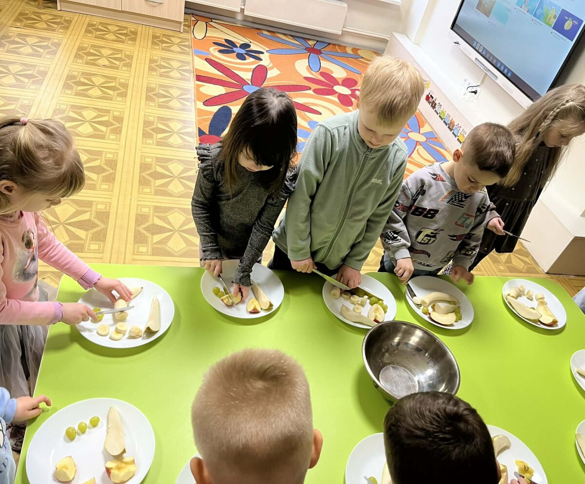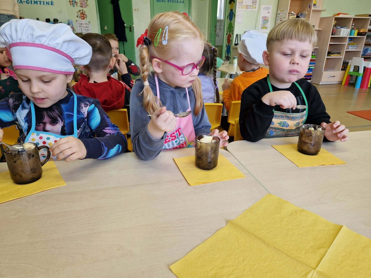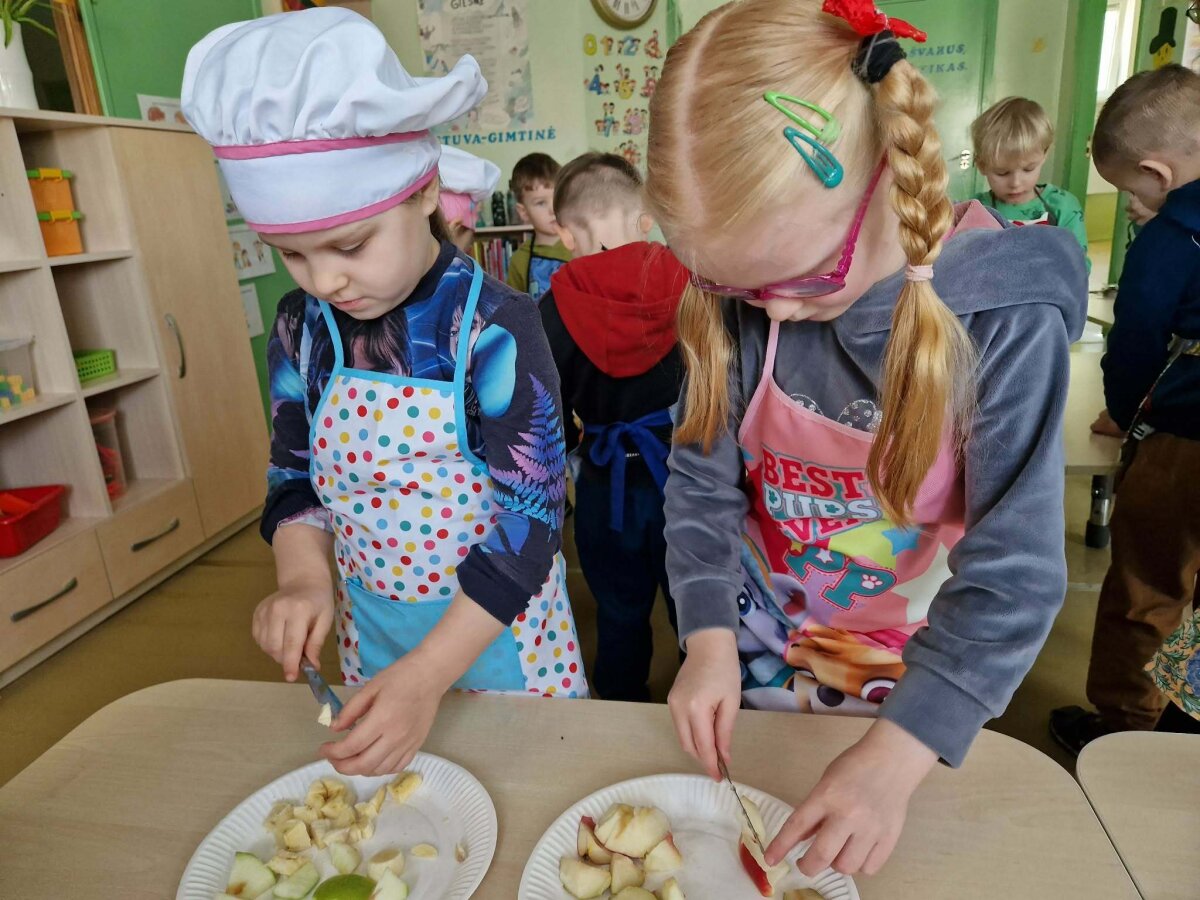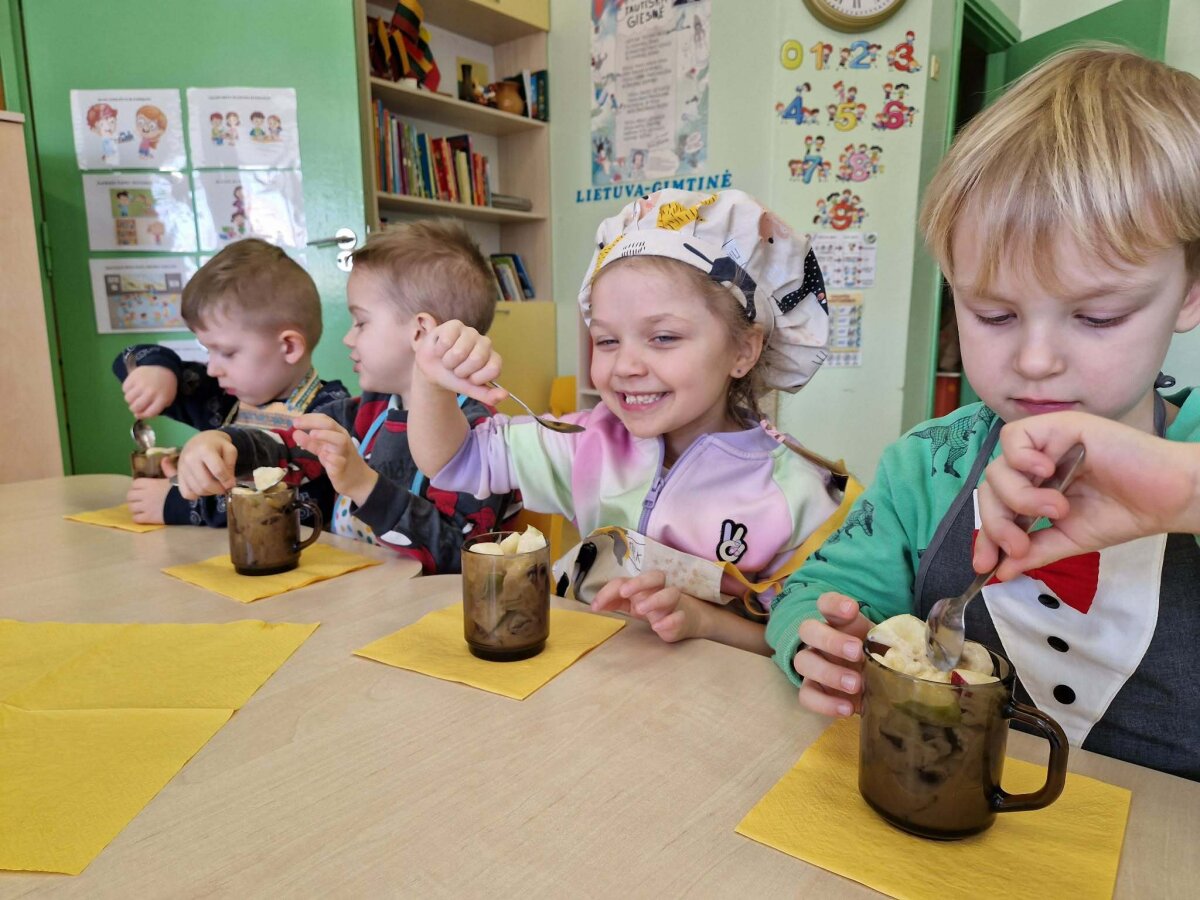„Pelėdžiukų“, „Kleviukų“, „Bitučių“, „Žiogelių“ ir „Kaštoniukų“ grupių vaikai dalyvavo smagiame ir sveikuoliškame renginyje „Vitaminų bombos salotos“. Šį kartą mažieji patys tapo tikrais virtuvės pagalbininkais – atsargiai naudodamiesi stalo įrankiais pjaustė vaisius, lupdami nuėmė jų žieveles ir ruošė spalvingas vaisių salotas. Vaikai kruopščiai dirbo, apžiūrinėjo vaisių sandarą, maišė dubenyje supjaustytus vaisius ir gardino juos jogurtu. Veiklos metu jie sužinojo, kokie vitaminai ir mineralai slypi vaisiuose bei jogurte ir kodėl sveika juos valgyti. Tokia veikla skatino vaikų savarankiškumą, atsakingumą, bendradarbiavimą, o svarbiausia – žadino smalsumą ir džiaugsmą mokantis per patirtį. Vaikai vieningai nusprendė, kad pačių pasigamintos salotos yra pačios skaniausios!
