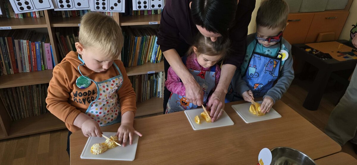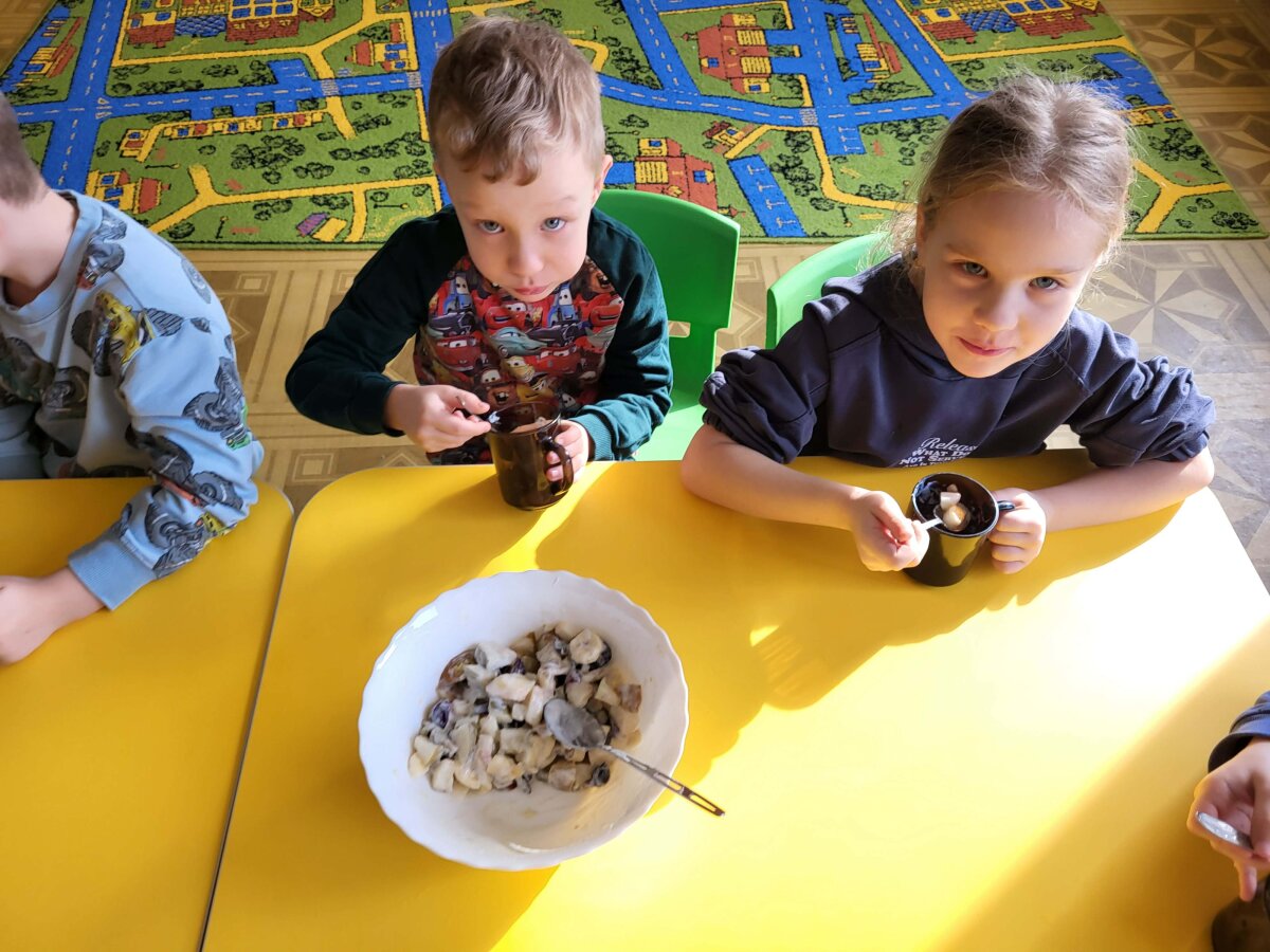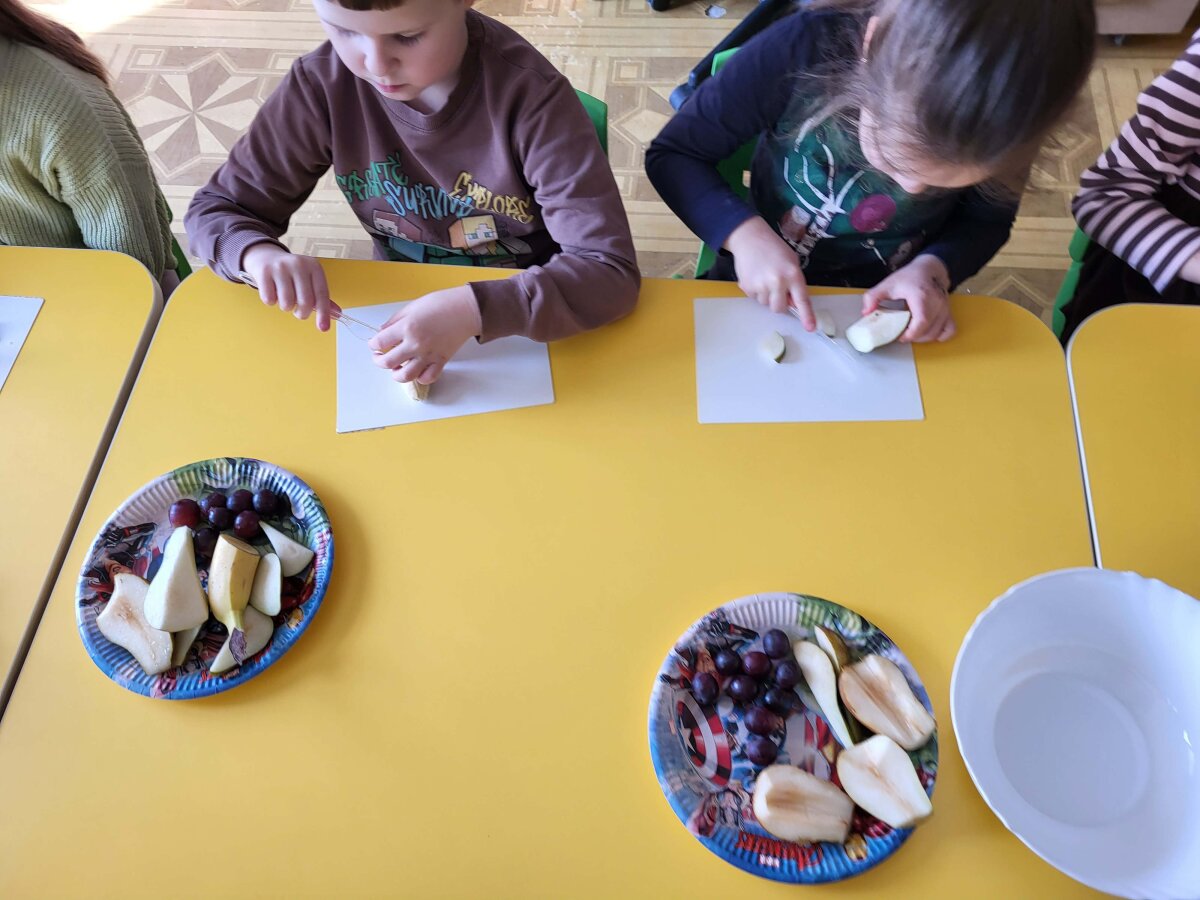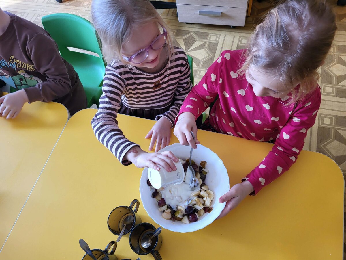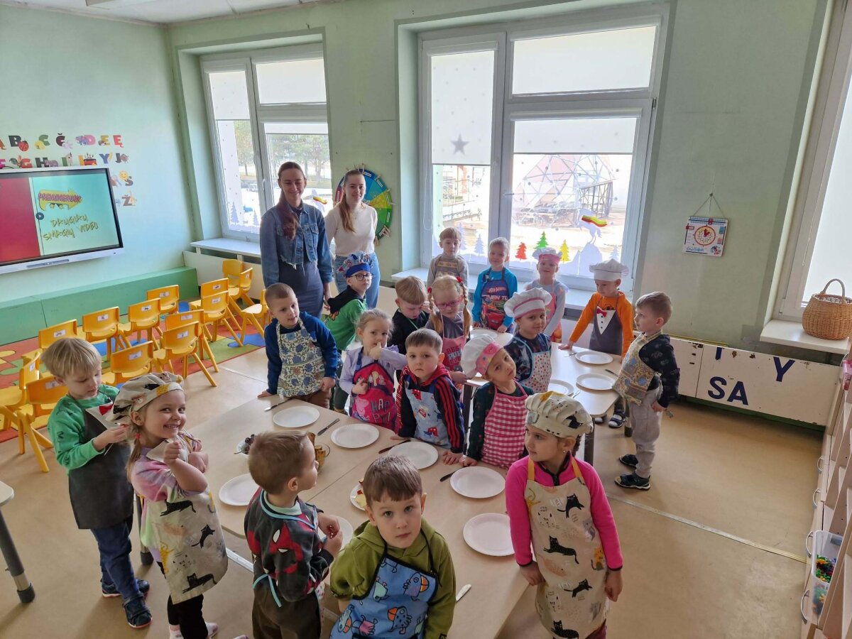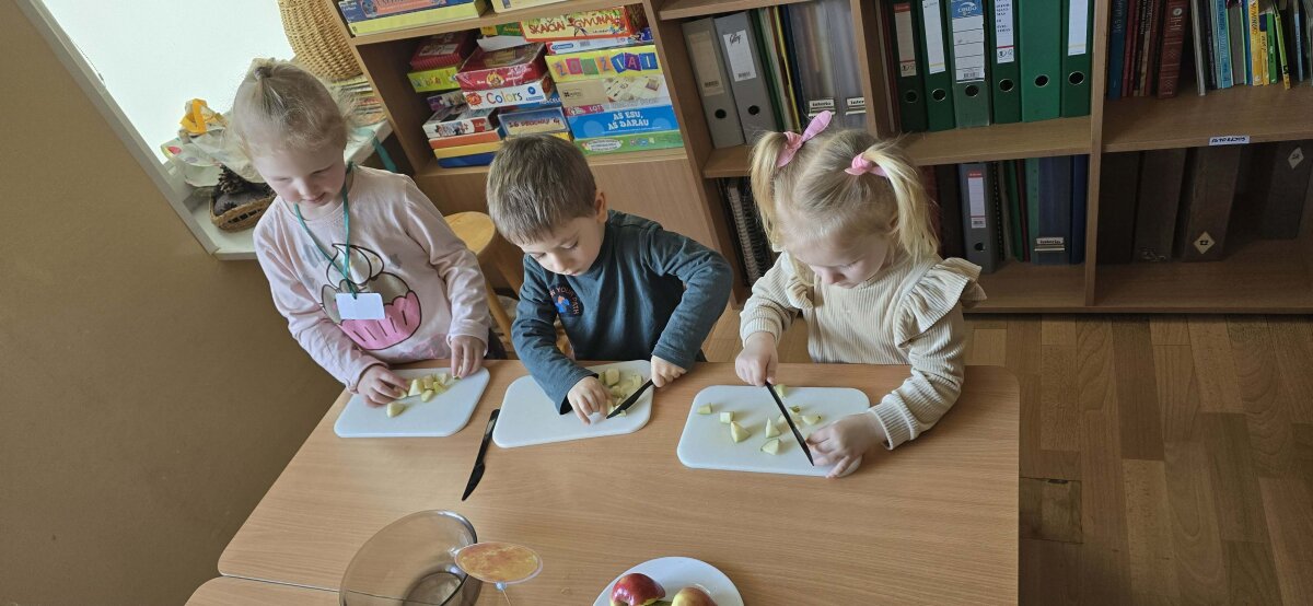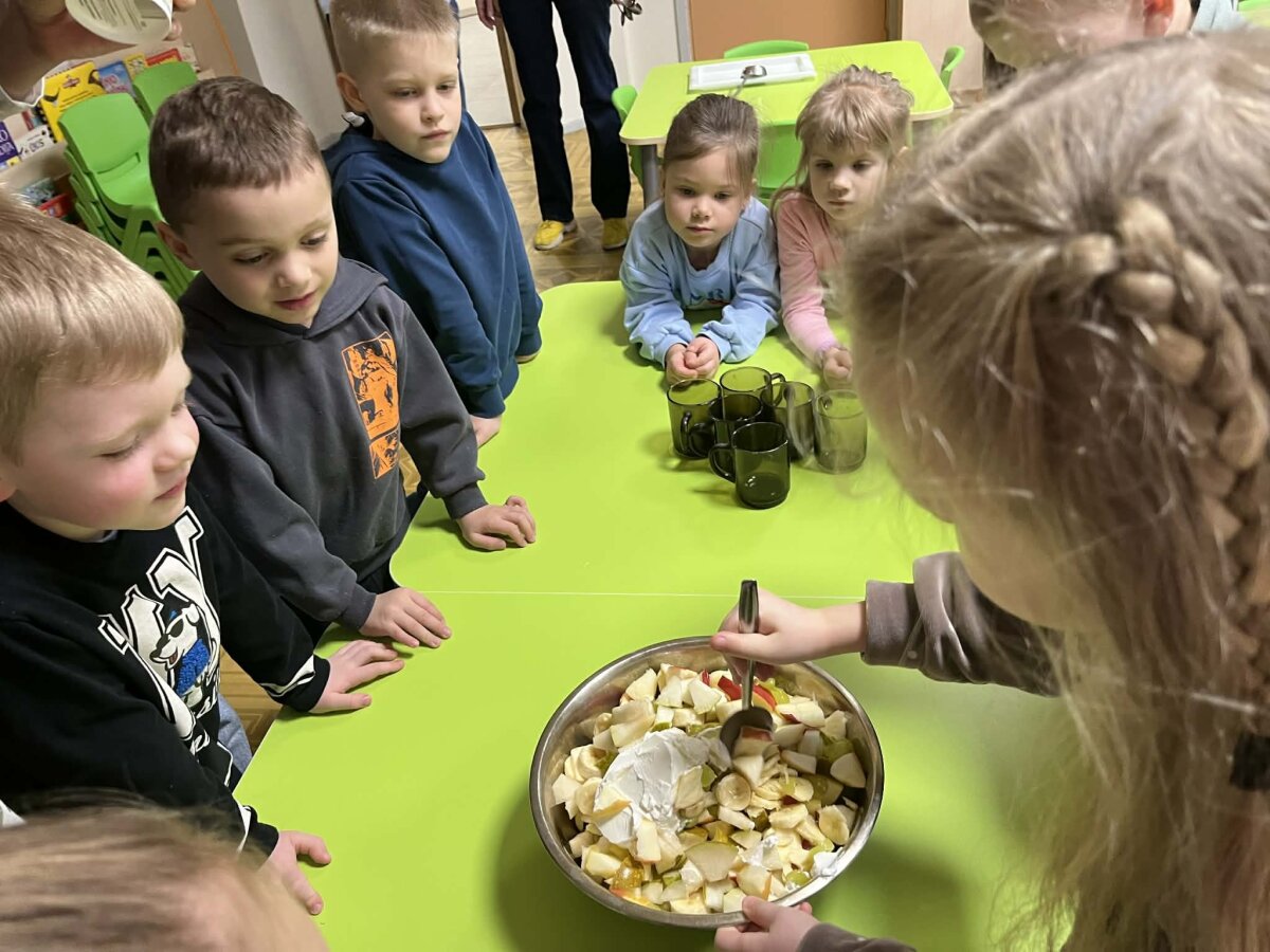 „Pelėdžiukų“, „Kleviukų“, „Bitučių“, „Žiogelių“ ir „Kaštoniukų“ grupių vaikai dalyvavo smagiame ir sveikuoliškame renginyje „Vitaminų bombos salotos“. Šį kartą mažieji patys tapo tikrais virtuvės pagalbininkais – atsargiai naudodamiesi stalo įrankiais pjaustė vaisius, lupdami nuėmė jų žieveles ir ruošė spalvingas vaisių salotas. Vaikai kruopščiai dirbo, apžiūrinėjo vaisių sandarą, maišė dubenyje supjaustytus vaisius ir gardino juos jogurtu. Veiklos metu jie sužinojo, kokie vitaminai ir mineralai slypi vaisiuose bei jogurte ir kodėl sveika juos valgyti. Tokia veikla skatino vaikų savarankiškumą, atsakingumą, bendradarbiavimą, o svarbiausia – žadino smalsumą ir džiaugsmą mokantis per patirtį. Vaikai vieningai nusprendė, kad pačių pasigamintos salotos yra pačios skaniausios!