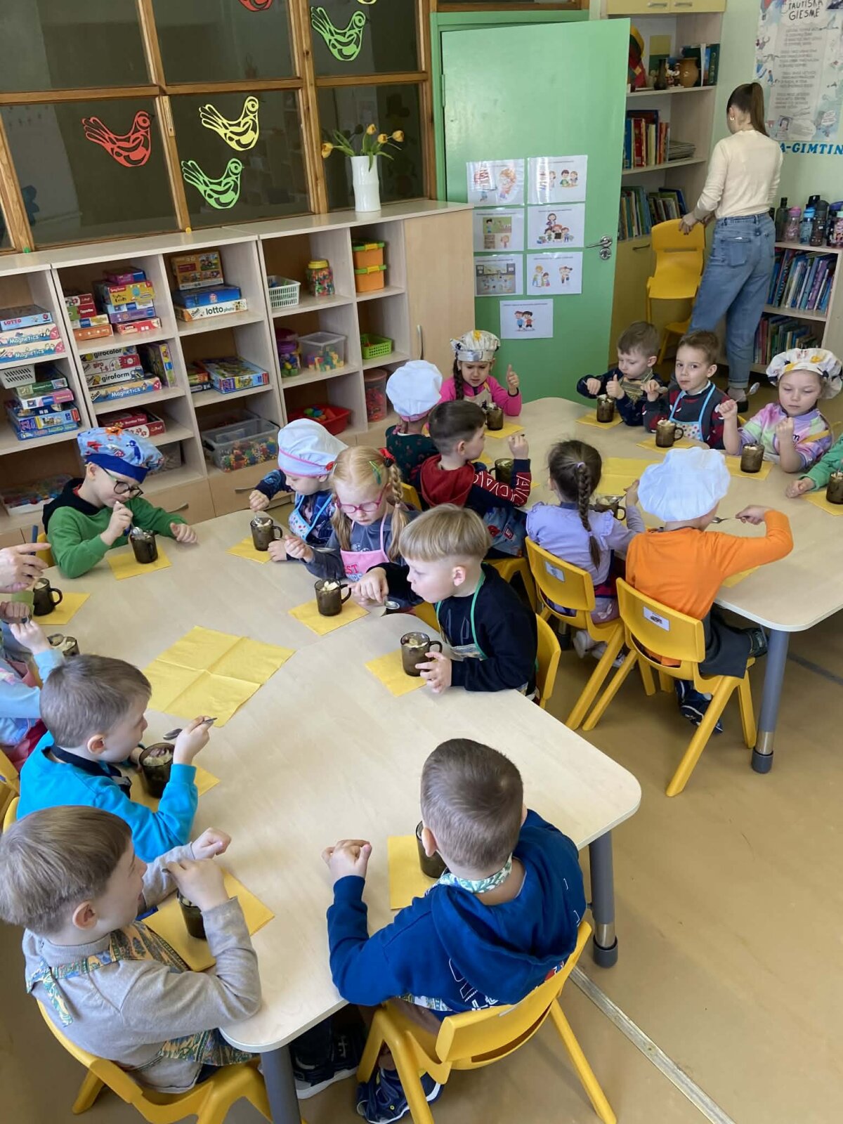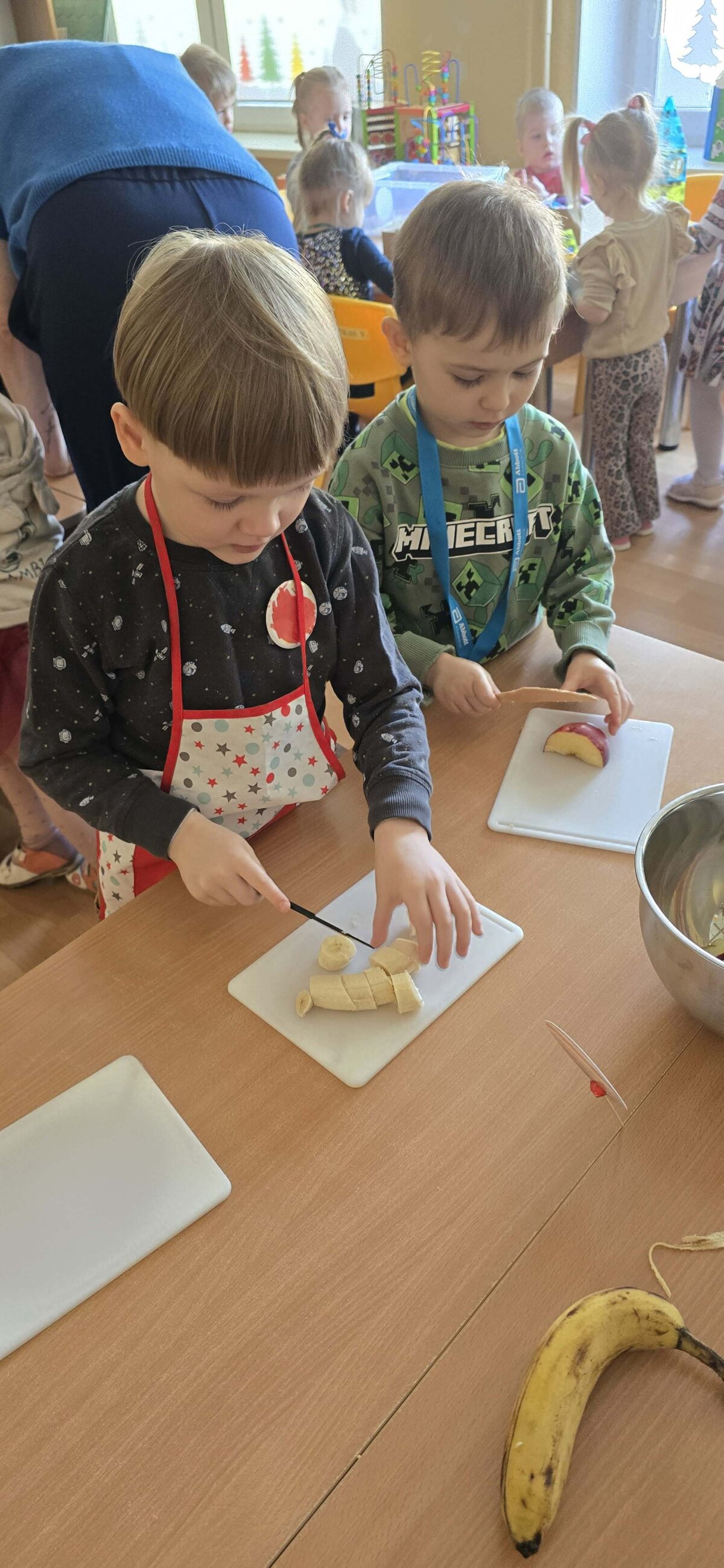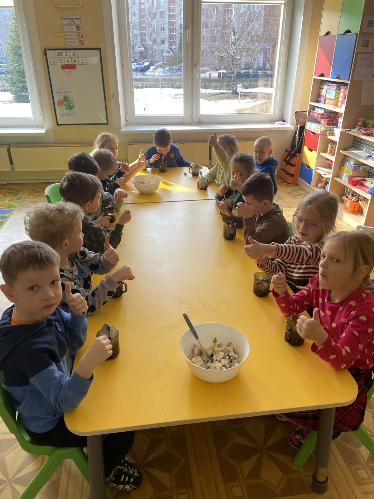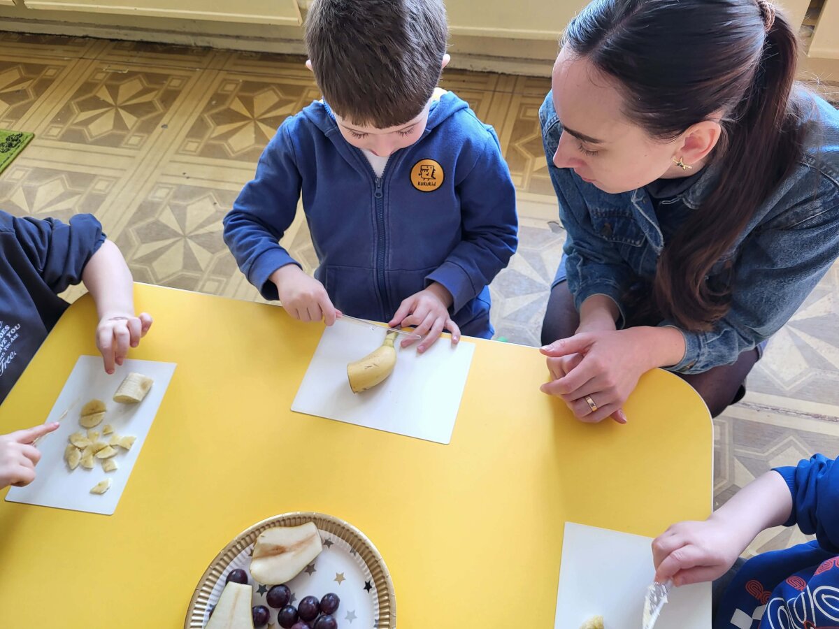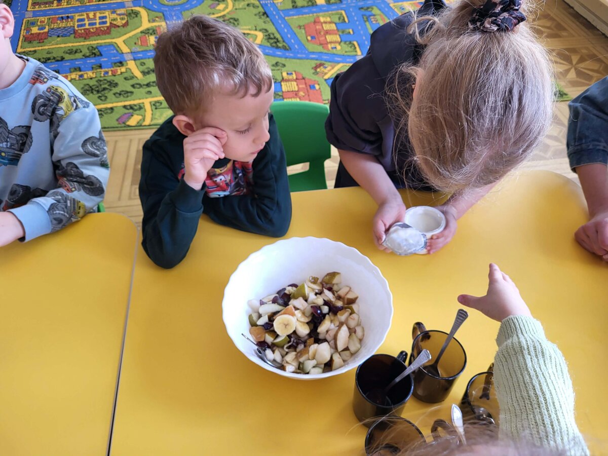 „Pelėdžiukų“, „Kleviukų“, „Bitučių“, „Žiogelių“ ir „Kaštoniukų“ grupių vaikai dalyvavo smagiame ir sveikuoliškame renginyje „Vitaminų bombos salotos“. Šį kartą mažieji patys tapo tikrais virtuvės pagalbininkais – atsargiai naudodamiesi stalo įrankiais pjaustė vaisius, lupdami nuėmė jų žieveles ir ruošė spalvingas vaisių salotas. Vaikai kruopščiai dirbo, apžiūrinėjo vaisių sandarą, maišė dubenyje supjaustytus vaisius ir gardino juos jogurtu. Veiklos metu jie sužinojo, kokie vitaminai ir mineralai slypi vaisiuose bei jogurte ir kodėl sveika juos valgyti. Tokia veikla skatino vaikų savarankiškumą, atsakingumą, bendradarbiavimą, o svarbiausia – žadino smalsumą ir džiaugsmą mokantis per patirtį. Vaikai vieningai nusprendė, kad pačių pasigamintos salotos yra pačios skaniausios!