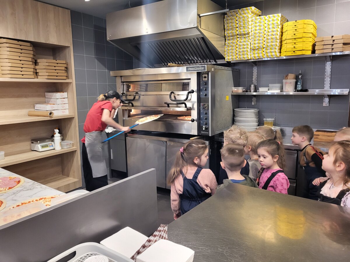 Grupės „Žiogeliai“ vaikai lankėsi Saulės mieste esančiame „Čili PIZZA“ restorane, kuriame dirba vieno vaiko mama. Edukacinės išvykos metu buvo įgyvendinta STEAM veikla, leidusi vaikams praktiškai susipažinti su maisto gamybos procesu. Vaikai stebėjo, kaip gaminamos picos – nuo tešlos paruošimo (ingredientų maišymo, proporcijų laikymosi) iki ingredientų dėliojimo ir kepimo krosnyje, taip ugdydami gamtos mokslų ir matematikos pradmenis.