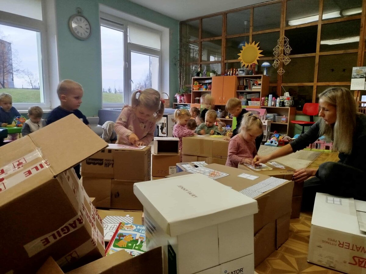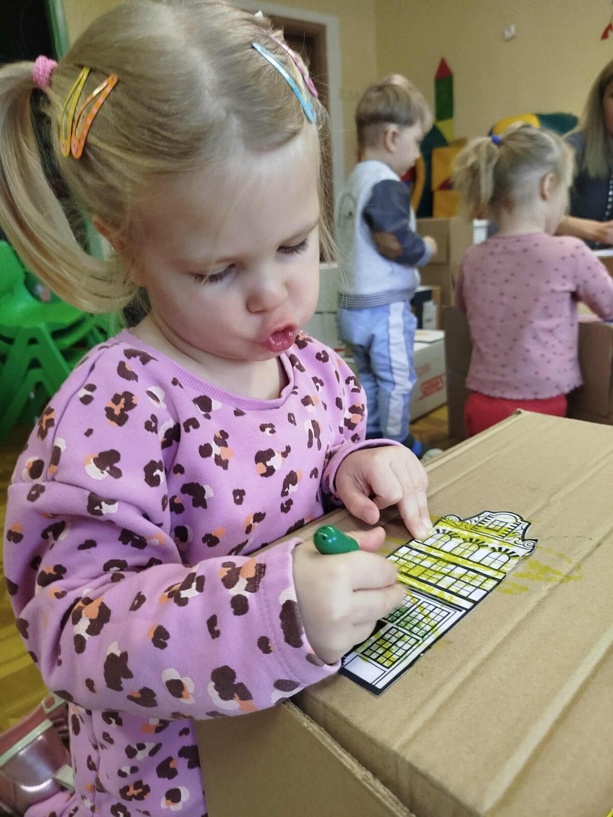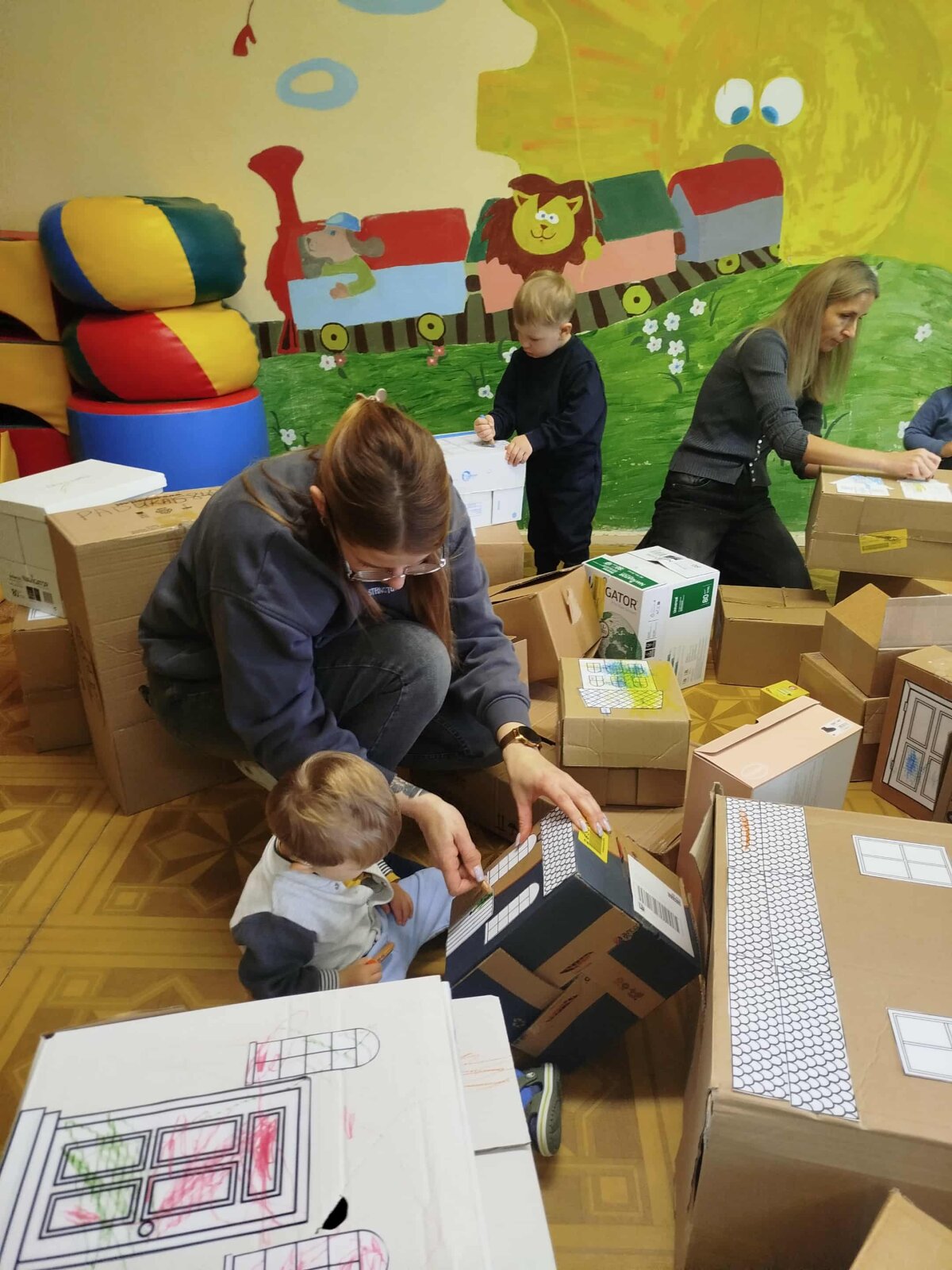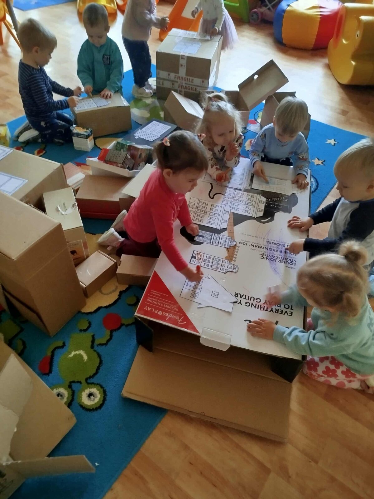 Statybų procese vaikai ne tik derino dėžių dydžius, bet ir lavino kūrybiškumą. Jie rinkosi spalvas, piešė langus, duris, stogą. Kai namai buvo baigti, vaikai pradėjo juos dėlioti į bendrą erdvę, taip pamažu kurdami savo pačių „miestą“.