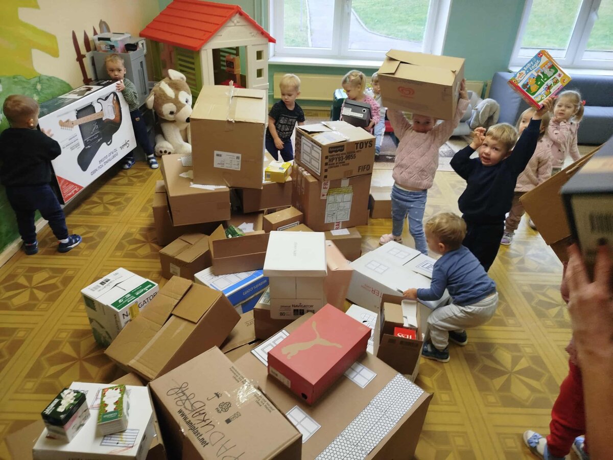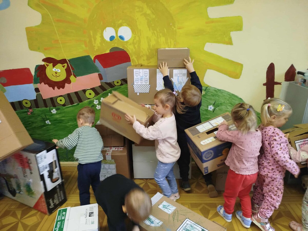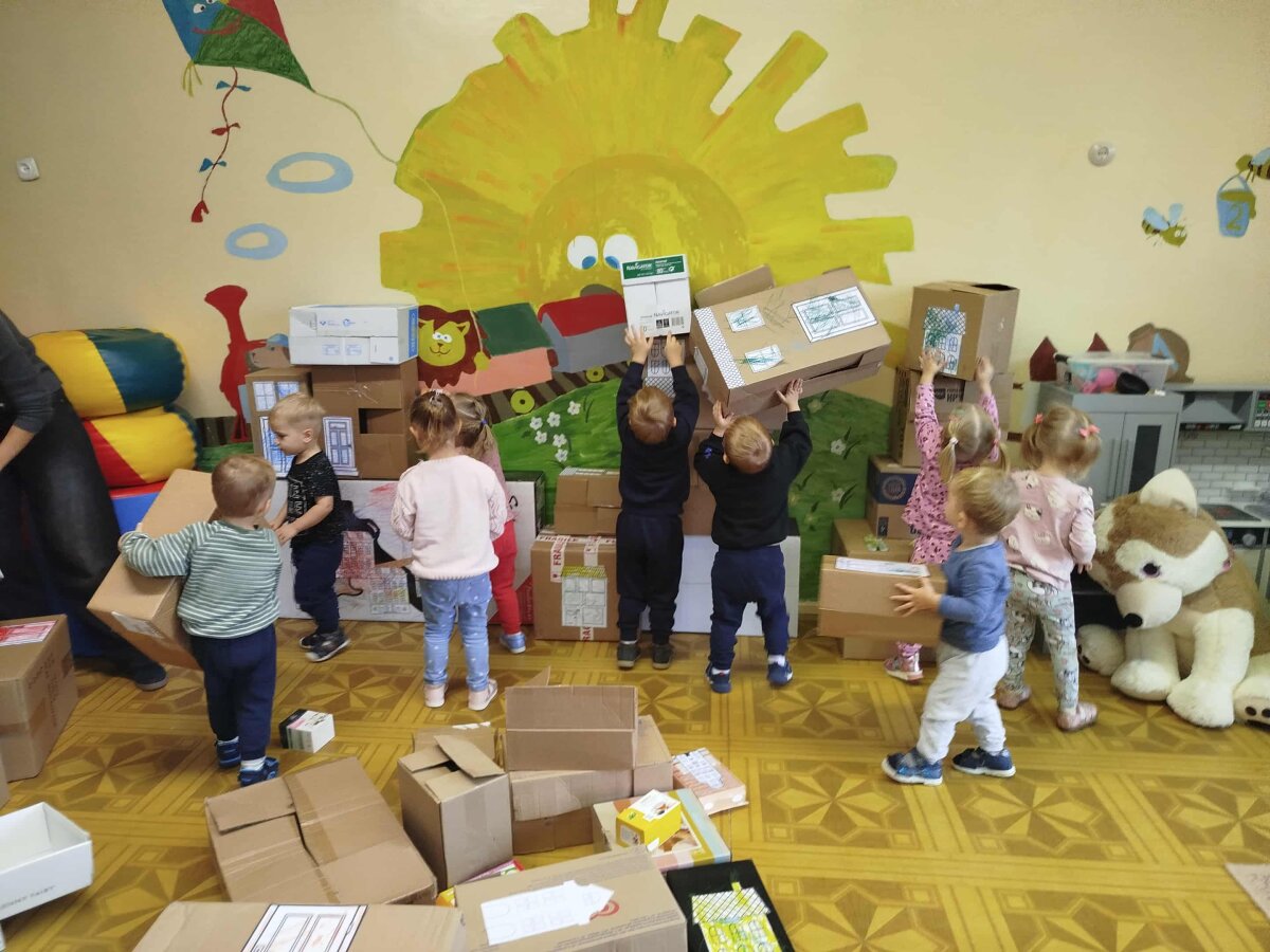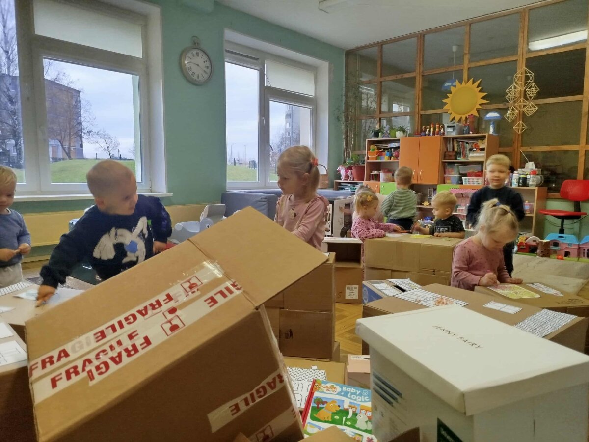 Statybų procese vaikai ne tik derino dėžių dydžius, bet ir lavino kūrybiškumą. Jie rinkosi spalvas, piešė langus, duris, stogą. Kai namai buvo baigti, vaikai pradėjo juos dėlioti į bendrą erdvę, taip pamažu kurdami savo pačių „miestą“.