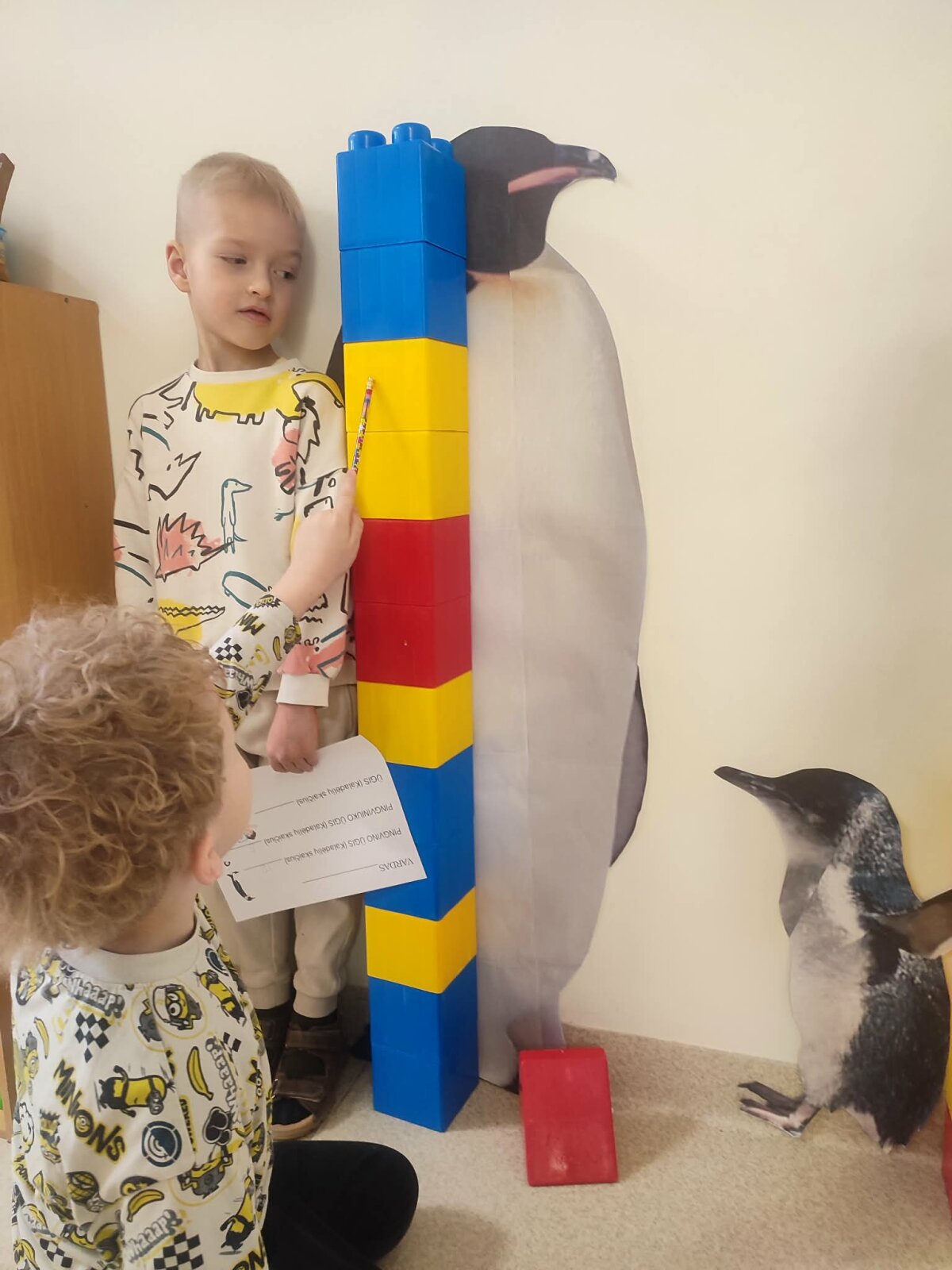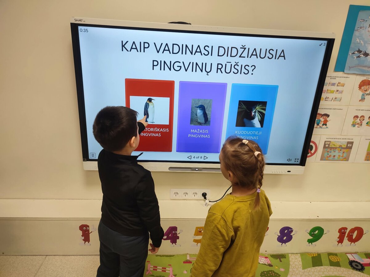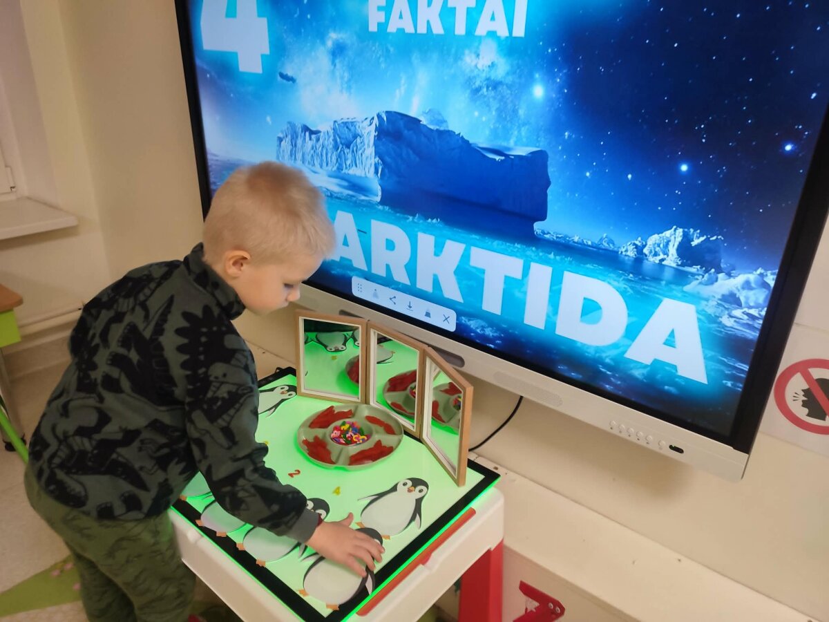 2026 m. sausio 12–16 dienomis grupėje „Riešutėliai“ buvo įgyvendintas trumpalaikis projektas „Pingvinų pasaulis: STEAM atradimai“. Projektą vykdė ikimokyklinio ugdymo mokytojos Vaida Vaičiuvienė ir Sandra Tamašauskaitė, mokinio padėjėja Asta Kliminskienė, mokytojo padėjėja Erika Šeškevičienė, bendradarbiaujant su ugdytinių šeimomis. Projekto tikslas – per STEAM veiklas ugdyti vaikų matematinį mąstymą ir skaitmeninį sumanumą, sudarant sąlygas patyriminiu ir tiriamuoju būdu pažinti pingvinų pasaulį bei Antarktidos aplinką, skatinti vaikų smalsumą, aktyvų įsitraukimą ir bendradarbiavimą. Visą savaitę vaikai leidosi į pažintinę kelionę po Antarktidą. Jie susipažino su pingvinų gyvenimo ypatumais, žiūrėjo vaizdo medžiagą, klausėsi pingvinų skleidžiamų garsų, kėlė klausimus ir dalijosi savo spėjimais. Tyrinėdami vaikai aiškinosi, kodėl pingvinai nesušlampa ir nesušąla, atliko paprastus eksperimentus, stebėjo vandens savybes, darė išvadas ir mokėsi mąstyti priežasties–pasekmės ryšiais. Matematinėse veiklose vaikai rideno kauliuką, skaičiavo išridentus taškelius, ieškojo atitinkamo kiekio žuvyčių ir „maitino“ pingvinus. Jie atliko sudėties ir atimties veiksmus, sprendė paprastas užduotis, lygino kiekius, stiprino darbinę atmintį, kai reikėjo įsiminti skaičių, užduoties sąlygą ir nuosekliai ją atlikti. Vaikai žaidė stalo žaidimą „Pingvinų bingo“, kuriame atpažino skaičius, skaičiavo ir lygino kiekius. Ant šviesos stalo jie dėliojo skaičius ir prie jų parinko atitinkamą žuvyčių skaičių, taip vizualiai susiedami skaitmenį su kiekiu ir įtvirtindami skaičiavimo įgūdžius. Didelis dėmesys buvo skiriamas skaitmeniniam ugdymui. Vaikai atliko užduotis SMART lentoje ir planšetėse, žaidė edukacinius žaidimus, programavo „Bee-Bot“ bitutę, planuodami jos kelią iki pingvinų. Skaitmeninės priemonės skatino vaikų motyvaciją, savarankiškumą, gebėjimą veikti nuosekliai ir tikslingai. Kūrybinėse veiklose vaikai lipdė pingvinus, konstravo Antarktidos erdves iš įvairių medžiagų, kūrė sniego, ledo ir gyvūnų pasaulį. Kurdami jie laisvai reiškė idėjas, derino spalvas, formas, eksperimentavo, mokėsi planuoti ir užbaigti pradėtą darbą. Ypatingas dėmesys buvo skiriamas bendradarbiavimui, vaikai mokėsi tartis, dalintis priemonėmis, padėti vieni kitiems, dirbti porose ir grupėse. Tėvai tapo aktyviais projekto dalyviais ir partneriais ugdymo procese. Kartu su vaikais namuose jie rinkosi Antarktidoje gyvenančius gyvūnus, juos piešė, spalvino, kirpo pagal ištrauktą skaičiaus kortelę ir kūrė individualius darbelius. Sugrįžę į darželį vaikai kartu su tėvais priklijavo sukurtus gyvūnus ant grupės rūbinėje pakabinto Antarktidos žemėlapio, taip paversdami jį bendru visos bendruomenės kūriniu. Ši veikla stiprino vaikų ir tėvų tarpusavio ryšį, skatino domėjimąsi vaiko ugdymu, ugdė atsakomybę, kūrybiškumą ir bendruomeniškumo jausmą. Projektas sudarė sąlygas vaikams mokytis per patirtį, žaidimą ir tyrinėjimą, ugdė jų smalsumą, kūrybiškumą, problemų sprendimo gebėjimus, matematinį mąstymą, atmintį ir skaitmeninį raštingumą. „Pingvinų pasaulis“ tapo erdve, kurioje vaikai ne tik įgijo žinių, bet ir patyrė atradimo džiaugsmą, mokėsi bendradarbiauti ir augo kaip smalsūs, aktyvūs tyrinėtojai.